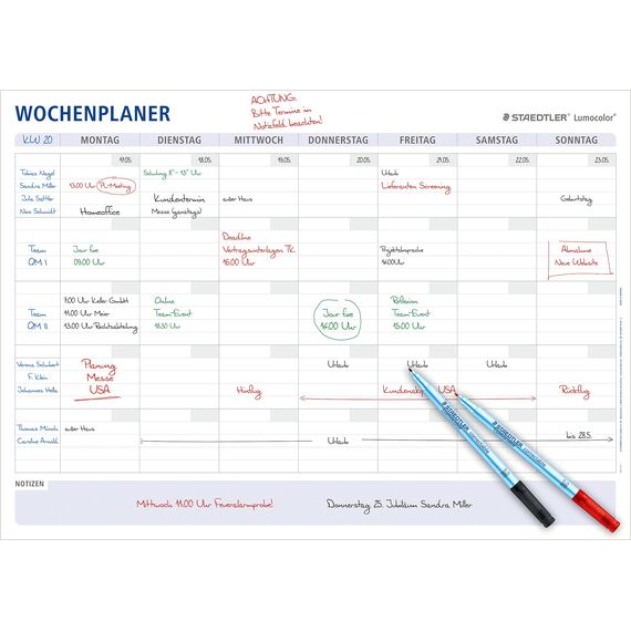 STAEDTLER Wochenplaner Lumocolor, wiederverwendbar, trocken abwischbar, Grösse DIN A1, im Set mit 2 Stiften Lumocolor correctable M rot, schwarz und 2 Stiftklemmen, 641 A1-1