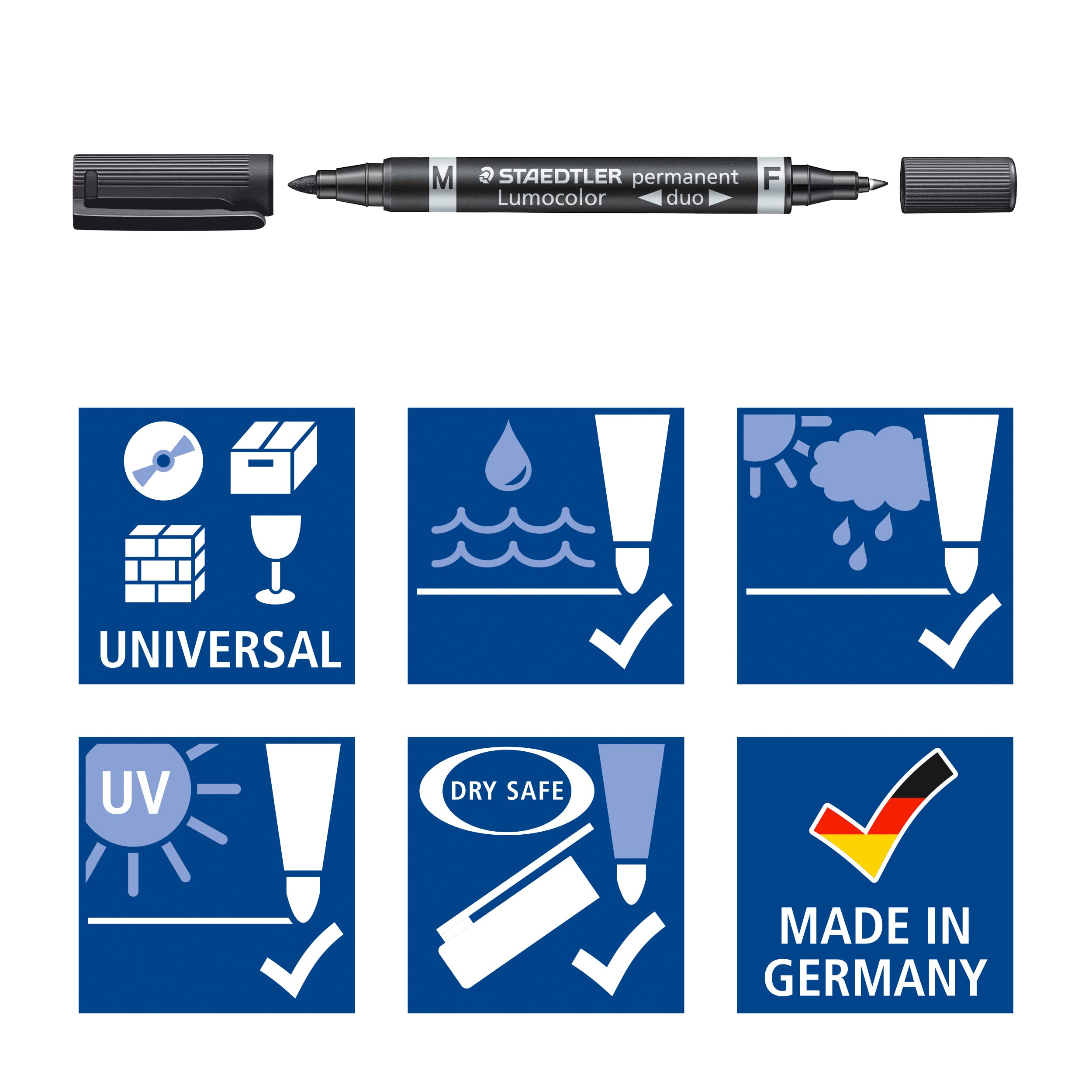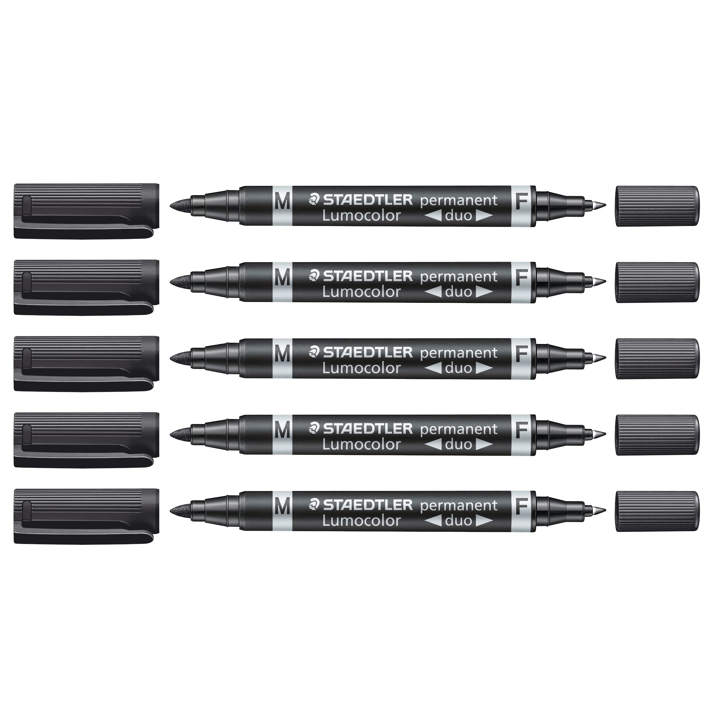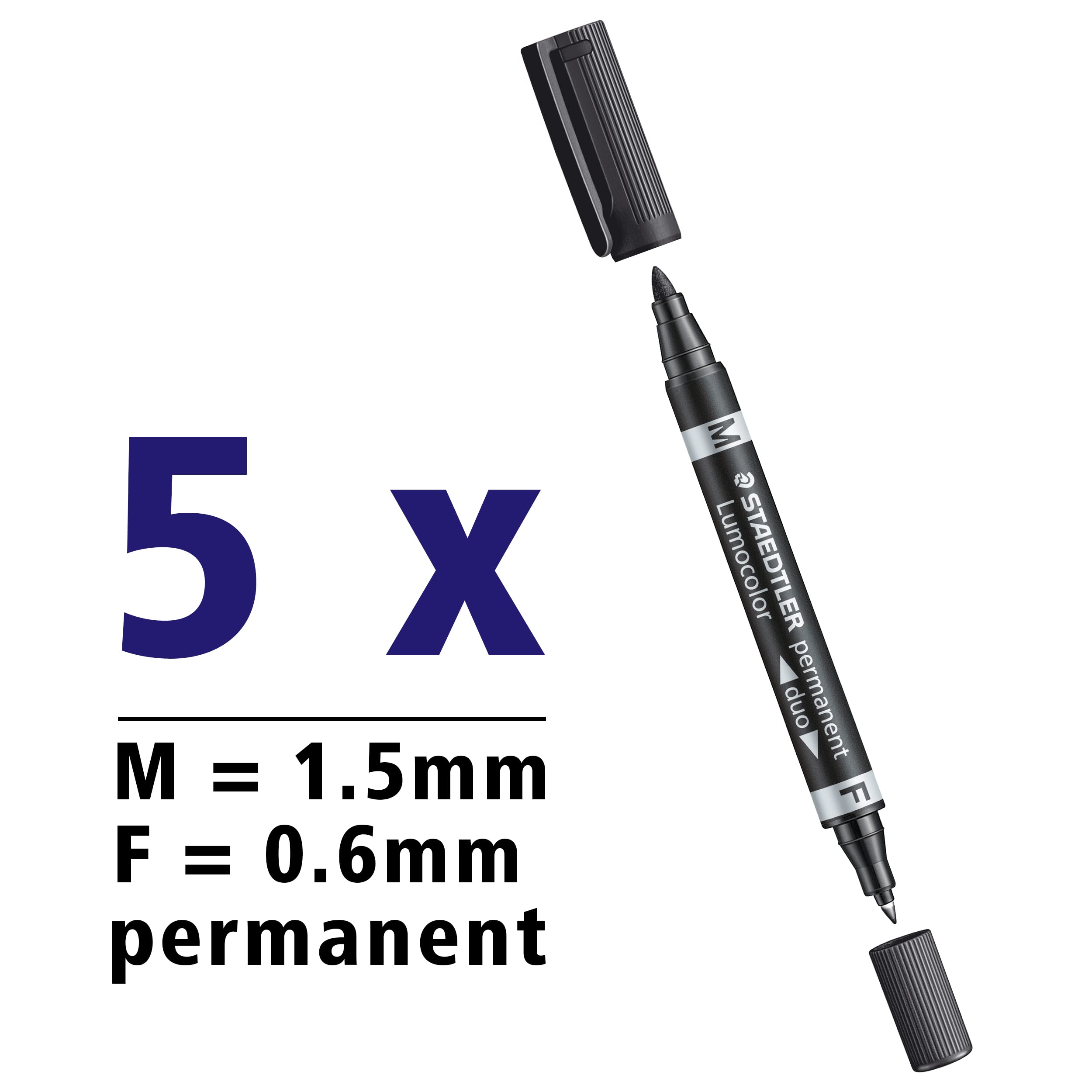 STAEDTLER Permanentmarker Lumocolor permanent duo, Marker mit feiner und medium Rundspitze, wisch- und wasserfest, schnelltrocknend, nachfüllbar, lange Lebensdauer, 5 schwarze Marker, 348-9X