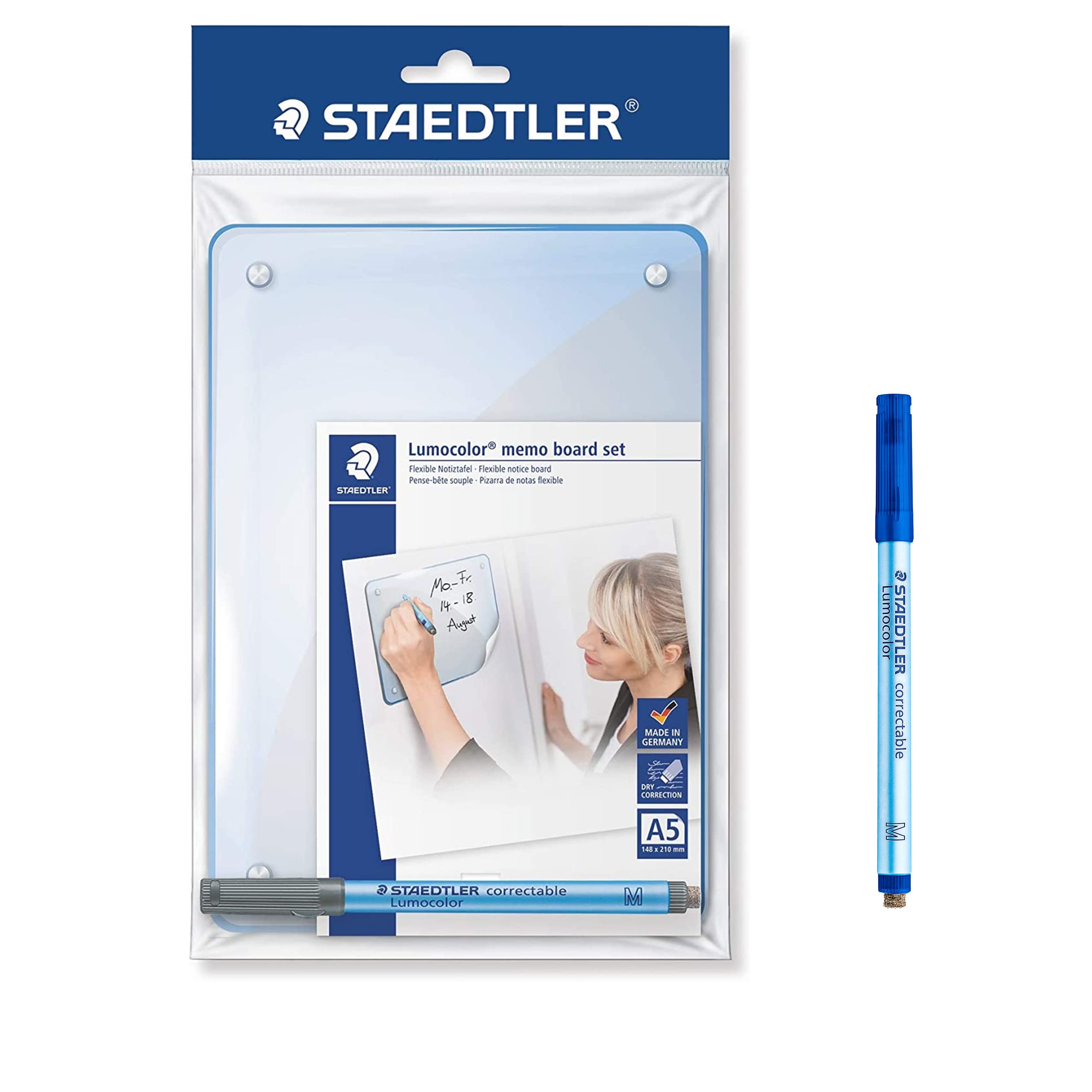 STAEDTLER Memoboard Lumocolor, selbsthaftend und wiederverwendbar, trocken abwischbar, inkl. Lumocolor correctable blau und schwarz, Stiftklemme