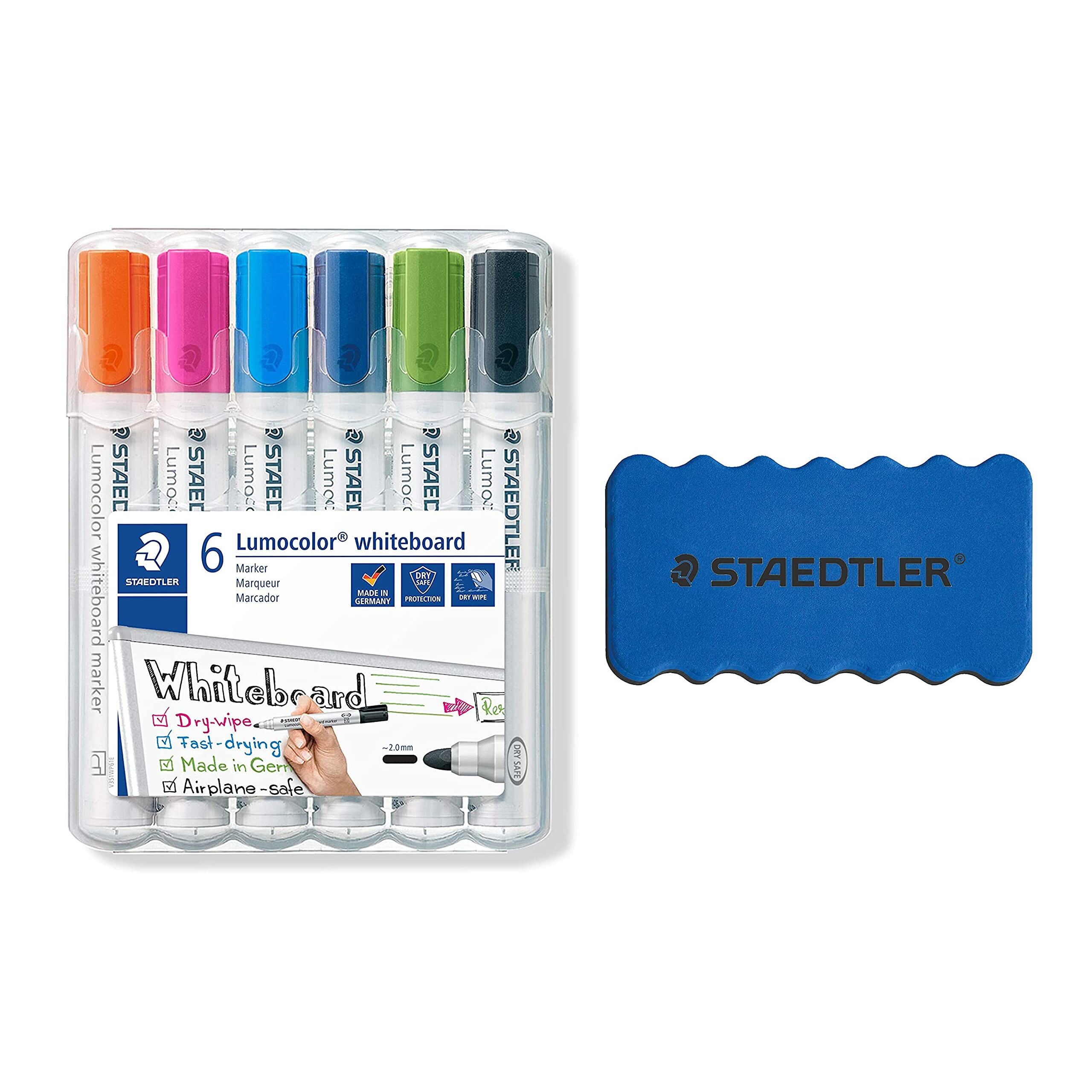 STAEDTLER whiteboard Marker Lumocolor, Linienbreite 2,00 mm, schnelltrocknend, geruchsarm, lange Lebensdauer, blockierte Spitze, 6 whiteboard Marker in aufstellbarer STAEDTLER box (6 Marker + Löscher)