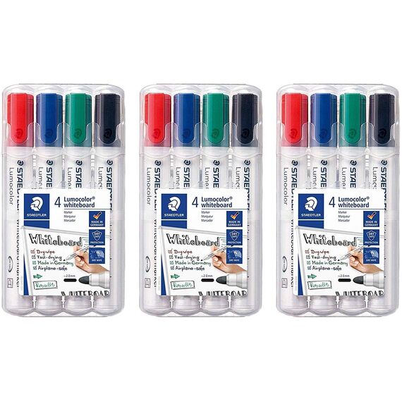 Staedtler Lumocolor 351 WP4 Whiteboard-Marker (Rundspitze ca. 2 mm Linienbreite, Set mit 4 Farben (4er Marker Set | 3 Stk, farbsortiert)