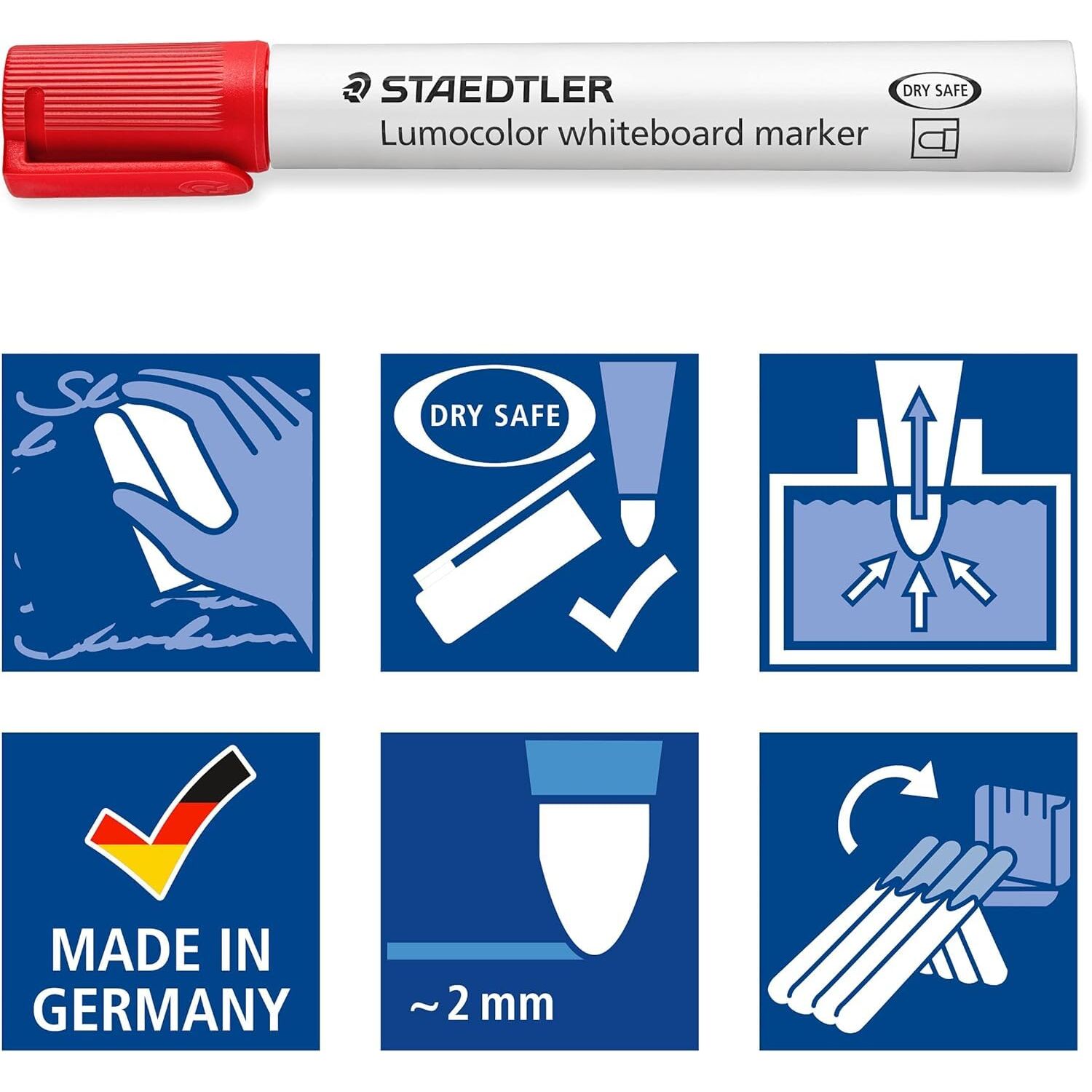 Beliebt im Büro, in der Uni und in der Schule. Mit geruchsarmer, xylol- und toluolfreier Tinte. DRY SAFE - kann tagelang offen liegen ohne einzutrocknen. Der PP-Schaft und Kappe garantieren eine lange Lebensdauer. Die Marker können mit der STAEDTLER-Tankstelle 488 51 einfach nachgefüllt werden. Mit dem Whiteboard Schwamm können Marker Abstriche trocken und rückstandsfrei von Whiteboards entfernt werdeninklusive Whiteboard Schwamm