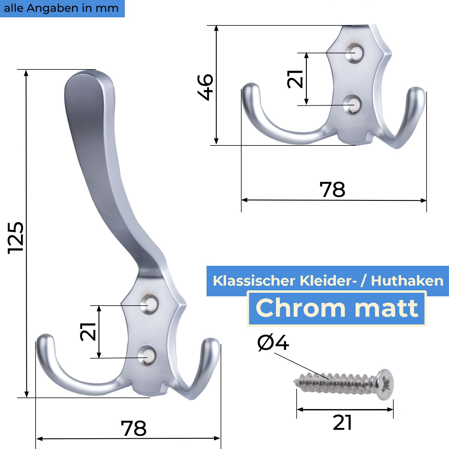 Stahlia Garderobenhaken CHROM-MATT (1 Stück) Haken zum Schrauben vintage Kleiderhaken Garderobe LANG Haken für Garderobe Metallhaken