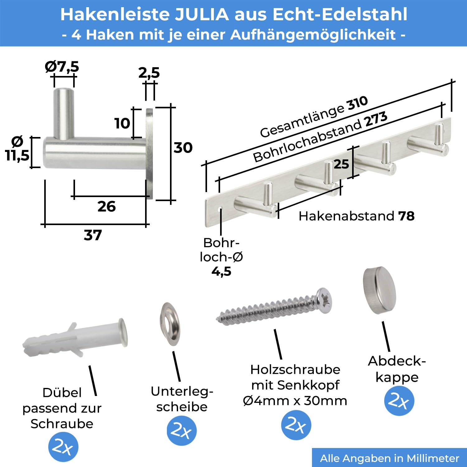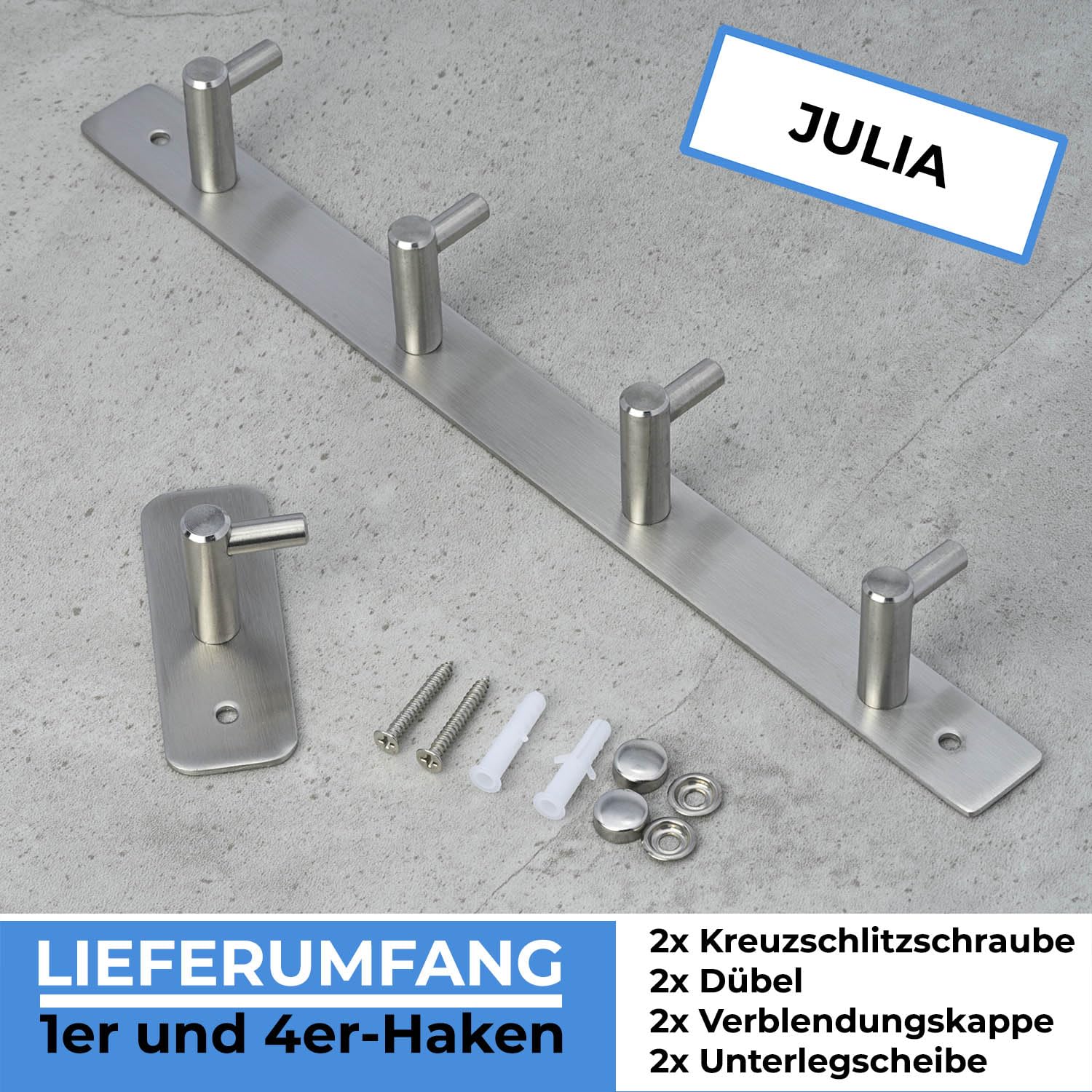 Stahlia Hakenleiste EDELSTAHL gebürstet Garderobenleiste 4x Haken (L: 310mm) Modell:JULIA Wandgarderobe mit 1/4/6/8/10 Kleiderhaken Garderobenhaken Wandhaken