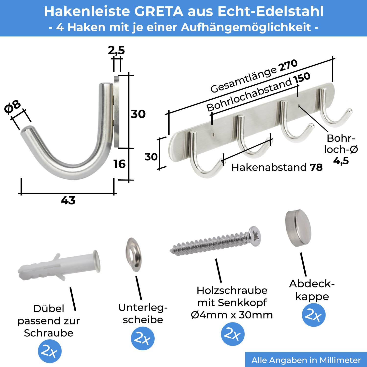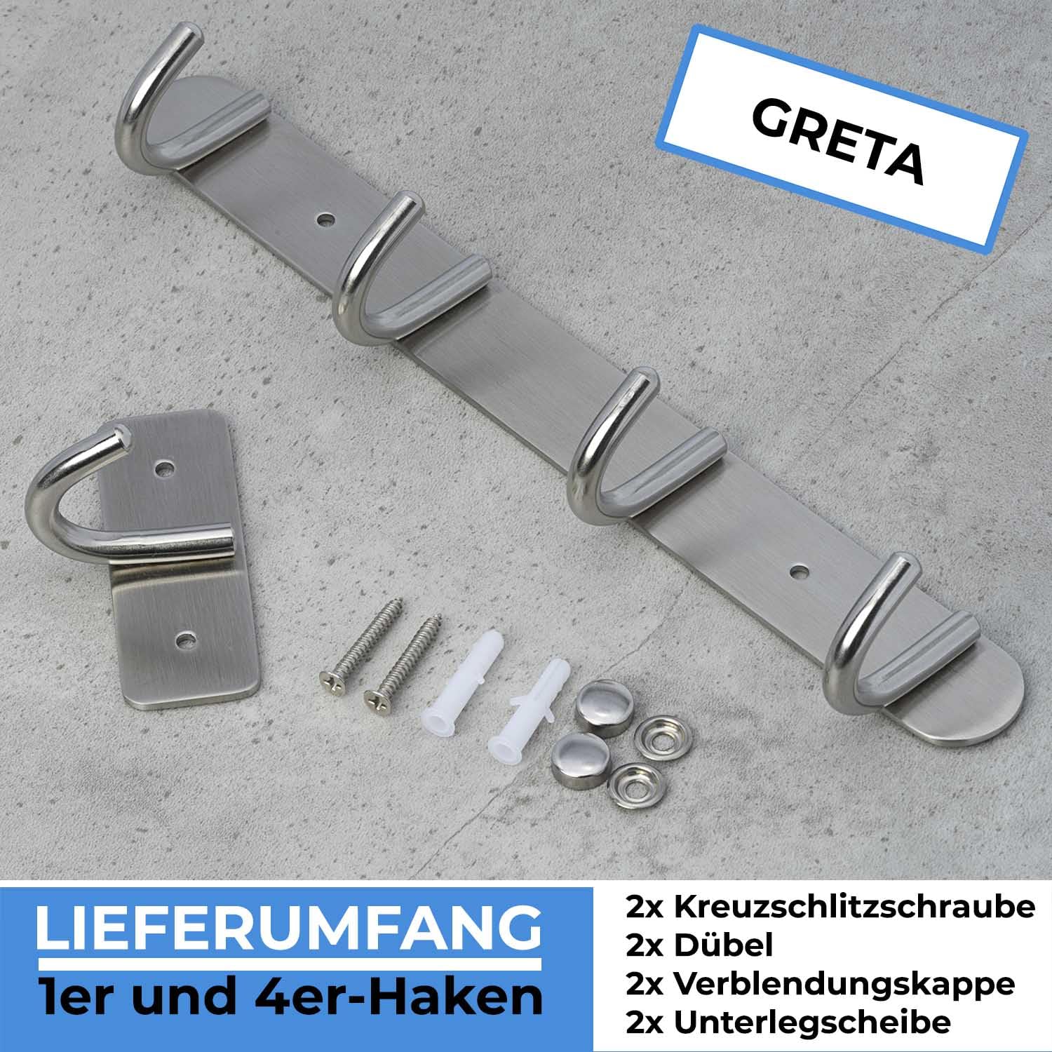 Stahlia Hakenleiste EDELSTAHL gebürstet Garderobenleiste 4x Haken (L: 270mm) Modell:GRETA Wandgarderobe mit 1/4/6/8/10 Kleiderhaken Garderobenhaken Wandhaken