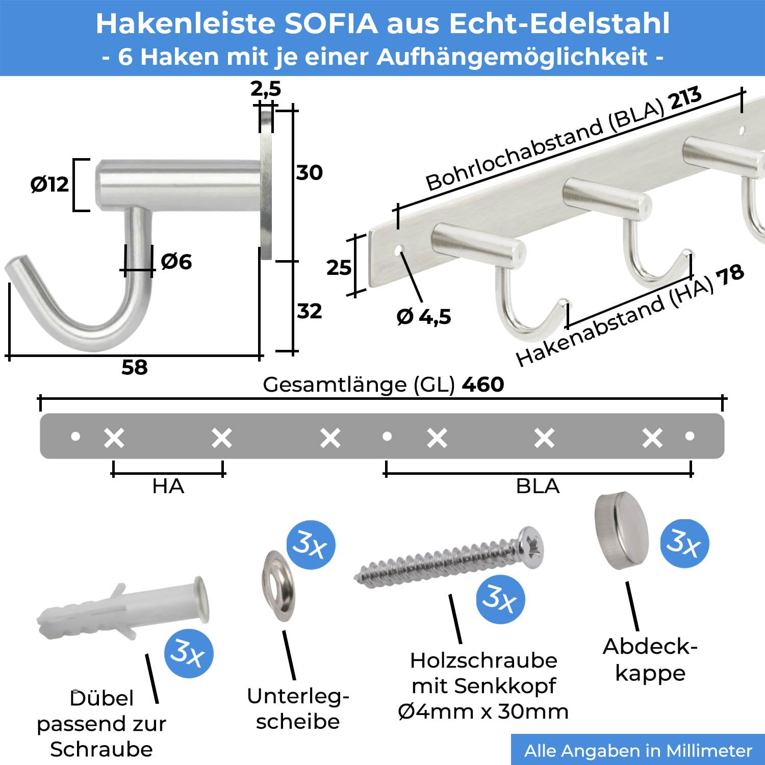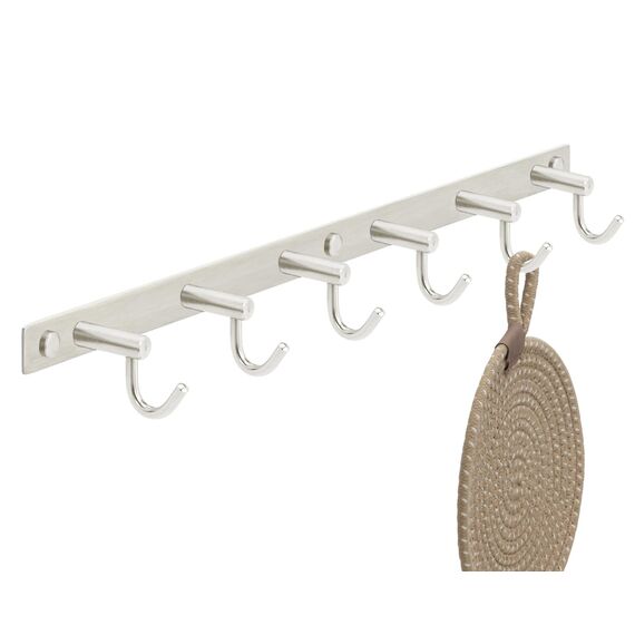 Stahlia Hakenleiste EDELSTAHL gebürstet Garderobenleiste 6x Haken (L: 460mm) Modell:SOFIA Wandgarderobe mit 1/4/6/8/10 Kleiderhaken Garderobenhaken Wandhaken