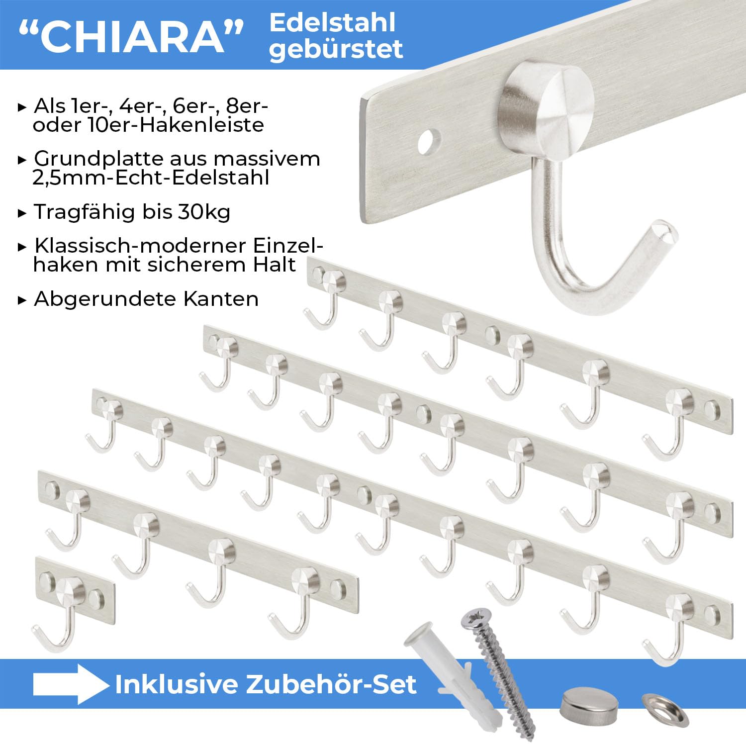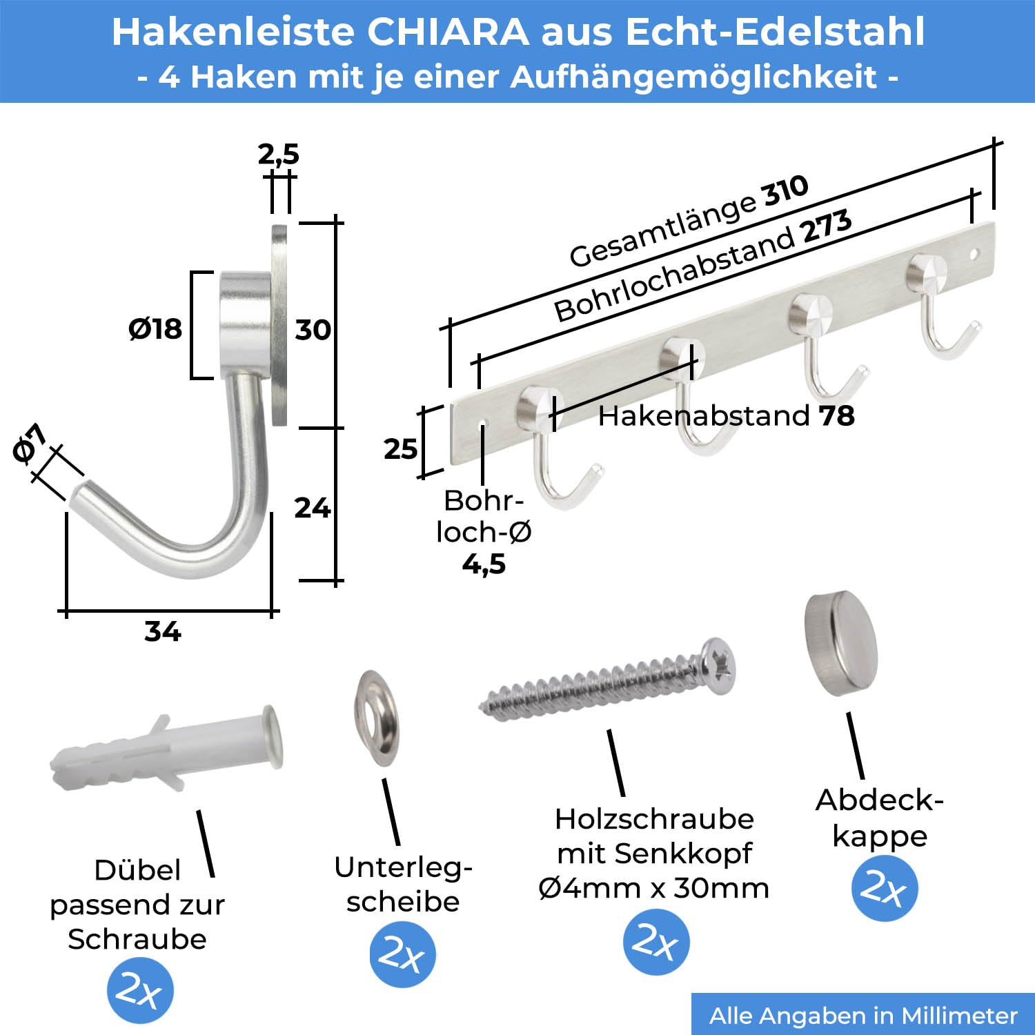 Stahlia Hakenleiste EDELSTAHL gebürstet Garderobenleiste 4x Haken (L: 310mm) Modell:CHIARA Wandgarderobe mit 1/4/6/8/10 Kleiderhaken Garderobenhaken Wandhaken