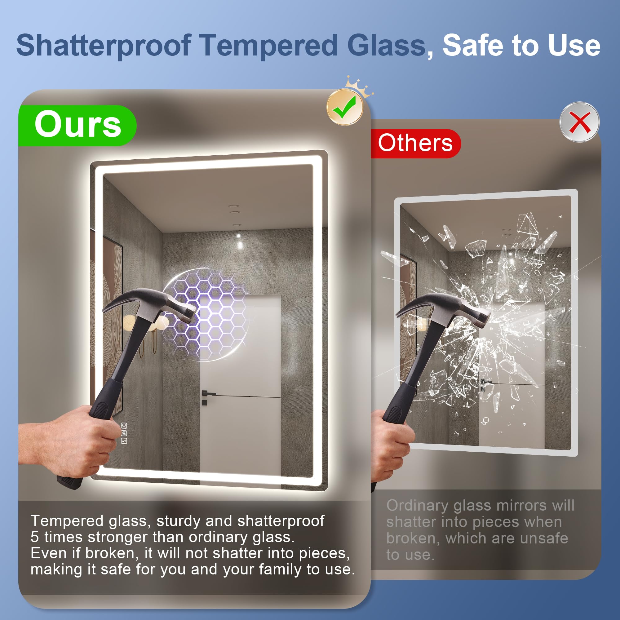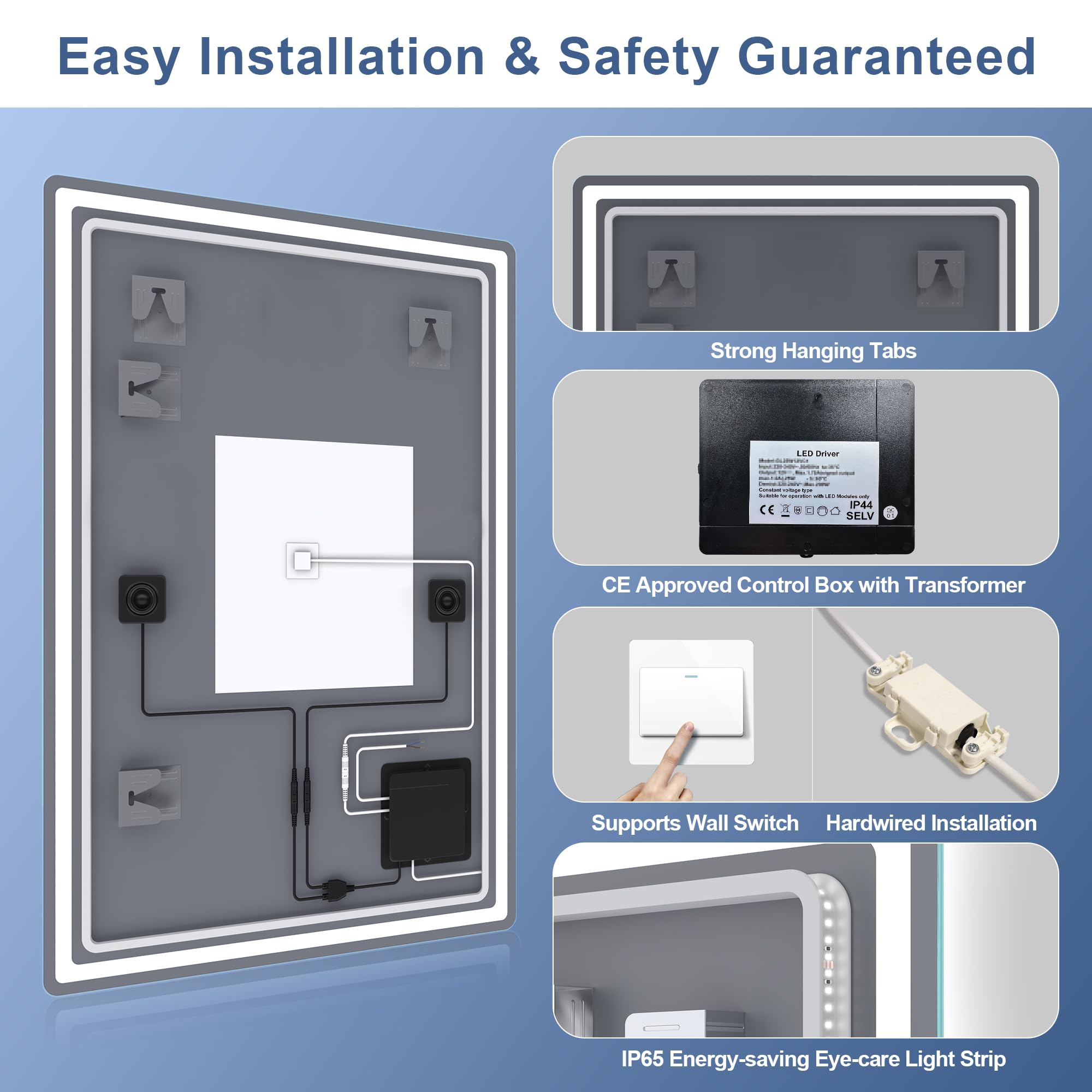 Elevate your daily routine with the STARLEAD 70 x 100cm Bathroom Mirror with Lighting. This remarkable mirror is not just a reflection of your image; it's a portal to a new level of luxury and convenience in your bathroom.This mirror boasts three distinct color temperature settings, allowing you to tailor your lighting to your exact preference. Whether you desire the cozy ambiance of 3000k warm light, the natural clarity of 4000k neutral light, or the crispness of 6500k cool white light, this mirror has you covered. Adjusting the brightness is a breeze with its touch controls, offering a range from a subtle 10% to a brilliant 100%. Plus, this lighting is designed to be gentle on your eyes.But that's not all. The mirror comes with two built-in Bluetooth speakers that transform your bathroom into an audio oasis. Play your favorite tunes while relaxing in the bath or preparing for the day. The touch buttons on the mirror make it easy to control not only the lighting and defogging but also your Bluetooth connection. It even remembers your settings after a power outage, so you don't have to reset everything.Say goodbye to foggy mirrors. With the defogging feature, the mirror keeps its central area clear, so you can apply makeup or shave immediately after your shower or bath. Furthermore, the mirror and LED light strip are waterproof, meeting IP44 and IP65 standards, making it suitable for use in moisture-prone bathrooms.Installation is straightforward, with the flexibility to mount the mirror horizontally or vertically. For added safety, we recommend professional electrical installation. The mirror uses high-quality glass to provide clear and natural reflections, with a Color Rendering Index (CRI) exceeding 90. Safety is a priority too, as it features an explosion-proof film on the back, ensuring your family's well-being even in the event of breakage.Rest assured that your mirror will be shipped from Germany, and we've enhanced our packaging to protect it during transit. In the unlikely event that your mirror arrives damaged, provide photographic evidence, and we'll offer a solution within 24 hours.Experience top-tier lighting, sound, and clarity in your bathroom with the STARLEAD Bathroom Mirror with Lighting. Make every day special by choosing this remarkable addition to your home.