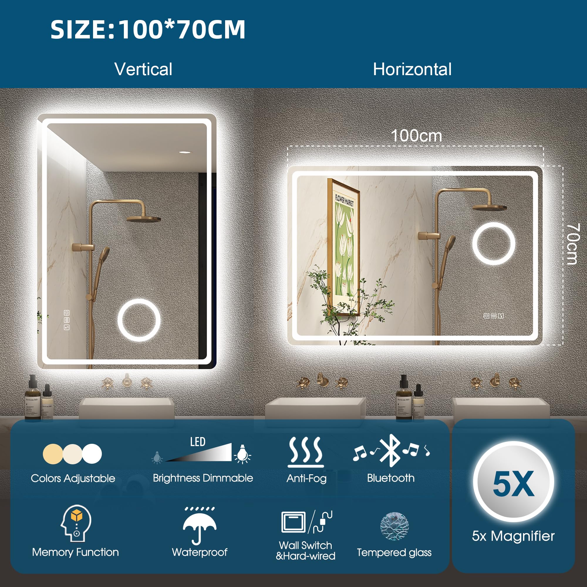 STARLEAD Badspiegel-mit-Beleuchtung 100x70cm, 5X Lupe und Bluetooth, Dimmbar, 3 Farbtemperaturen 3000K-6500K, Entfoggen, Speicherfunktion, IP44 Badezimmerspiegel, HD Hartglas, Horizontal/Vertikal