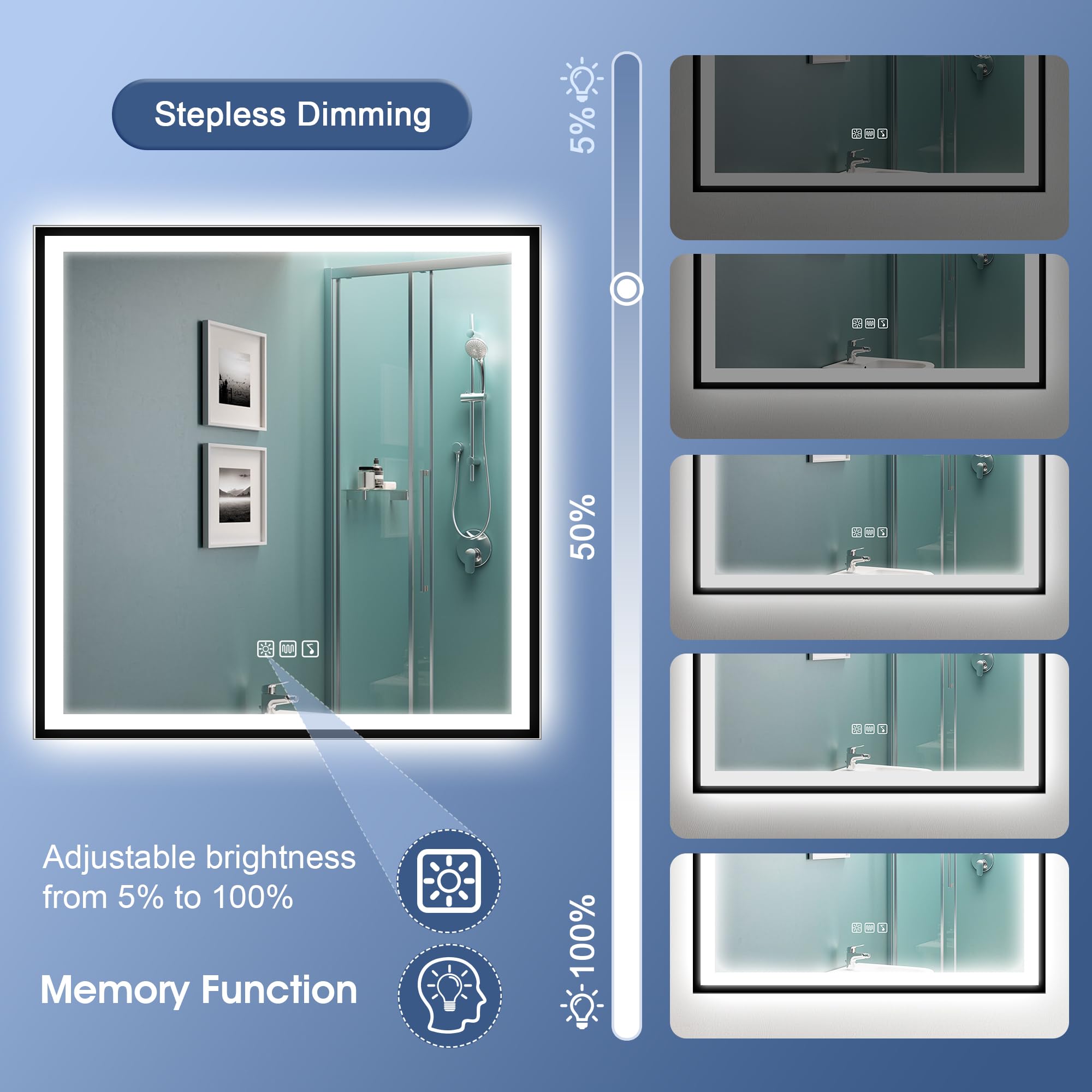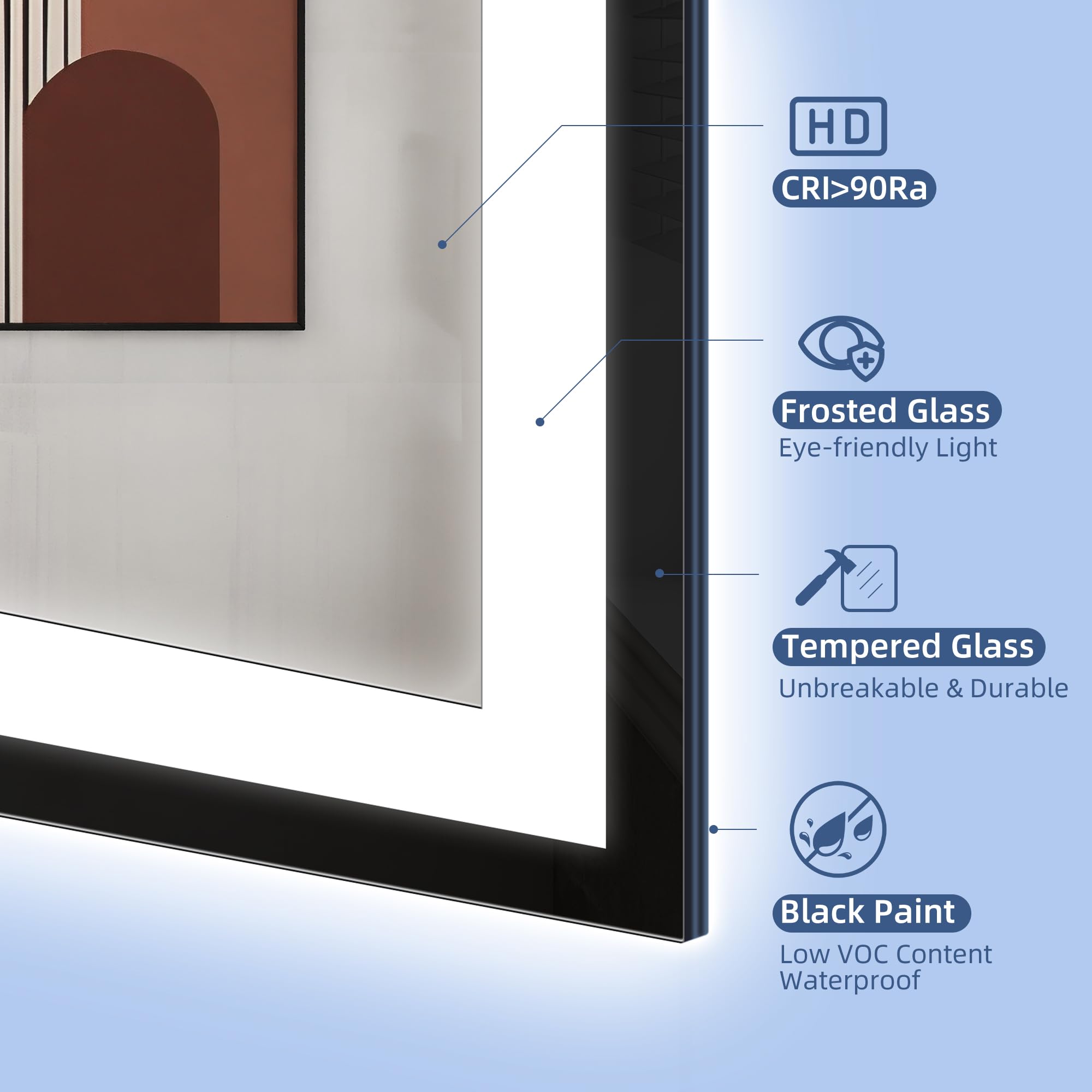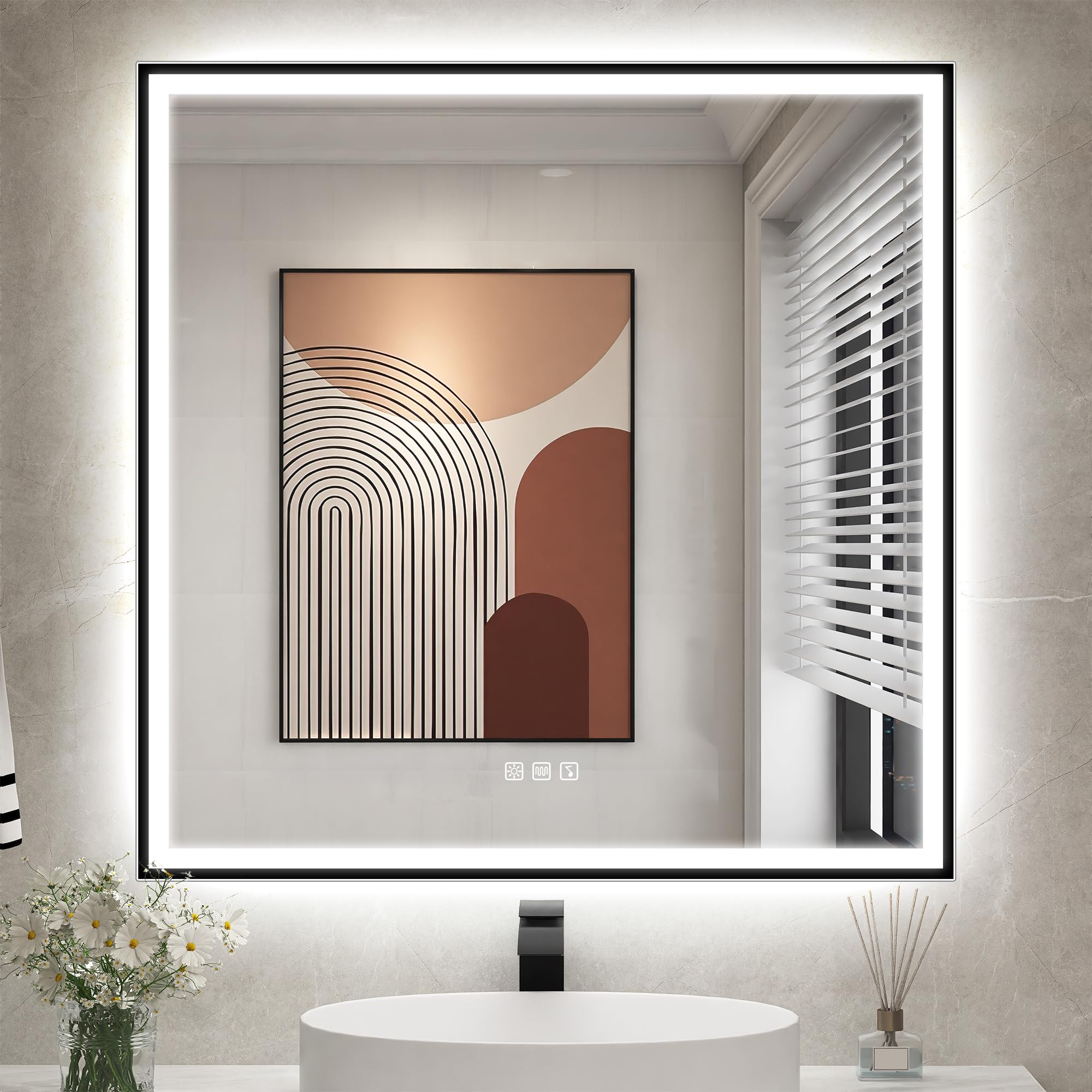 ✨【Einzigartiges Design】 Die schwarze Sprühbeschichtung um den Badspiegel mit Beleuchtung weist eine glatte und gleichmässige Textur auf, die den Spiegel raffinierter und stilvoller aussehen lässt und besser zu einer modernen Einrichtung passt. Die schwarze Sprühbeschichtung bedeckt die Ränder des Spiegels und bildet einen klaren Rand, der dem gesamten Spiegel eine einzigartige Designnote verleiht.