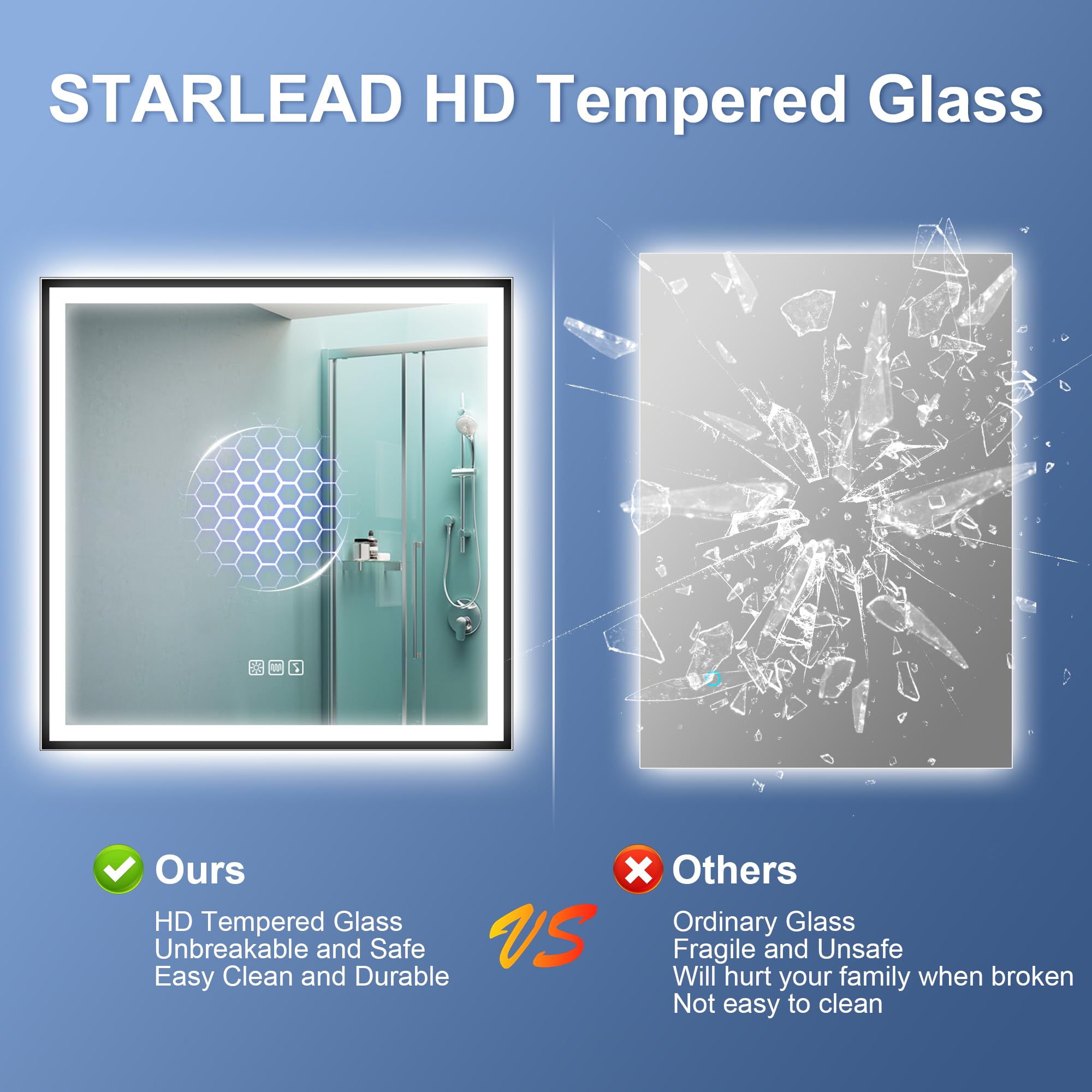 STARLEAD Badspiegel-mit-Beleuchtung 80x80 cm, LED-Spiegel-Bad-mit Bluetooth, Entfoggen, IP44 Badezimmer-Spiegel-mit-Licht 3 Farblichter, Dimmbar, Speicherfunktion, HD Hartglas, Schwarz