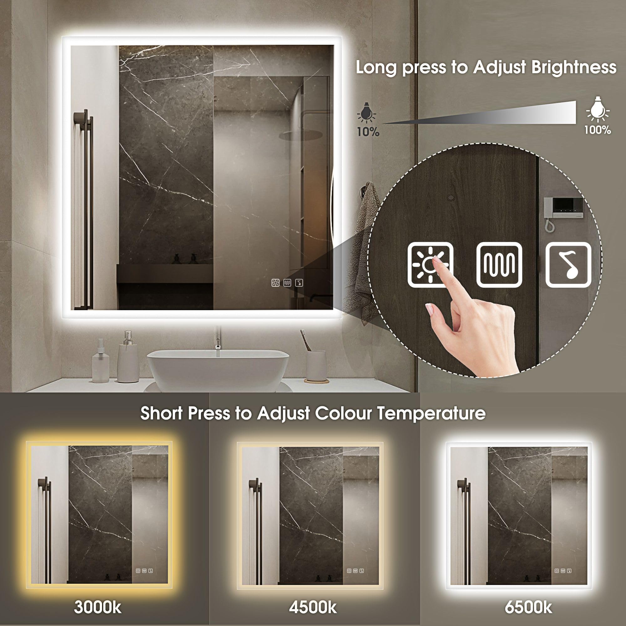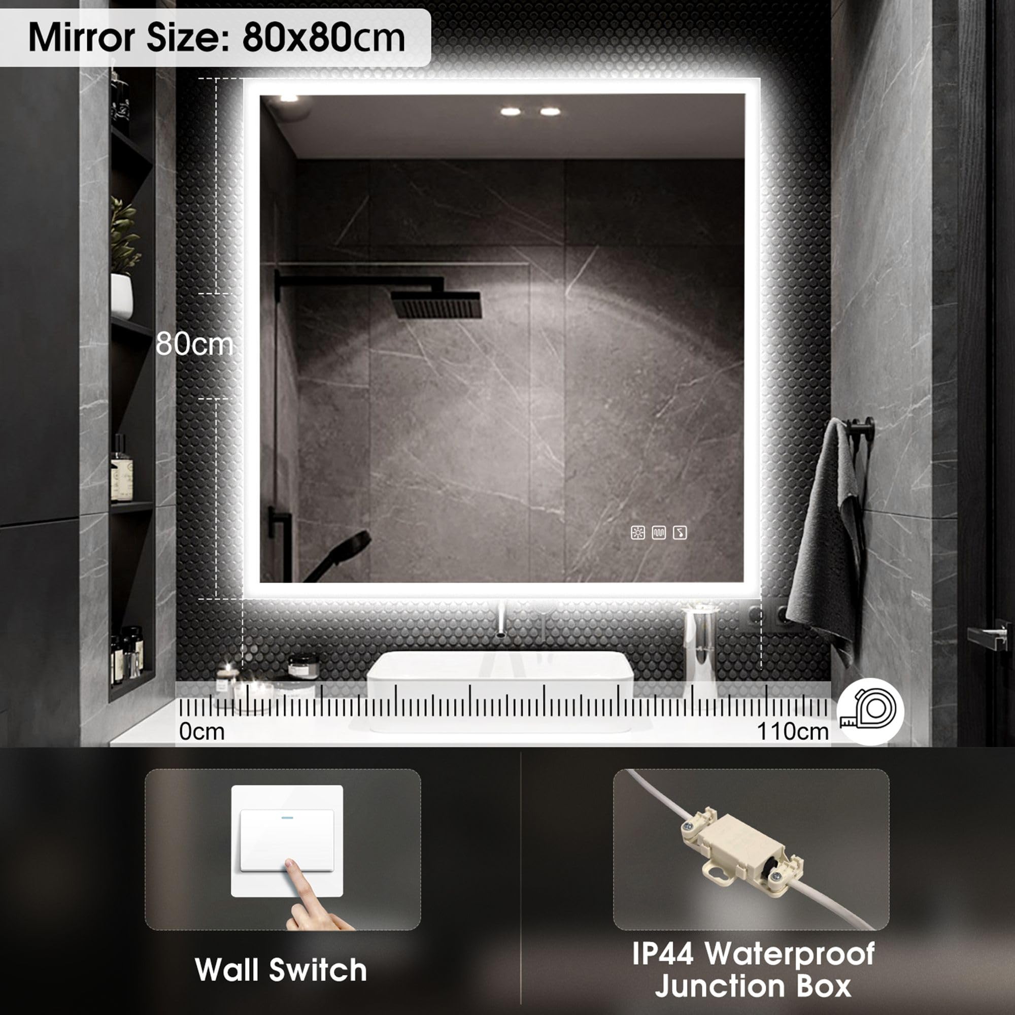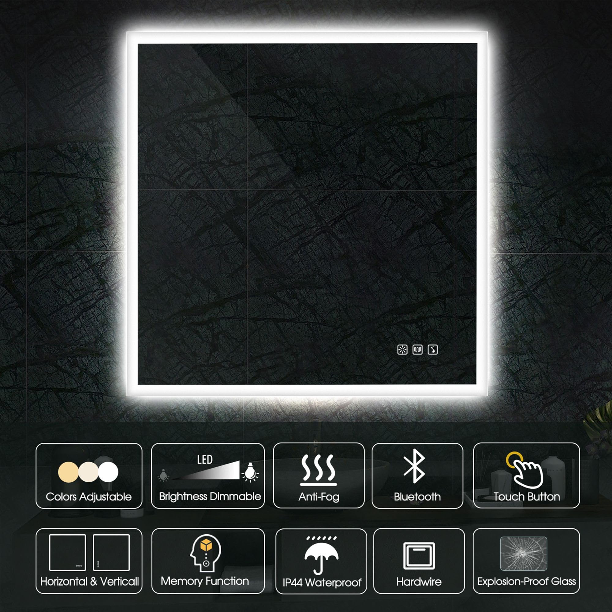 Der hochwertige, kupferfreie quadratische Badezimmerspiegel bietet beste Sicht durch weiches diffuses Licht und elegantes modernes Design. Es hat einen empfindlichen Touch-Schalter, Memory-Funktion, Bluetooth-Lautsprecher, Entnebelungsfunktion, wasserdicht und einstellbare Farbtemperatur.