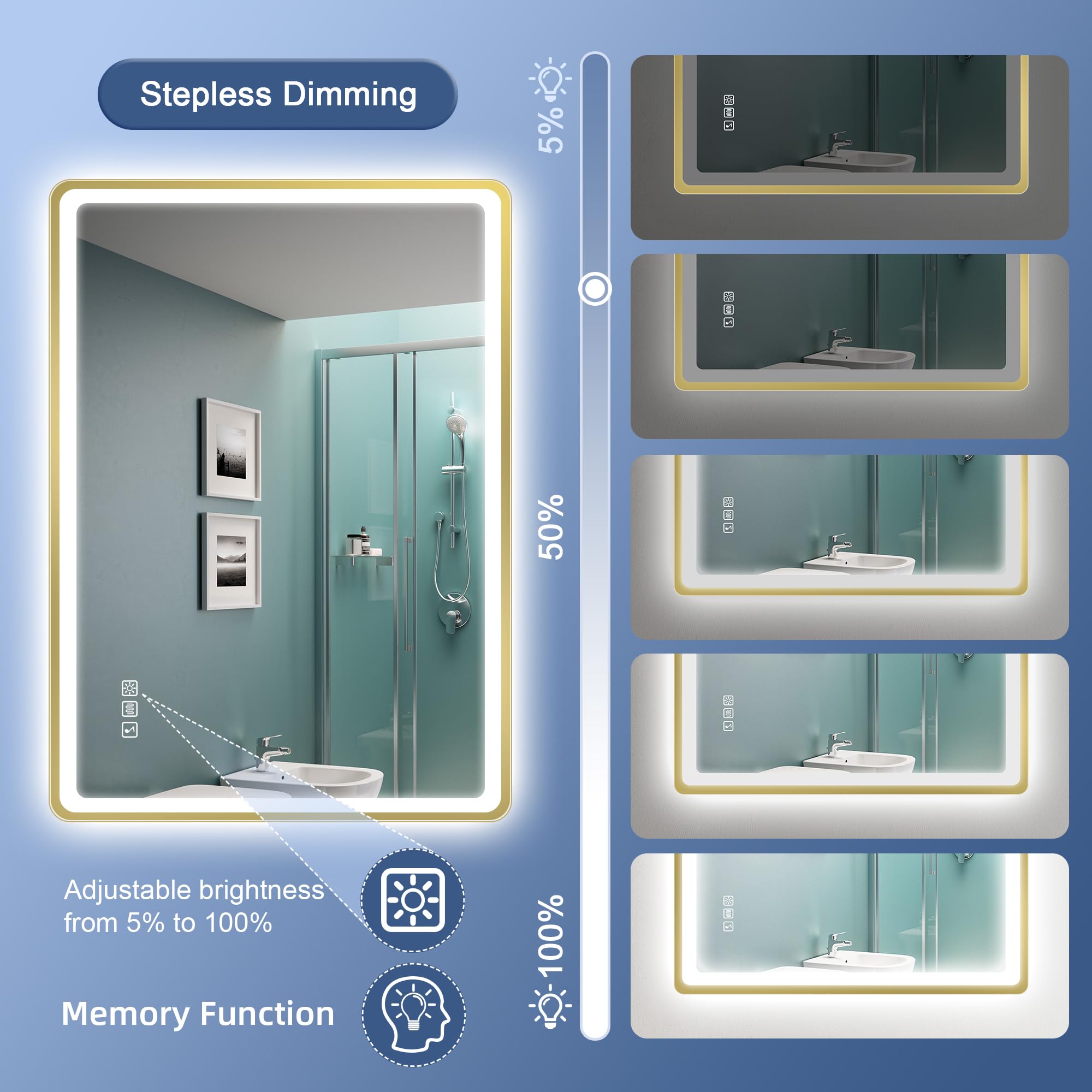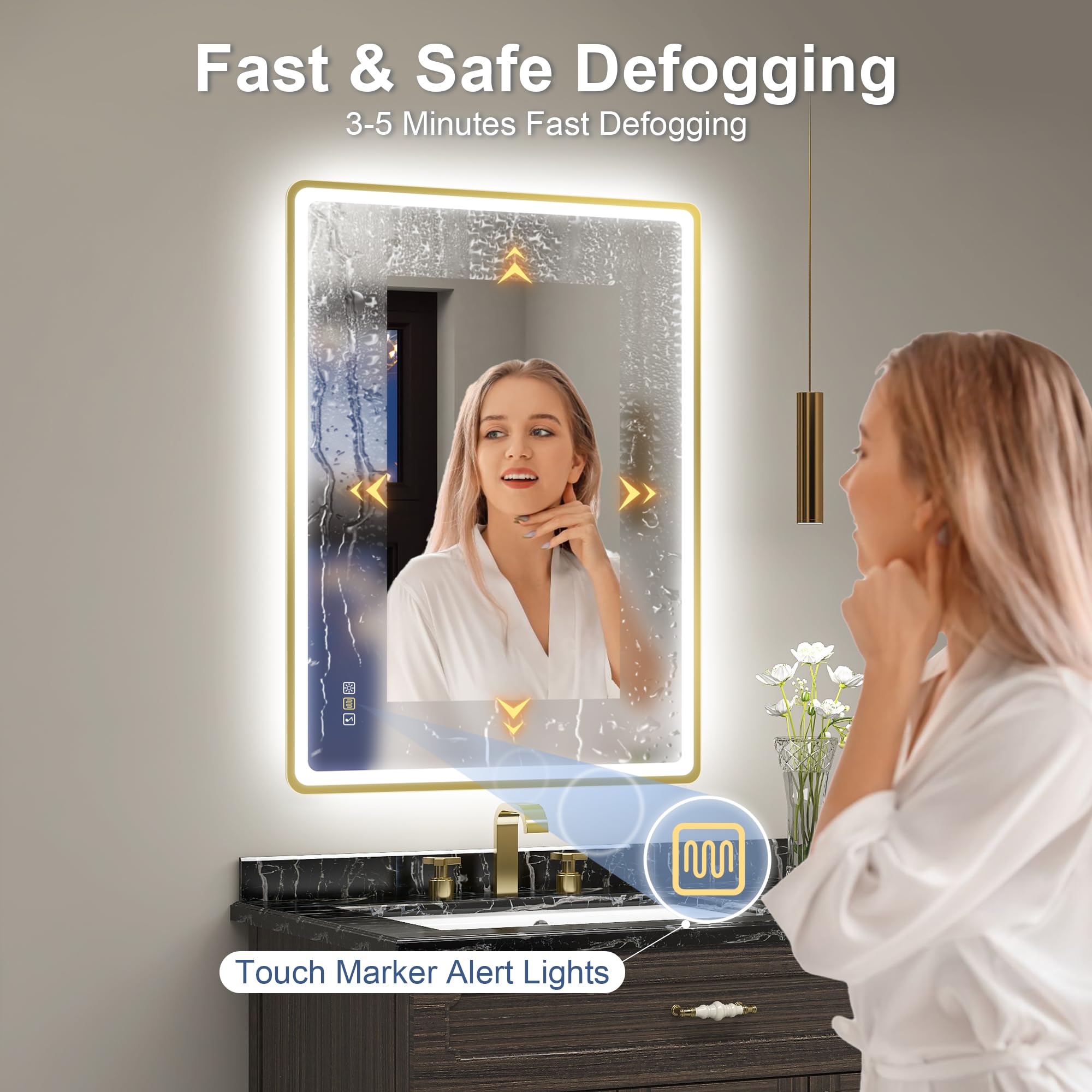 STARLEAD 80x60cm Golden LED-Badspiegel-mit-Beleuchtung und Bluetooth, Entfoggen, Dimmbar, 3 Lichtfarben, HD Gehärtetes Glas, IP44 Wasserdicht, Horizontal/Vertikal