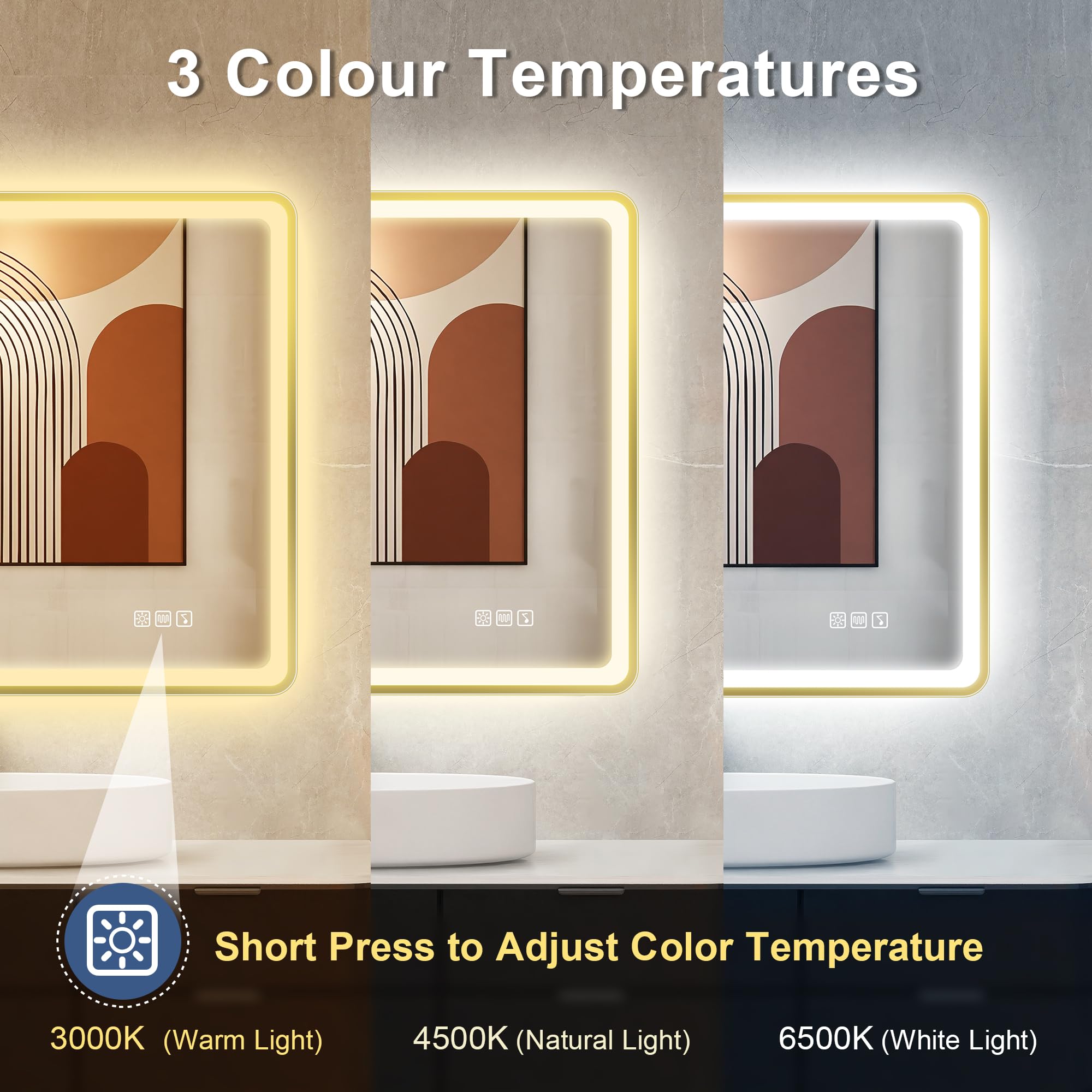 【3 Farbtemperaturen & dimmbar】STARLEAD 60 x 80cm badspiegel mit beleuchtung hat 3 Farbtemperaturen (3000k warmes Licht/4000k natürliches Licht/6500k kaltes weisses Licht), den besten Look unter verschiedenen Lichtern zu schaffen. Stufenlos dimmbar, berühren Sie einfach die Lichttaste für 3 Sekunden, die Helligkeit des Spiegels einzustellen (5%-100%). Sanftes Licht Ihre Augen zu schützen. Hochwertige Energiesparleiste mit 120 LED-Perlen pro Meter, spart Strom und hält bis zu 50.000+ Stunden