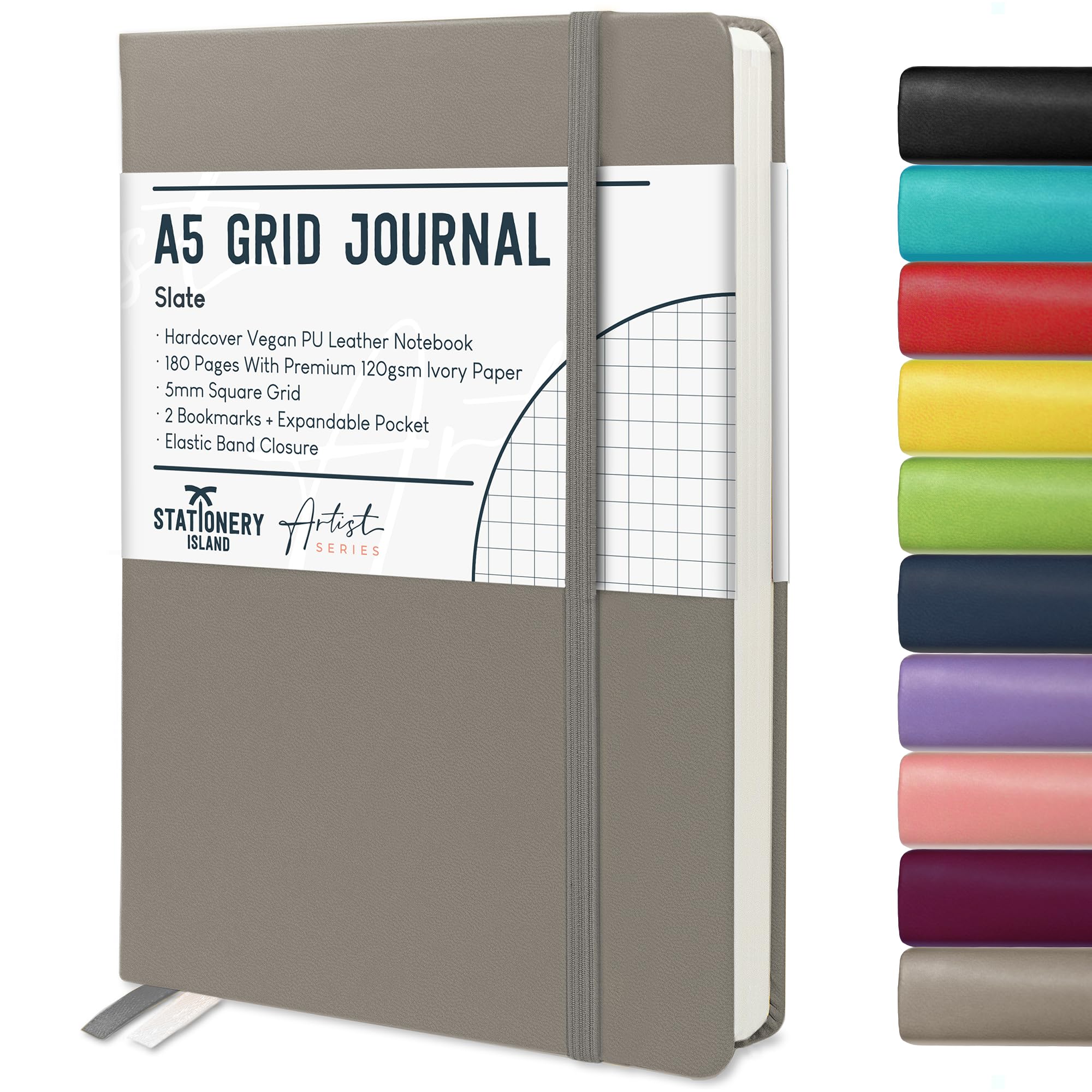 STATIONERY ISLAND Notizbuch A5 Kariert, Journal Hardcover mit 120 g/m² Dickem Papier, 180 Seiten Tagebuch, Notebook a5 für Mädchen, Reisetagebuch, Planen, Lernen, Grau