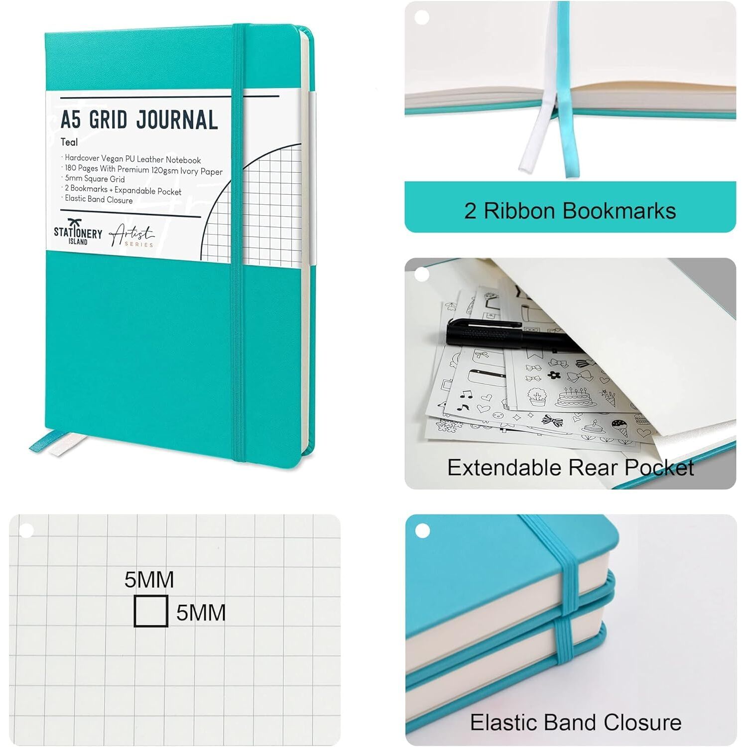 STATIONERY ISLAND Notizbuch A5 Kariert, Journal Hardcover mit 120 g/m² Dickem Papier, 180 Seiten Tagebuch, Notebook a5 für Mädchen, Reisetagebuch, Planen, Lernen, Schreiben