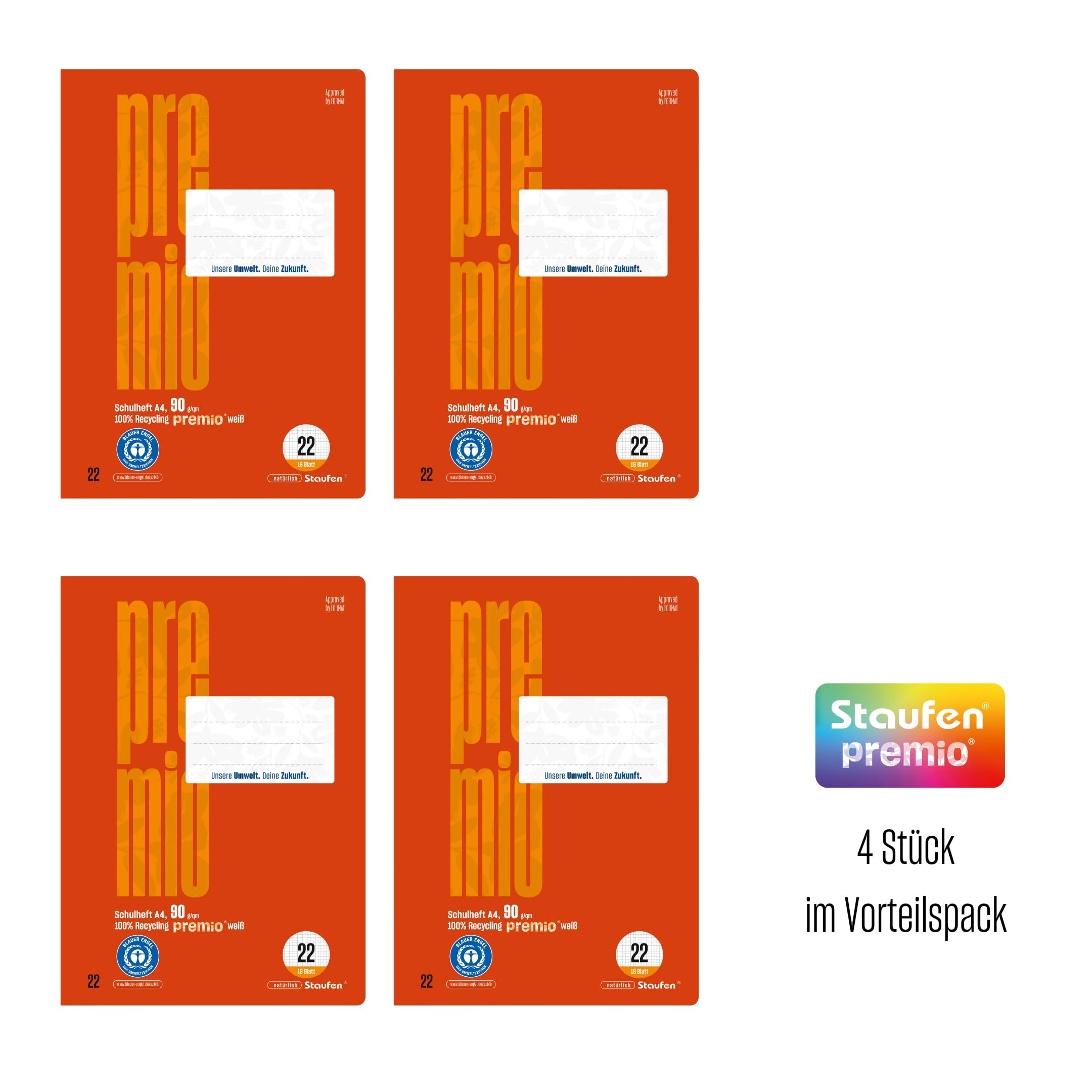 Schulheft · Format: DIN A4 · Lineatur: LIN 22 (5mm kariert) · 90 g/m² · Inhalt: 4 Hefte mit jeweils 16 Blatt · runde Ecken verhindern Eselsohren · premiumweisses Recyclingpapier · Deckblatt mit 4 Motiven (keine Auswahl möglich) · Das Staufen premio Schulheft lässt die Herzen umweltbewusster Verbraucher höherschlagen: Ausgezeichnet mit dem Umweltzeichen Blauer Engel und produziert in einem nachhaltigen Unternehmen steht es für Umweltschutz auf höchster Ebene. Weil es nicht gleichgültig ist, worin man schreibt, besteht dieses Heft zu 100% aus Recyclingpapier und setzt somit ein klares Statement für klimafreundliches Arbeiten in Schule - von klein an. Neben der hochwertigen Verarbeitung überzeugt es vor allem durch den formstabilen Umschlag und die abgerundeten Ecken: So bleibt das Heft bis zum Ende des Schuljahrs ohne Knicke und unschöne Eselsohren.