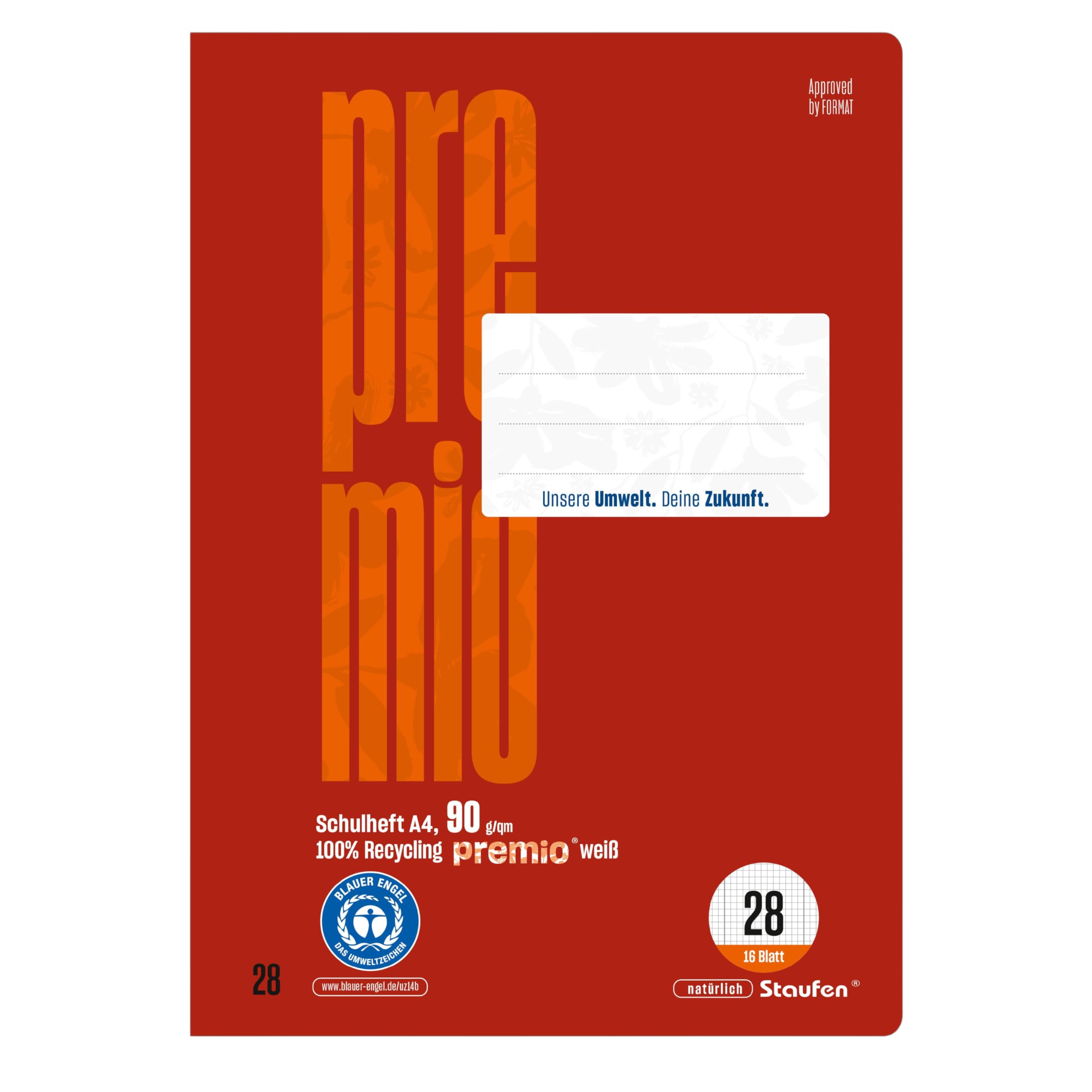 Staufen premio Schulheft - 4 Hefte je 16 Blatt, DIN A4, Lineatur 28 (5mm kariert mit Randlinien), 90 g/m² Recyclingpapier, runde Ecken verhindern „Eselsohren“