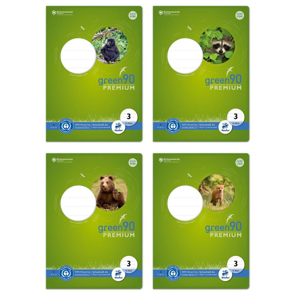 Staufen Green Heft - DIN A4, Lineatur 3 (14 Doppellinien), 16 Blatt, premiumweisses 90 g/m² Recyclingpapier, runde Ecken verhindern „Eselsohren“, 4 verschiedene Motive (keine Auswahl möglich), 1 Stück