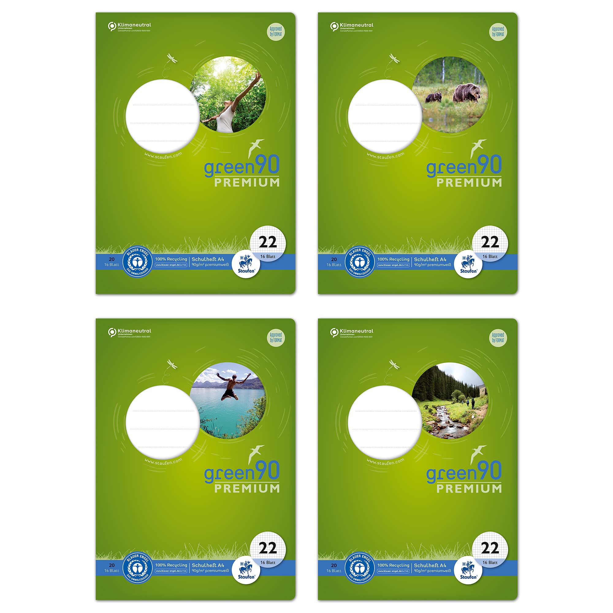 Staufen Green Heft - DIN A4, Lineatur 7 (7mm liniert), 16 Blatt, premiumweißes 90g/m² Recyclingpapier, runde Ecken verhindern „Eselsohren“, 4 verschiedene Motive (keine Auswahl möglich), 1 Stück