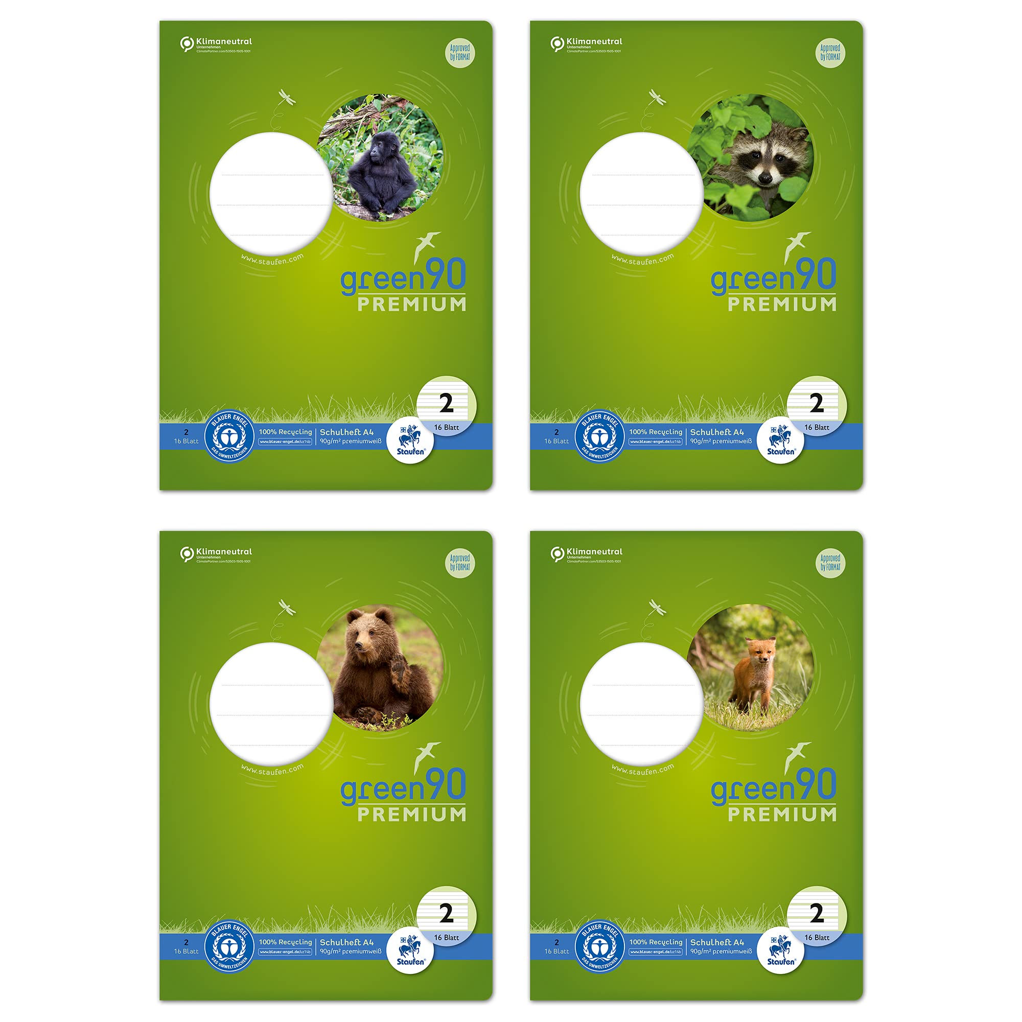 Staufen Green Heft - DIN A4, Lineatur 4 (9mm liniert), 16 Blatt, premiumweißes 90g/m² Recyclingpapier, runde Ecken verhindern „Eselsohren“, 4 verschiedene Motive (keine Auswahl möglich), 1 Stück