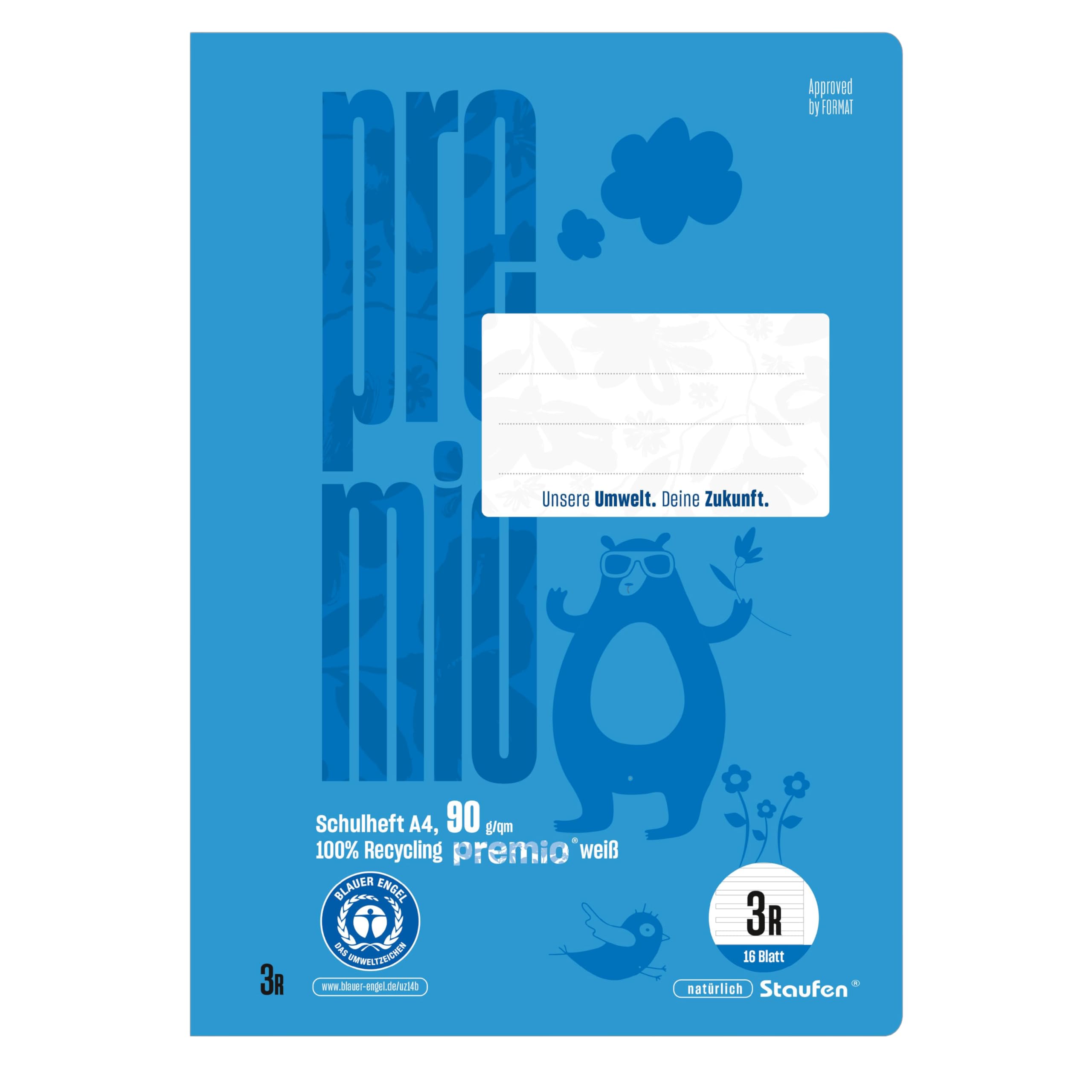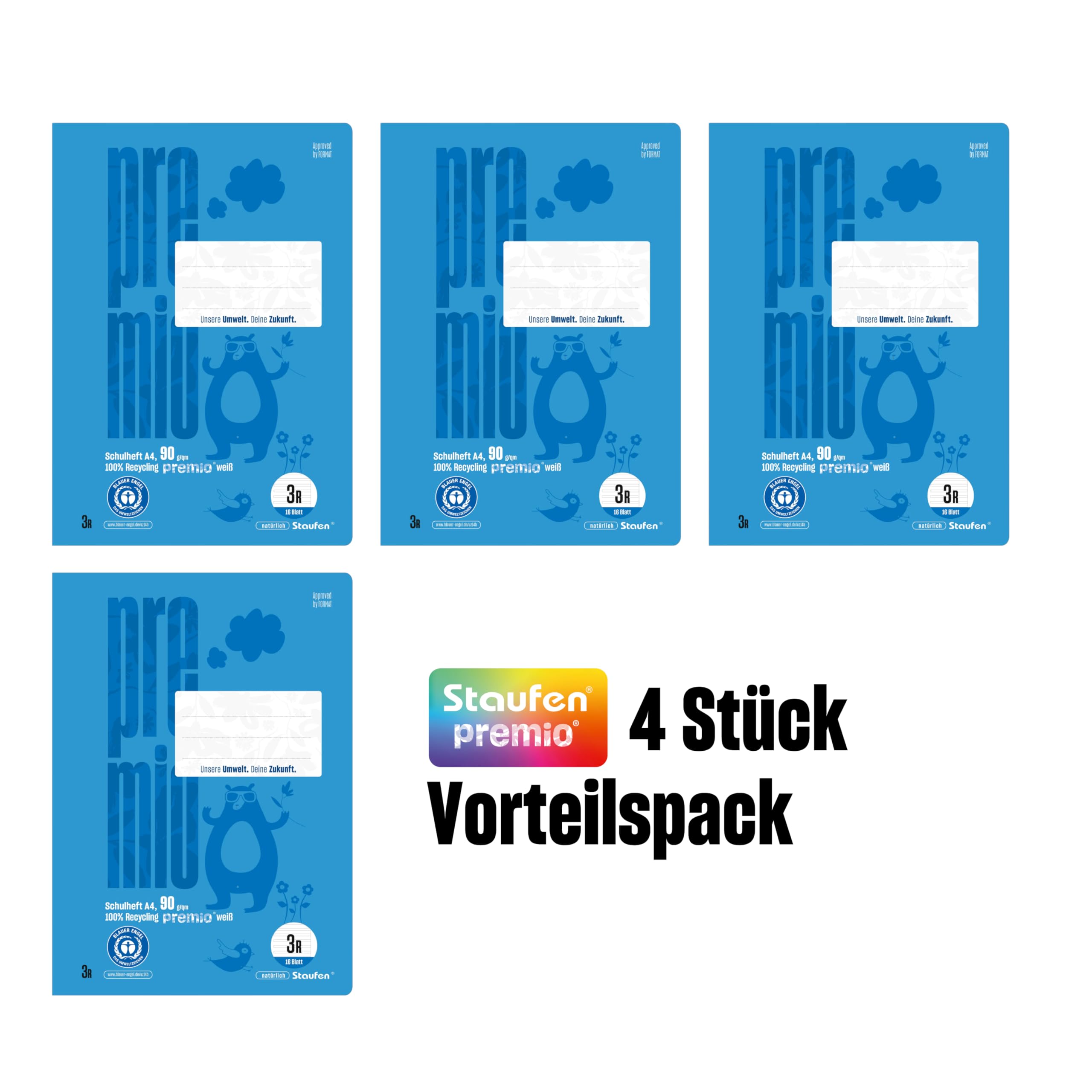 Staufen premio Schulheft - 4 Hefte je 16 Blatt, DIN A4, Lineatur 3R (21 Doppellinien mit Rand), 90 g/m² Recyclingpapier, runde Ecken verhindern „Eselsohren“