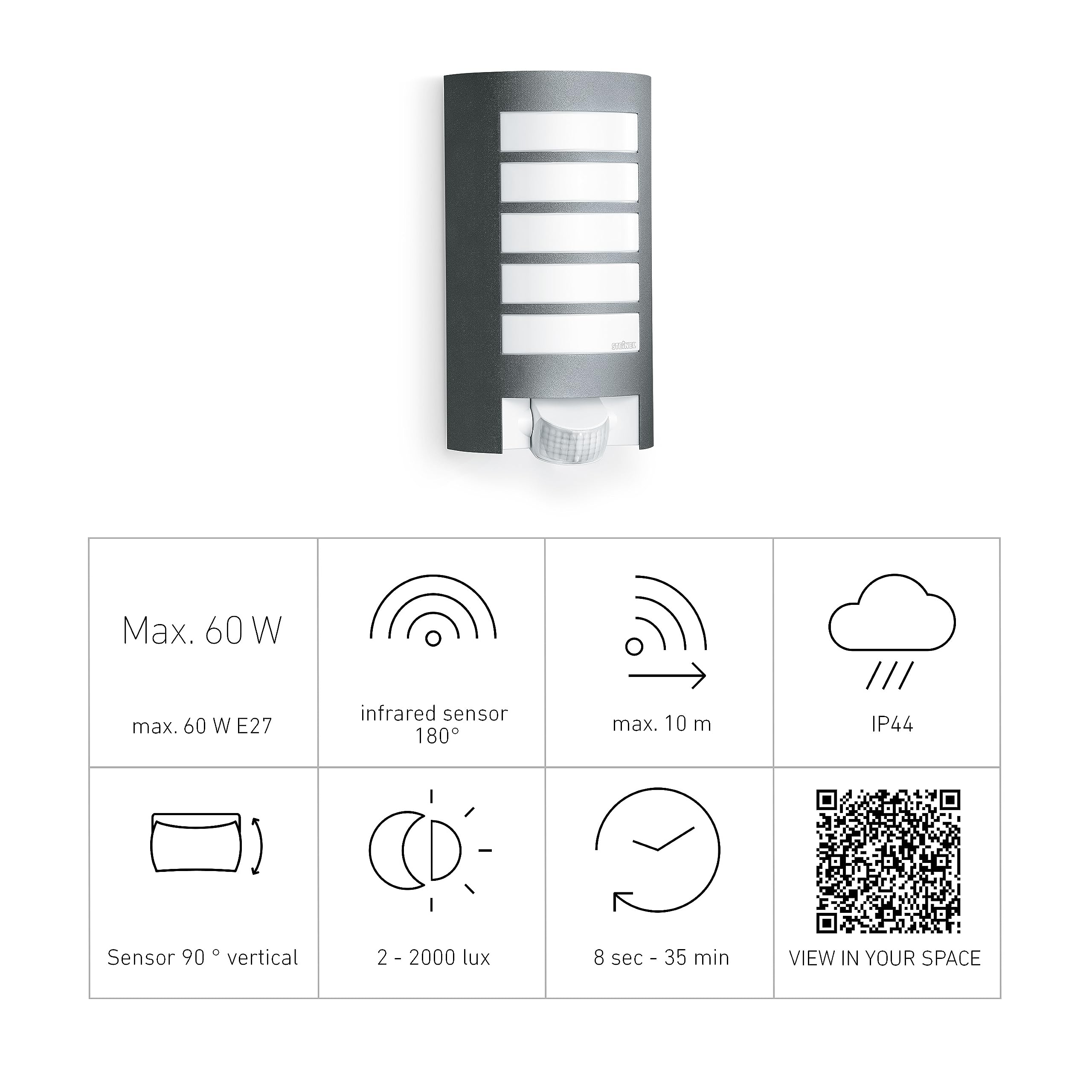 Steinel Aussenleuchte L 12 S anthrazit, 180° Bewegungsmelder, Dämmerungssensor, Alu-Blende, E27, Max. 60W Wandleuchte, 27.2 x 15.5 x 10.8 cm