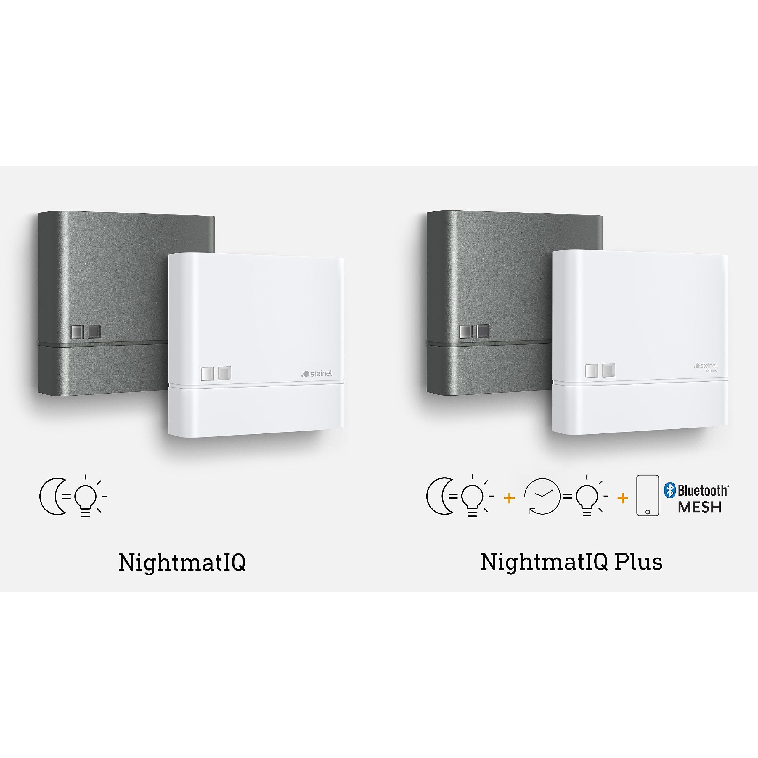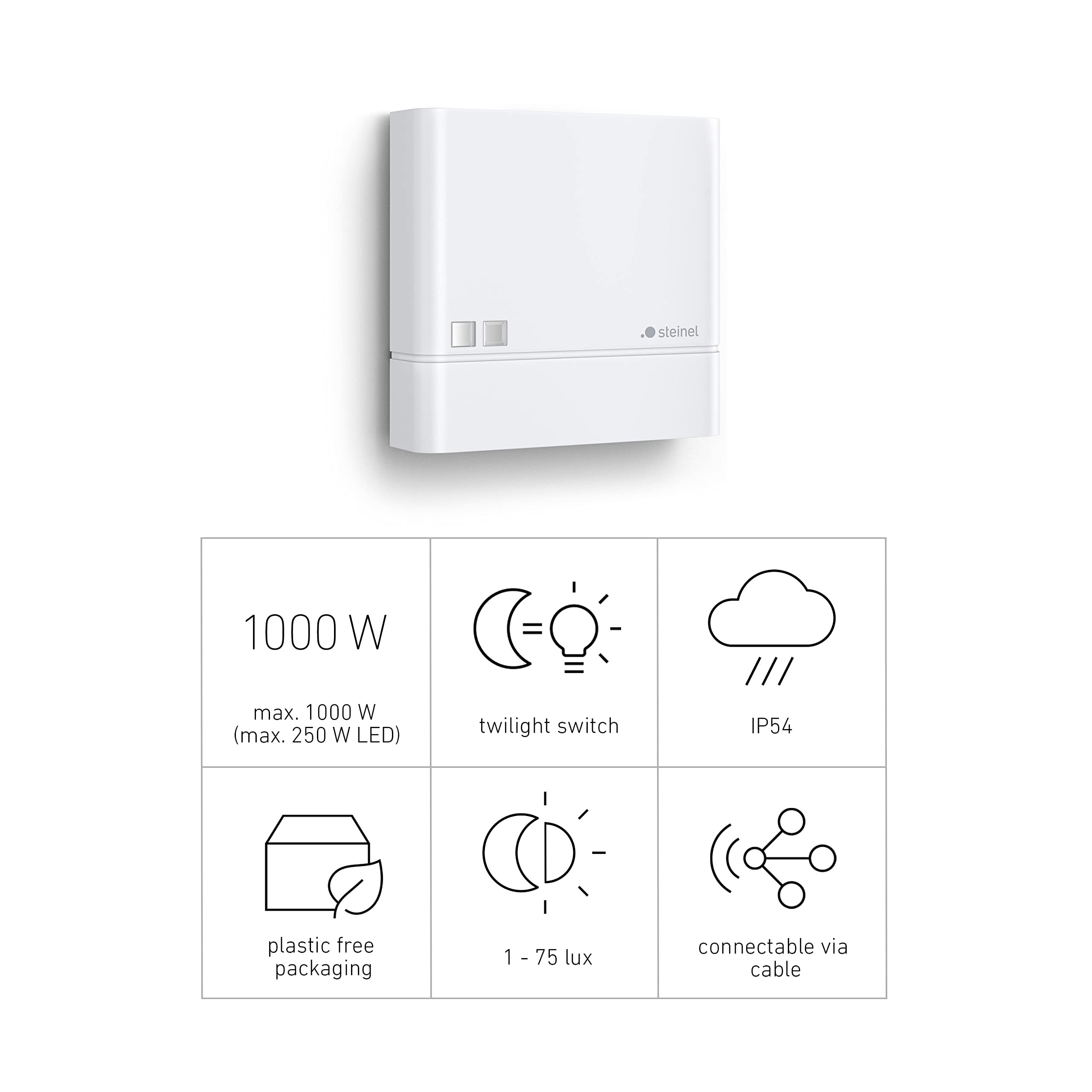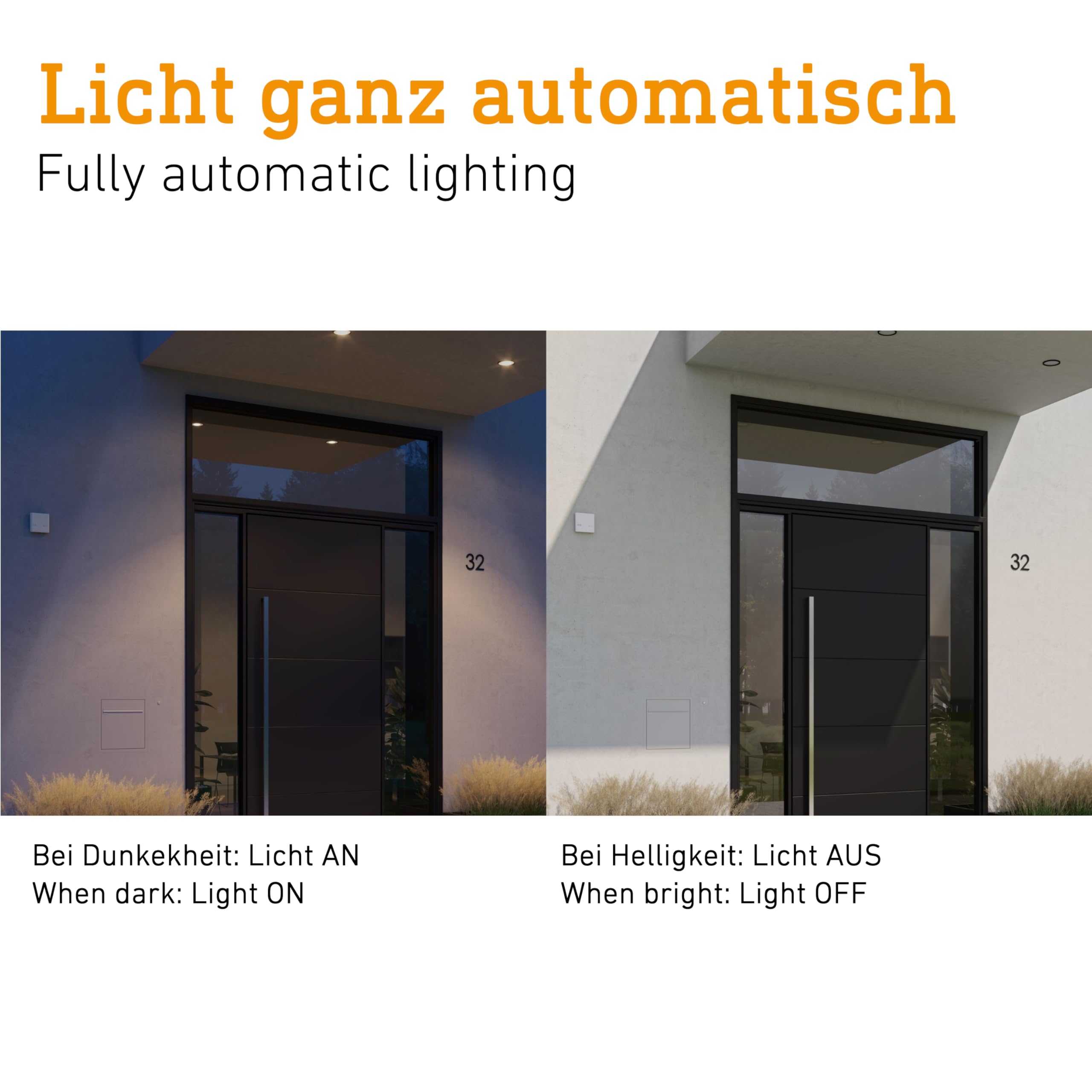 Designstarker Dämmerungsschalter. Der auffallend unauffällige Dämmerungsschalter NightmatIQ besticht durch flaches geradliniges Design und sorgt Nacht für Nacht automatisch für perfekte Beleuchtung. Mit dem Erreichen der eingestellten Dämmerungsschwelle nimmt der Dämmerungsschalter seine Arbeit auf und schaltet alle angeschlossenen Leuchten zeitgleich an (max. 1000 W/ LED: 250 W). So lassen sich Hausfronten, Grundstücke, Gärten, Schaufenster oder andere Bereiche pünktlich zum Eintritt der Dämmerung zuverlässig beleuchten – ohne, dass dafür auch nur ein Finger gerührt werden muss. Wenn dann Stunden später der Morgen dämmert, gehen die Lichter ganz von selbst wieder aus. So lassen sich dank NightmatIQ vorhandene Leuchten, die bislang manuell geschaltet wurden, im Handumdrehen auf automatischen Betrieb umstellen. Dabei ist der Dämmerungswert per Poti (Regler) bedarfsgerecht von 1 bis 75 Lux Umgebungshelligkeit einstellbar. Ob Regen, Sturm oder Schnee – der NightmatIQ arbeitet bei jeder Witterung dank Schutzart IP 54 zuverlässig. Den Dämmerungsschalter gibt es in den Farben Weiss und Anthrazit.