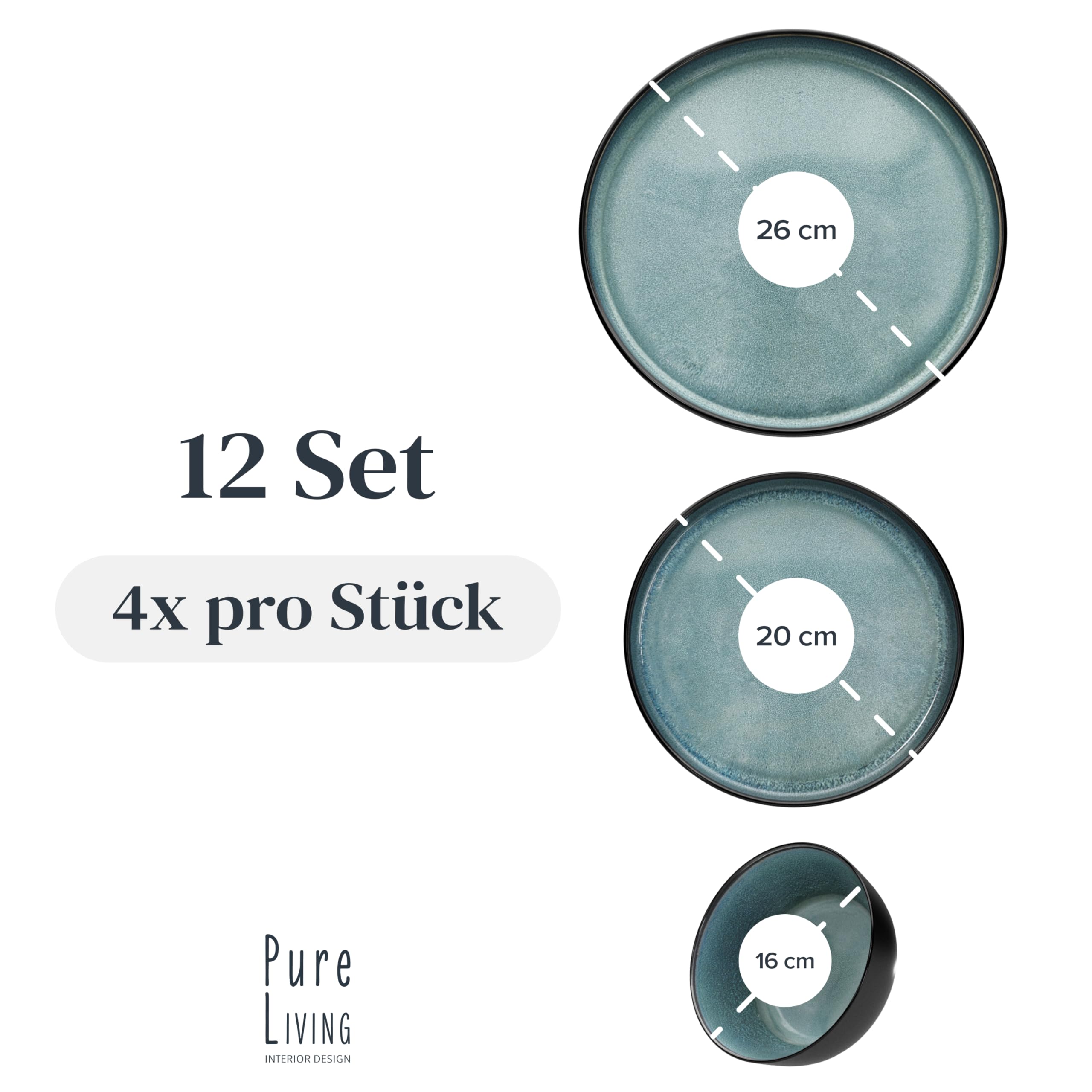 Steingut Geschirrset 4 Personen Ibiza 12 tlg. TESTSIEGER, Traumhaftes Mediterranes Steingut Geschirr Set, Schüssel- und Teller Set, Tafelservice 4 Personen, Geschirrsets Pure Living in Petrol