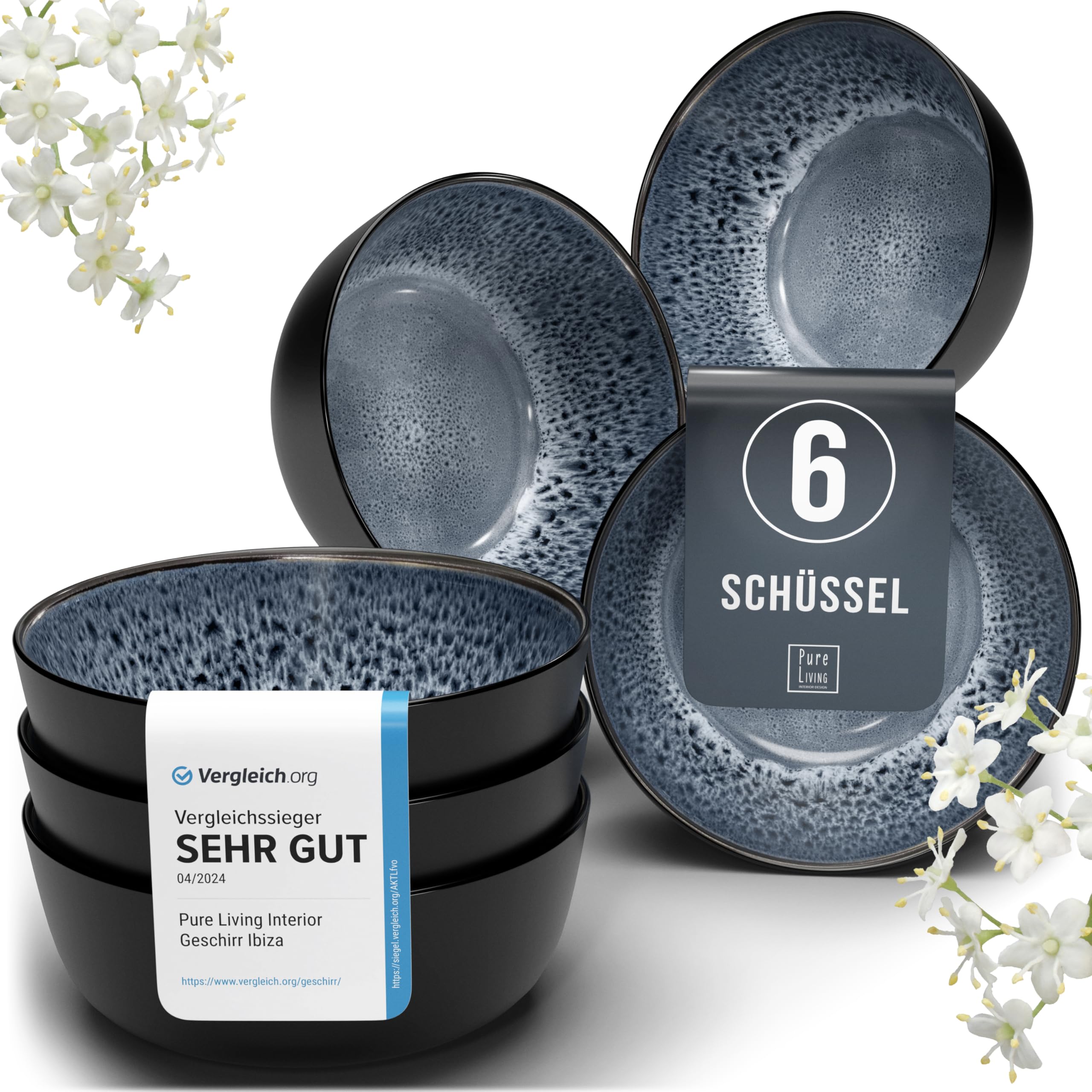 Steingut Müslischalen 6 Personen Ibiza TESTSIEGER, Traumhaftes Mediterranes Steingut Müsli Schüssel Set, Kleine Schüssel, Müslischale - Pure Living in Rauchblau