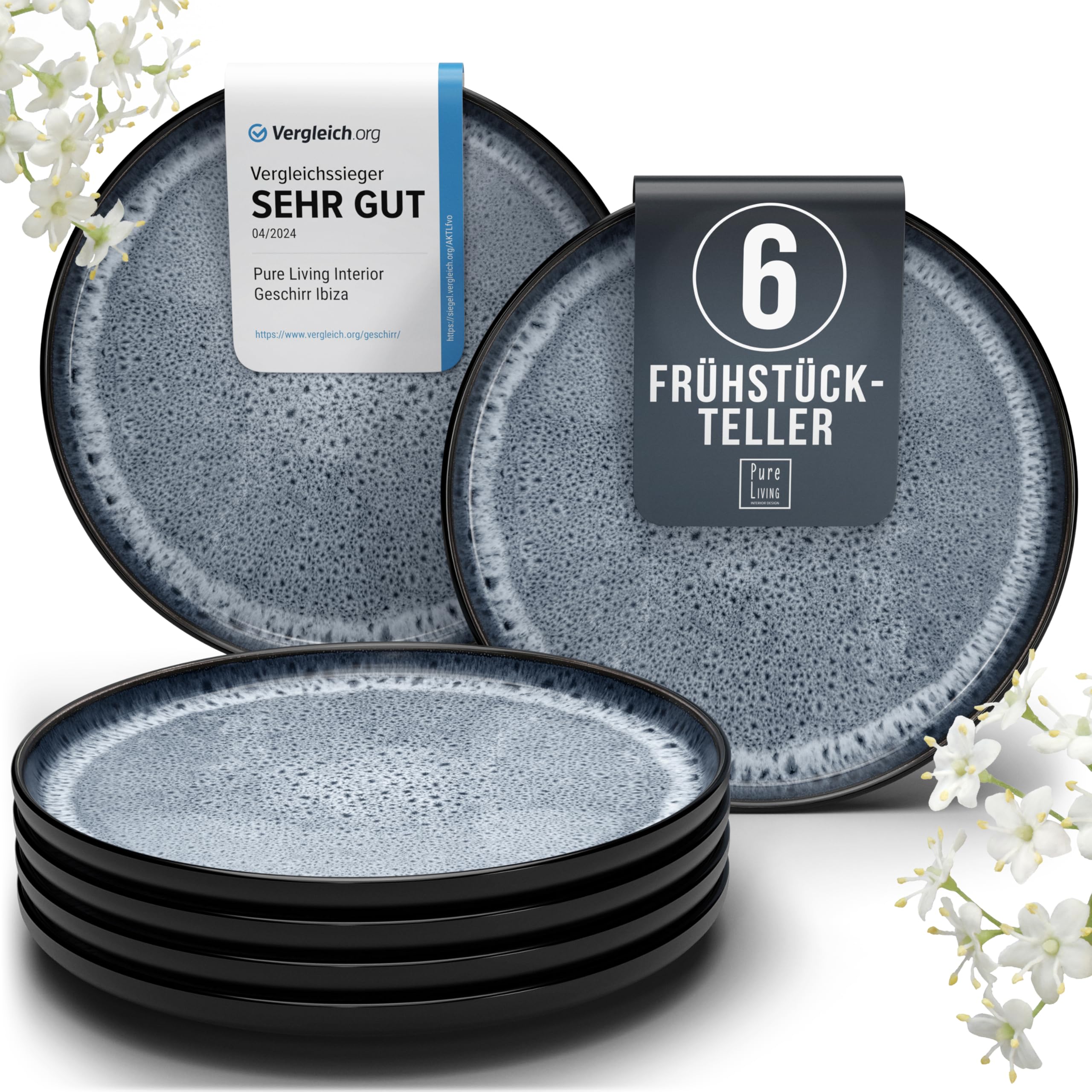 Steingut Frühstücksteller 6 Personen Ibiza TESTSIEGER, Traumhaftes Mediterranes Steingut Dessertteller Set, Kleine Teller, Salatteller - Pure Living in Rauchblau