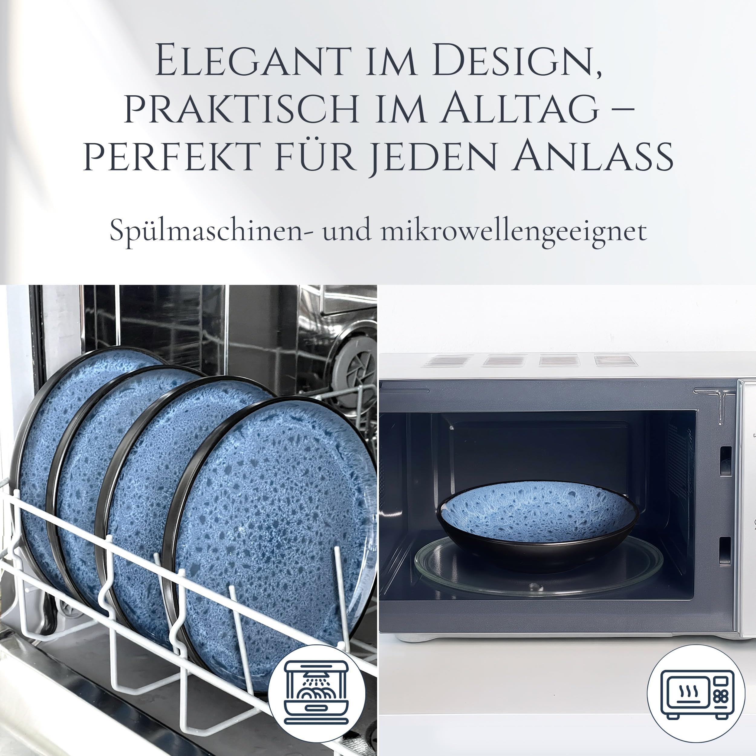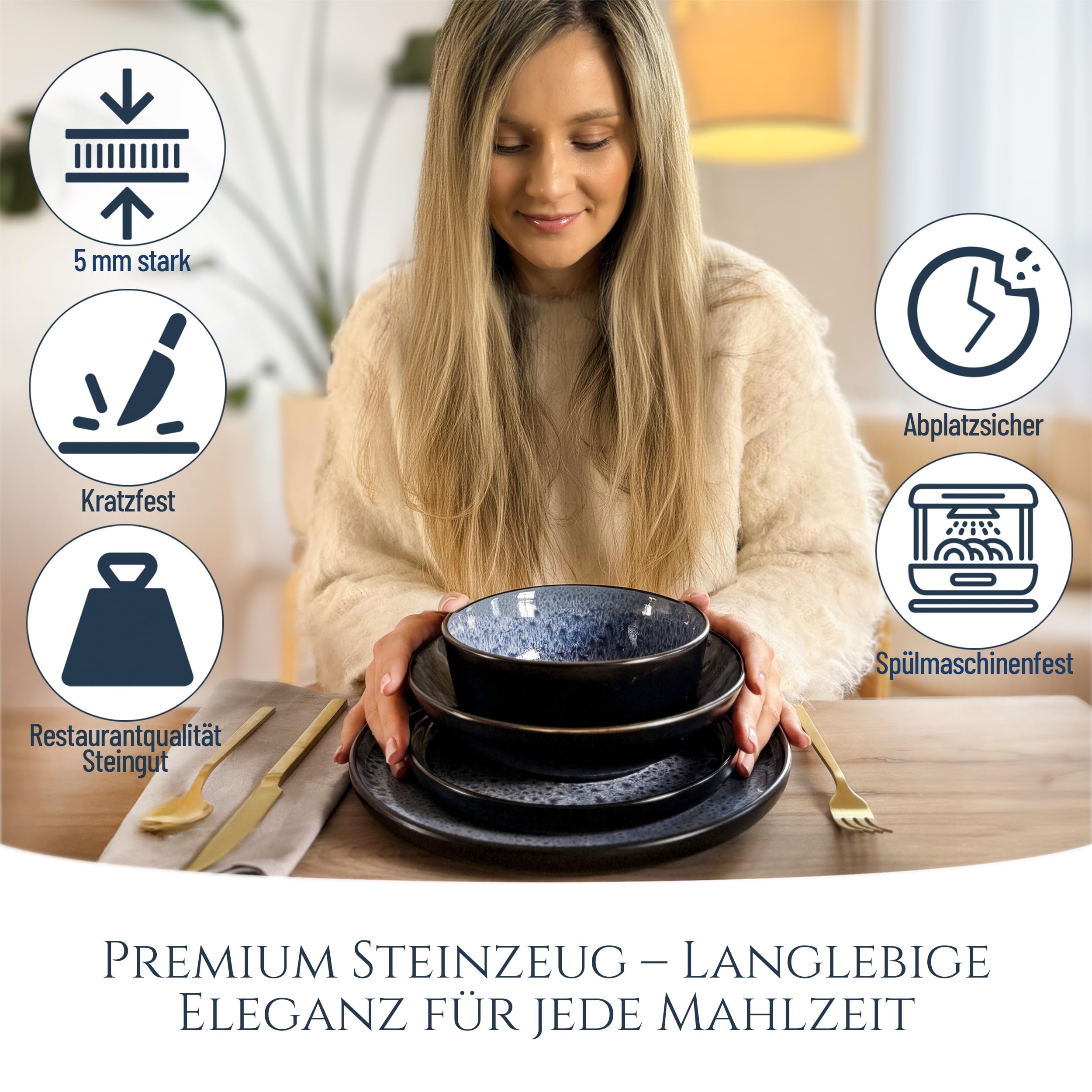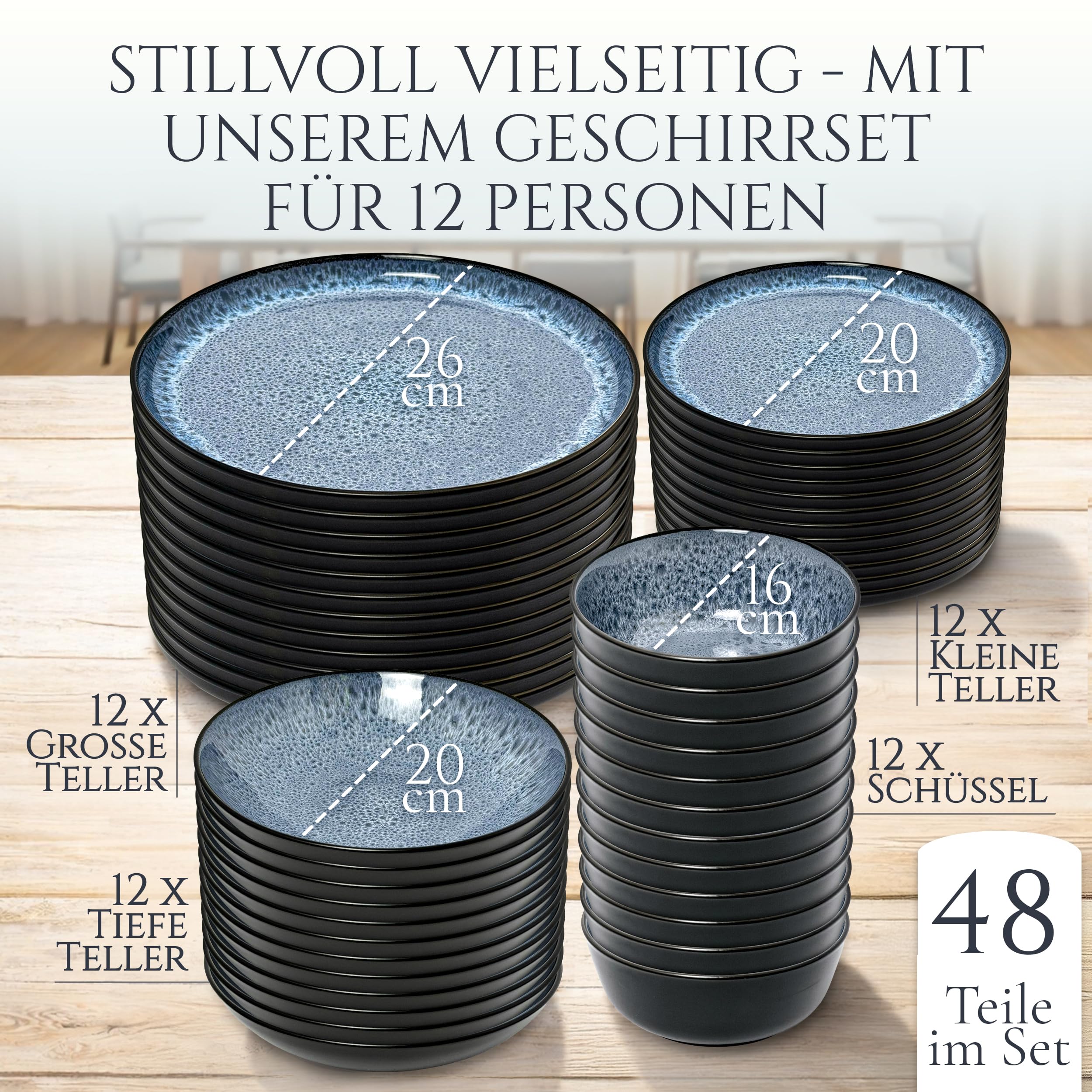 - ✅ ZEITLOS, VIELSEITIG & UNVERGLEICHLICH STYLISH: Ein einzigartiges Geschirr Set für 12 Personen, das mit seiner Farbe zum hippen Highlight wird! Warmes Grau-Blau & cooles Matt-Schwarz - ein Speiseservice, das lässige Vibes versprüht