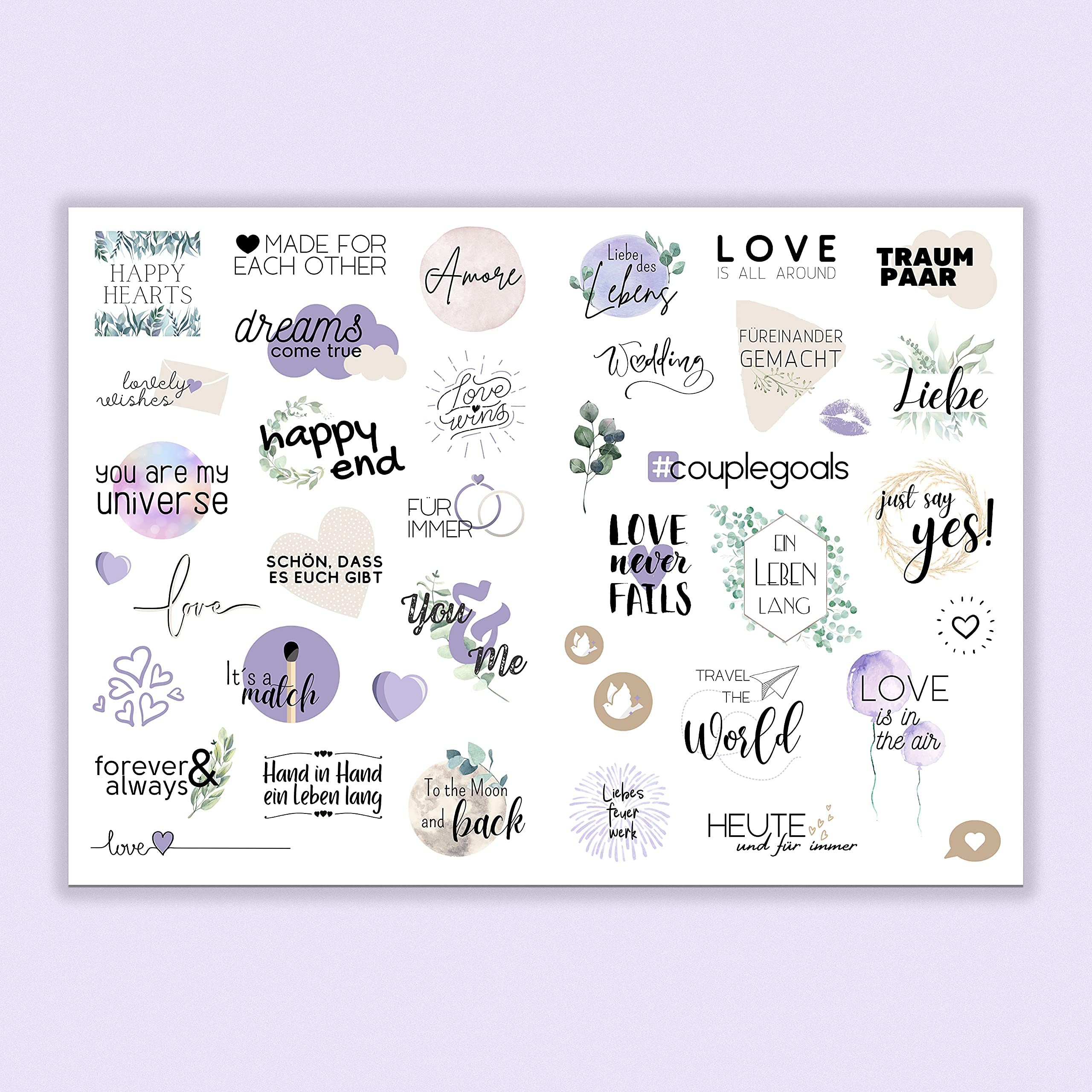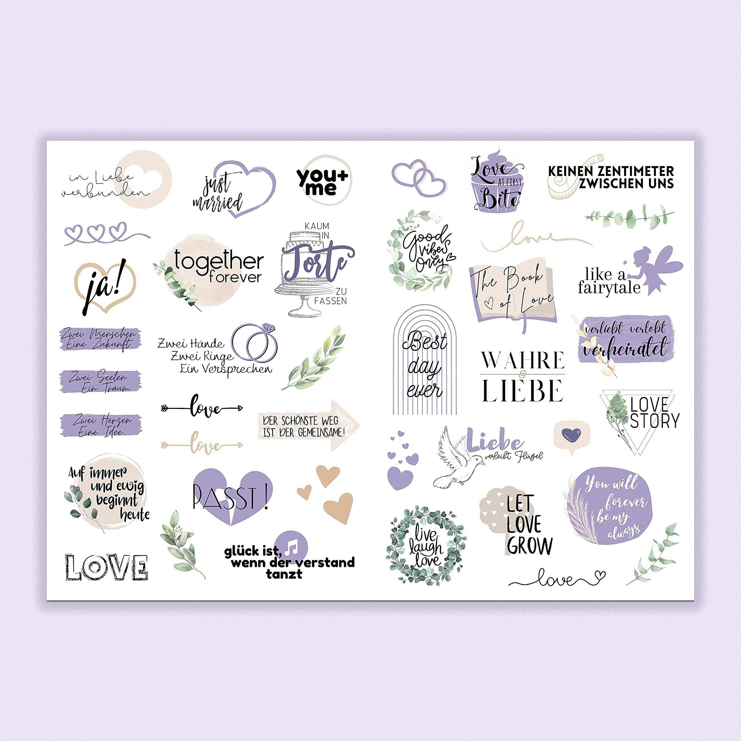 Sticker Hochzeit Gästebuch (164 Motive) - Vintage Hochzeit Aufkleber für Gästebuch oder Fotoalbum mit viel Liebe - Love Stickers für Scrapbook oder Bullet Journal - Wedding Deko mit Herz - Lavendel