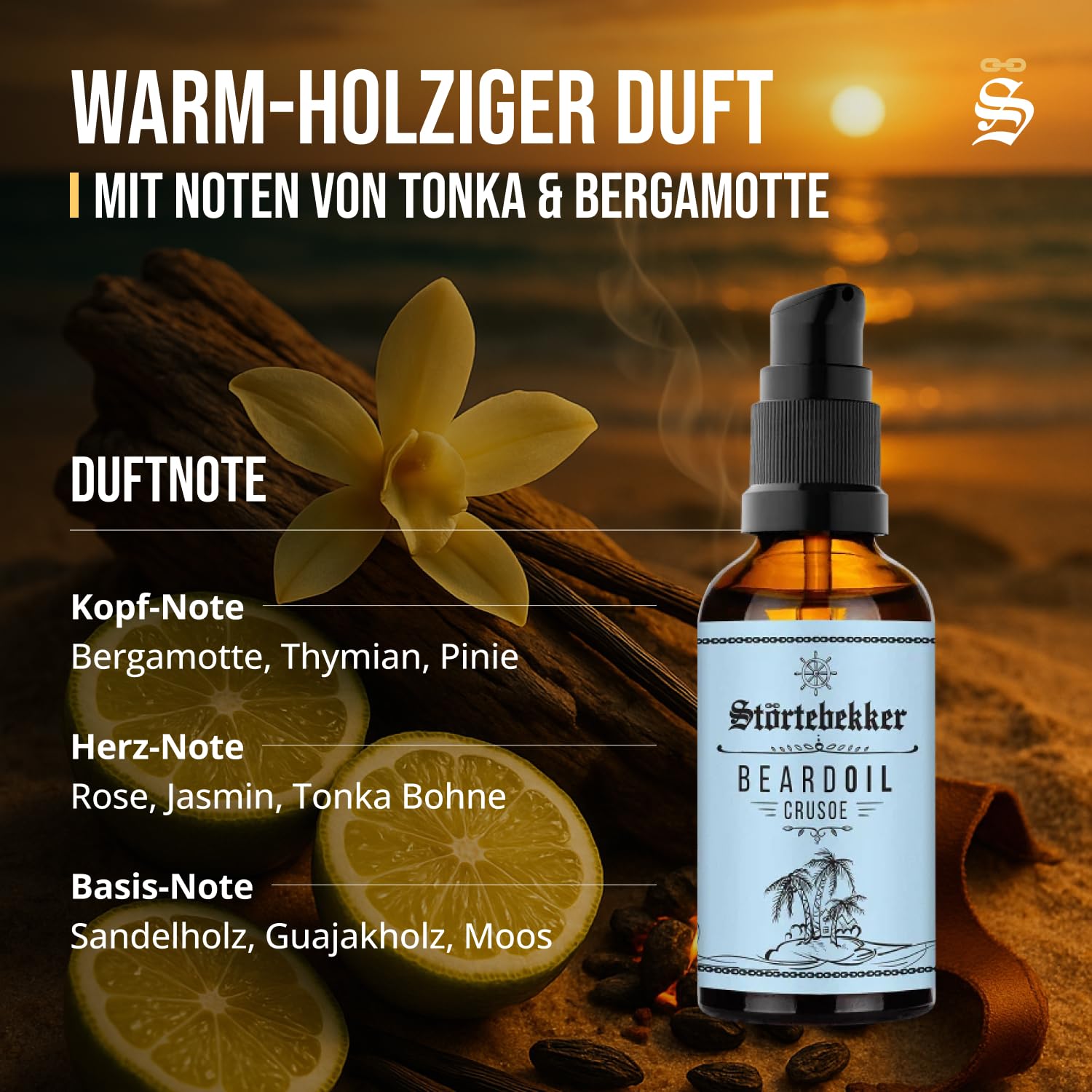 Störtebekker® Premium Bartöl Crusoe - tägliche Bartpflege für 3-Tage-Bart bis Vollbart - 50ml Beard Oil Vegan - Bart Öl Herren mit angenehmen Duft - Hochwertige Inhaltsstoffe - Made in Germany