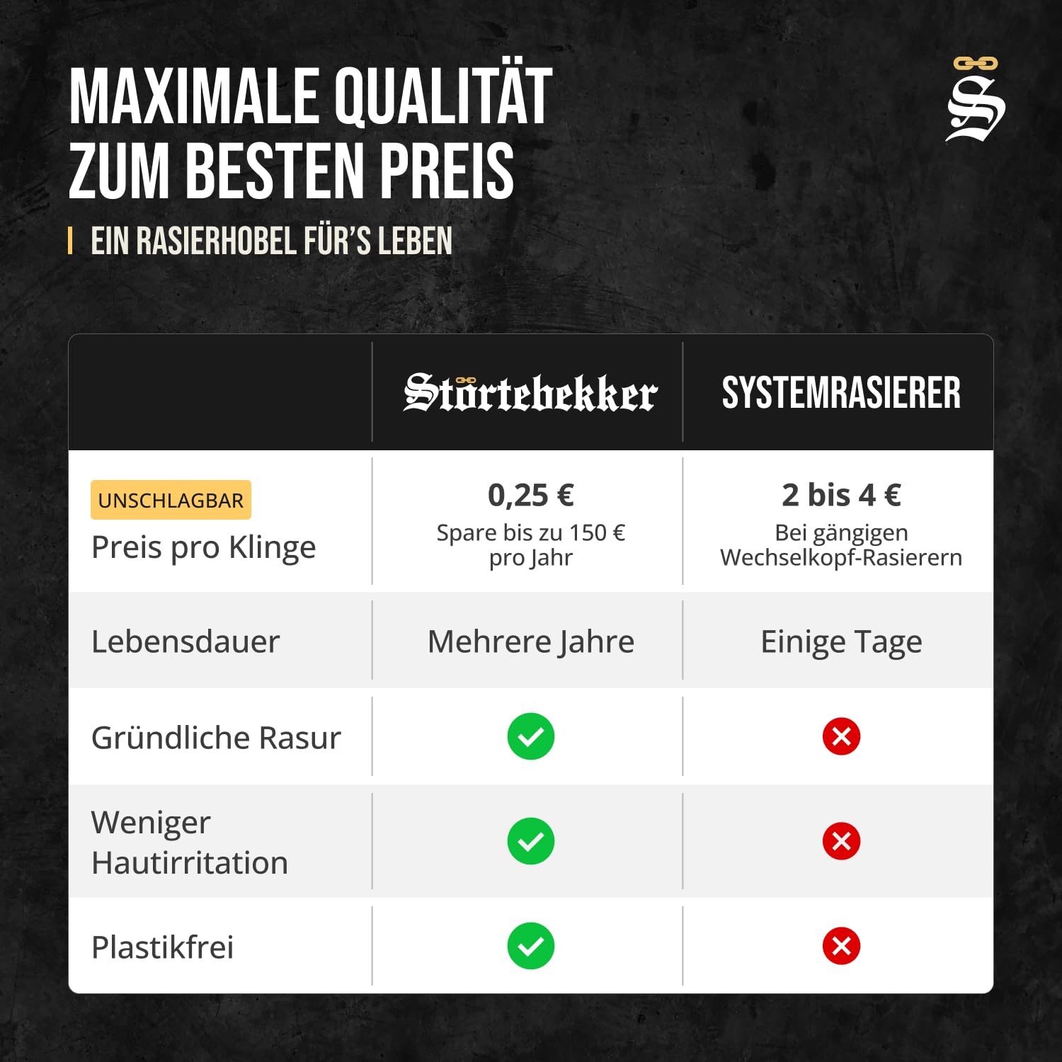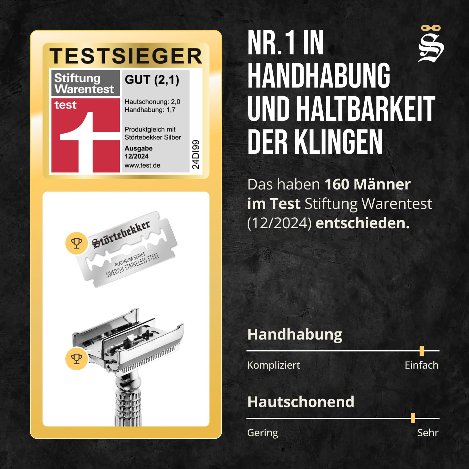 • ✓ TESTSIEGER 2024: Stiftung Warentest hat unseren Störtebekker Rasierhobel 'Hamburg' 2024 zum Testsieger ernannt! In der Ausgabe 12/2024 (24DI99) gab es in der Kategorie Handhabung eine 1,7 und bei Hautschonung eine glatte 2,0. Überzeug Dich jetzt selbst vom Testsieger!