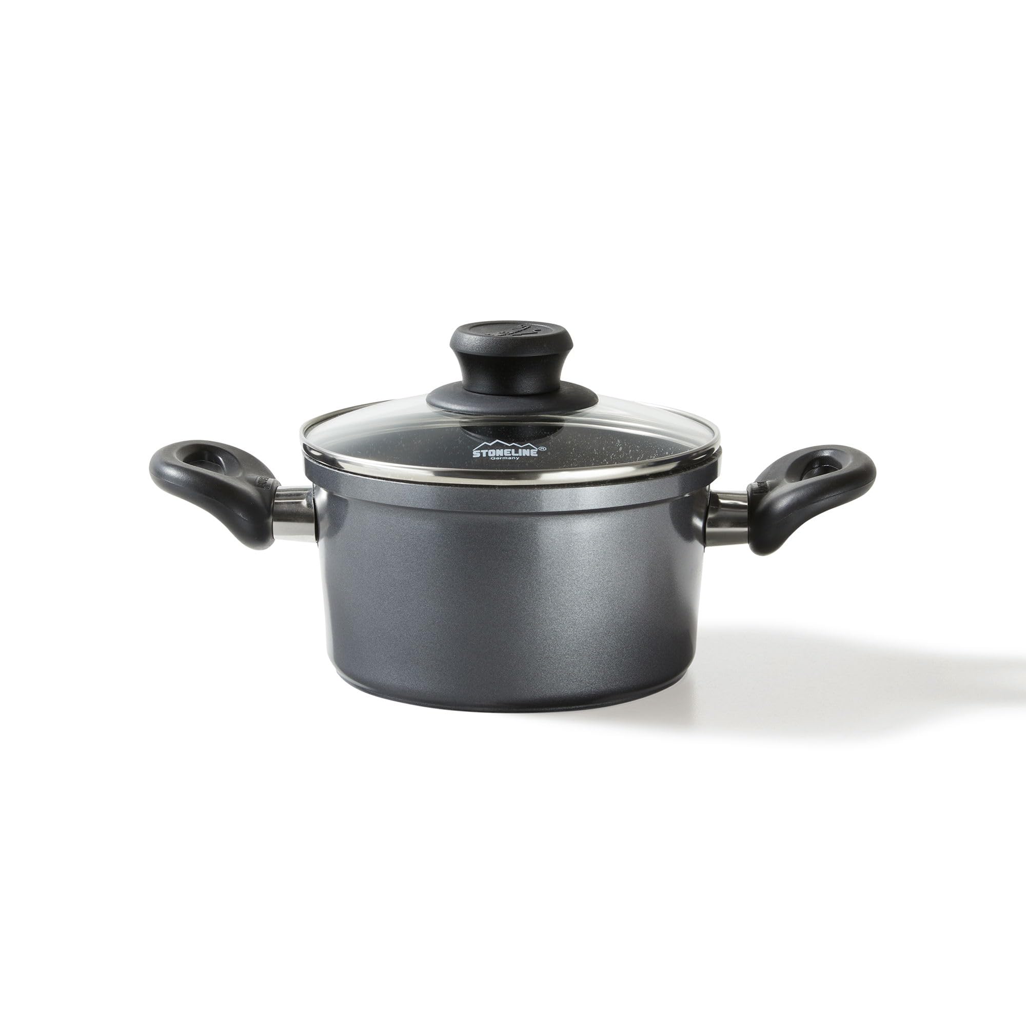 STONELINE Aluguss Kochtopf 16 cm, Kleiner Topf mit Deckel 1,6 L, Antihaft beschichtet mit echten Steinpartikeln, Kochtopf Induktion 16 cm, für alle Herdarten, Backofen, Kochen ohne Fett oder Öl, Grau