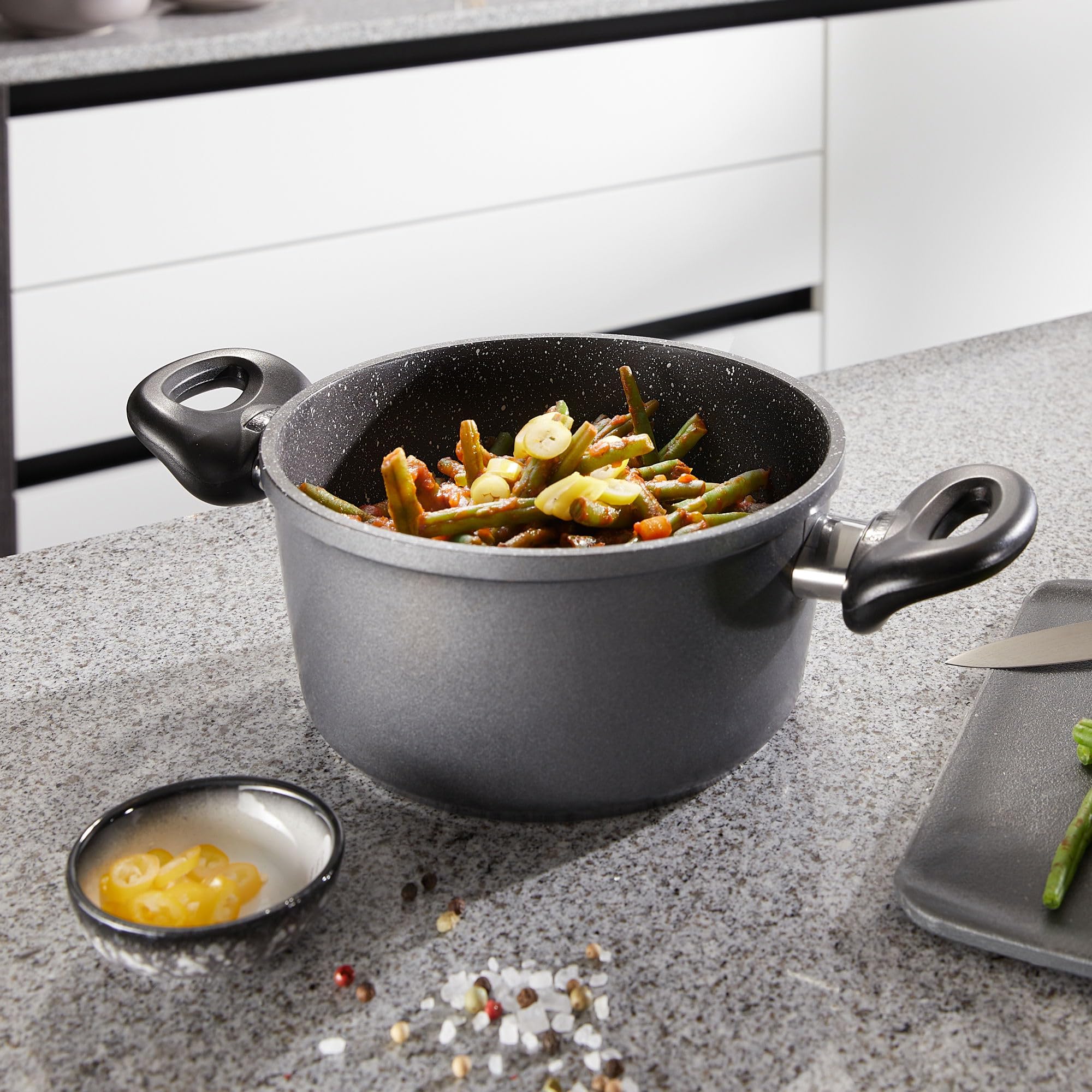 Dank der speziellen STONELINE®-Antihaftbeschichtung lassen sich Ihre Speisen – je nach Wunsch – mit oder ohne Bratfett und Öl zubereiten und ganz ohne Ankleben aus dem Kochgeschirr lösen.