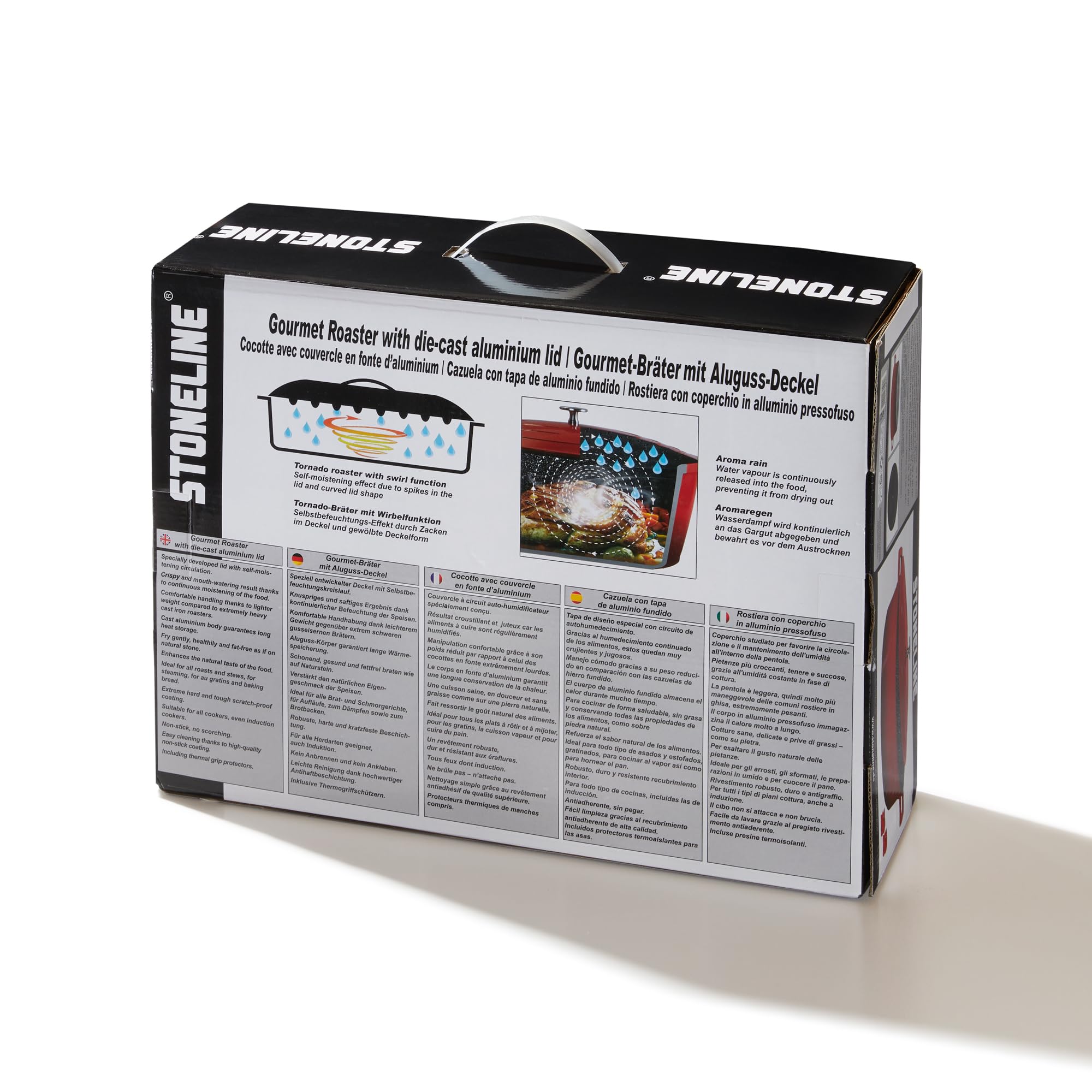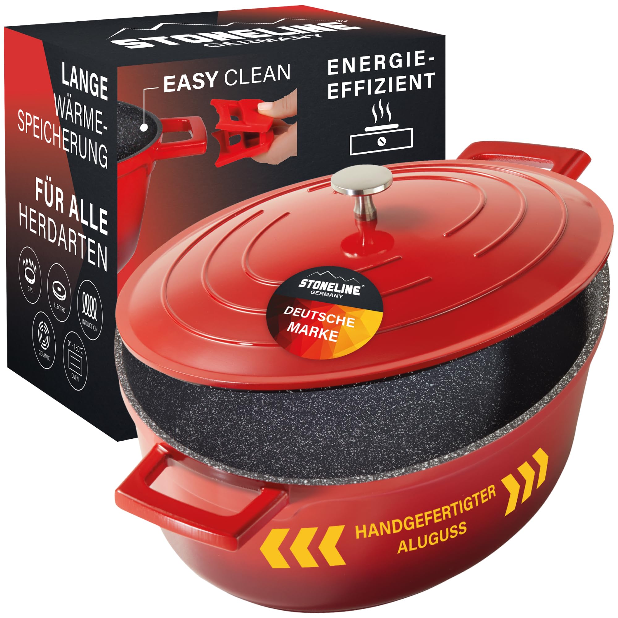 Stoneline - Das Original! Der Bräter ist mit der speziell entwickelten Stoneline Antihaftbeschichtung beschichtet. Diese ermöglicht ein Kochen und Braten ganz ohne Fett & Öl. Somit lassen sich Ihre Speisen ganz einfach aus dem Bräter mit Deckel lösen. Natürlich können Sie den Schmortopf Induktion auch mit Öl verwenden. Erleben Sie mit Stoneline Bräter & Schmortöpfe den besten Geschmack, denn die einzigartige Beschichtung ist mit echten Steinpartikeln ausgestattet, wodurch Sie ein Kocherlebnis wie auf heissem Stein erleben. Der beschichtete Topf ist mit der weltweit einzigen Antihaftbeschichtung mit echten Steinpartikeln beschichtet, welche sich besonders durch Ihre Kratzfestigkeit auszeichnet. Die Bräter Induktion sind super leicht zu reinigen und verfügen über einen extra, starken verzugsfreien Boden (Bodenstärke 4,5 mm). Nutzen Sie den Kochtopf aus Aluguss für alle Herdarten, auch Induktion oder im Backofen bis 240 °C (ohne Thermogriffschützer) / 200 °C (mit Thermogriffschützern).