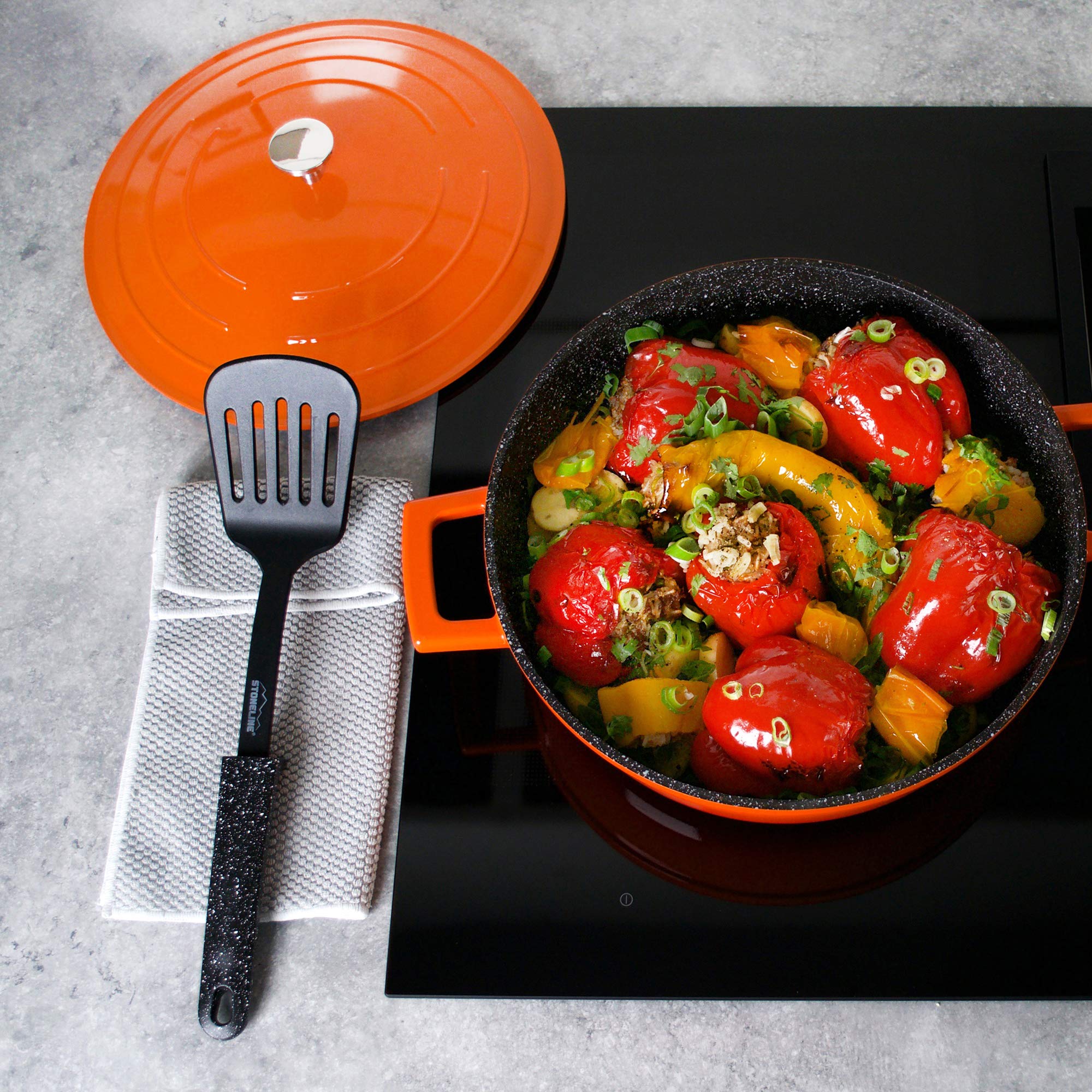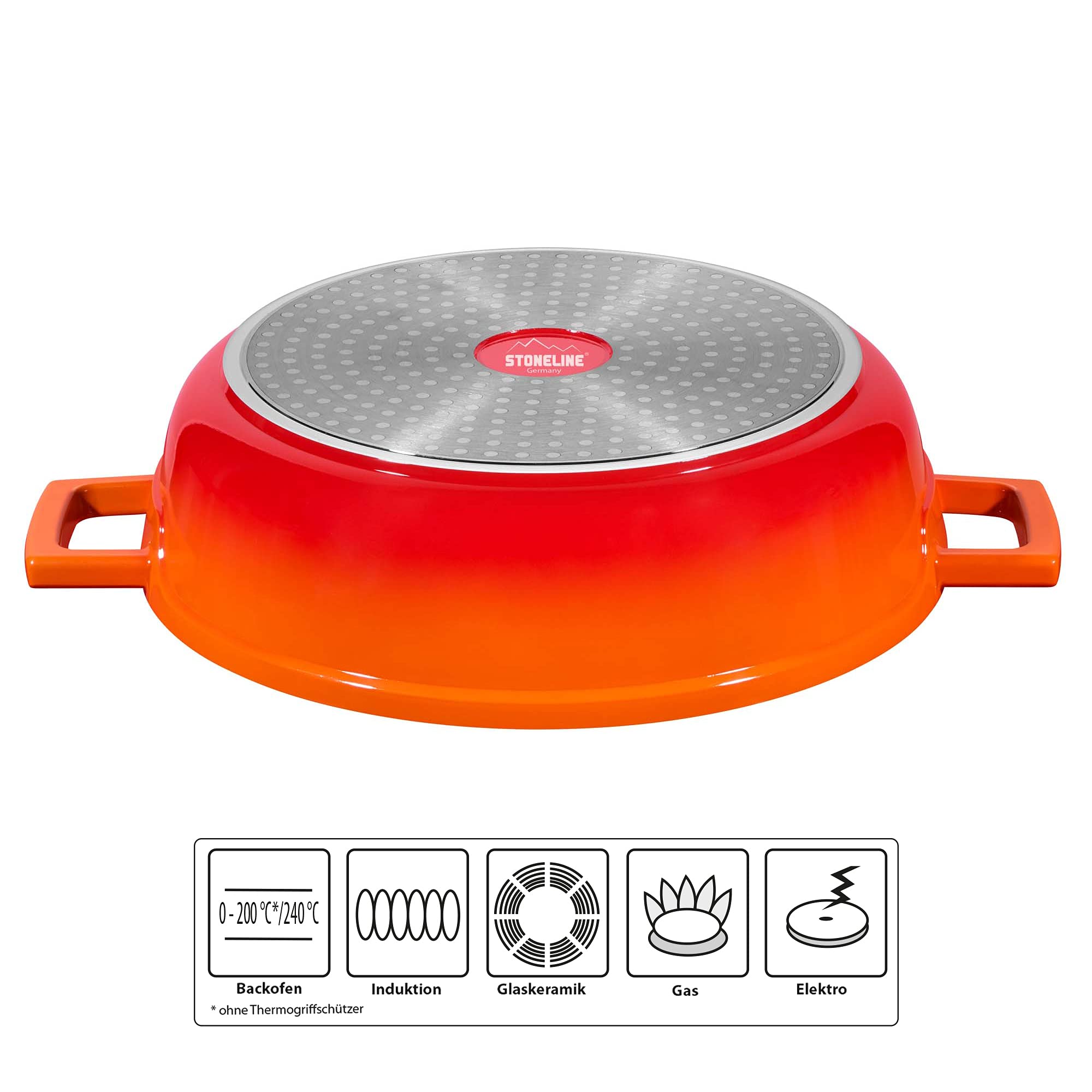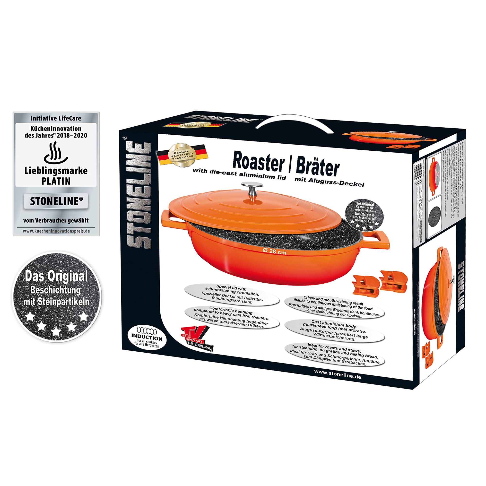 Stoneline - Das Original! Der Bräter ist mit der speziell entwickelten Stoneline Antihaftbeschichtung beschichtet. Diese ermöglicht ein Kochen und Braten ganz ohne Fett & Öl. Somit lassen sich Ihre Speisen ganz einfach aus dem Bräter mit Deckel lösen. Natürlich können Sie den Schmortopf Induktion auch mit Öl verwenden. Erleben Sie mit Stoneline Bräter & Schmortöpfe den besten Geschmack, denn die einzigartige Beschichtung ist mit echten Steinpartikeln ausgestattet, wodurch Sie ein Kocherlebnis wie auf heissem Stein erleben. Der beschichtete Topf ist mit der weltweit einzigen Antihaftbeschichtung mit echten Steinpartikeln beschichtet, welche sich besonders durch Ihre Kratzfestigkeit auszeichnet. Die Bräter Induktion sind super leicht zu reinigen und verfügen über einen extra, starken verzugsfreien Boden (Bodenstärke 4,5 mm). Nutzen Sie den Kochtopf aus Aluguss für alle Herdarten, auch Induktion oder im Backofen bis 240 °C (ohne Thermogriffschützer) / 200 °C (mit Thermogriffschützern).