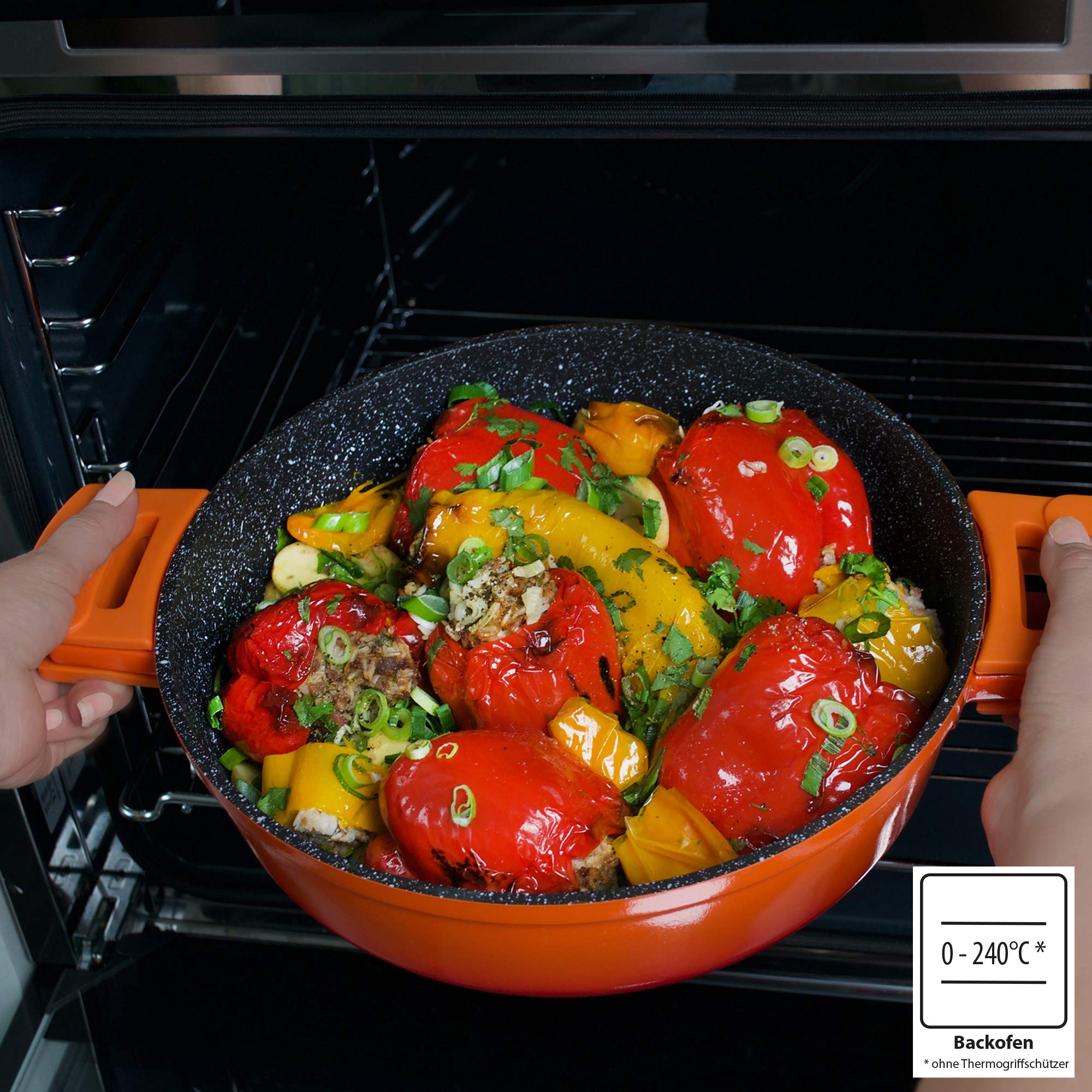 STONELINE Cocotte Bräter mit Deckel Induktion 28 cm, 4,2 L, Aluguss Topf beschichtet mit echten Steinpartikeln, Bratentopf Schmortopf mit Deckel Backofengeeignet, für alle Herdarten, Farbe: Ofenrot