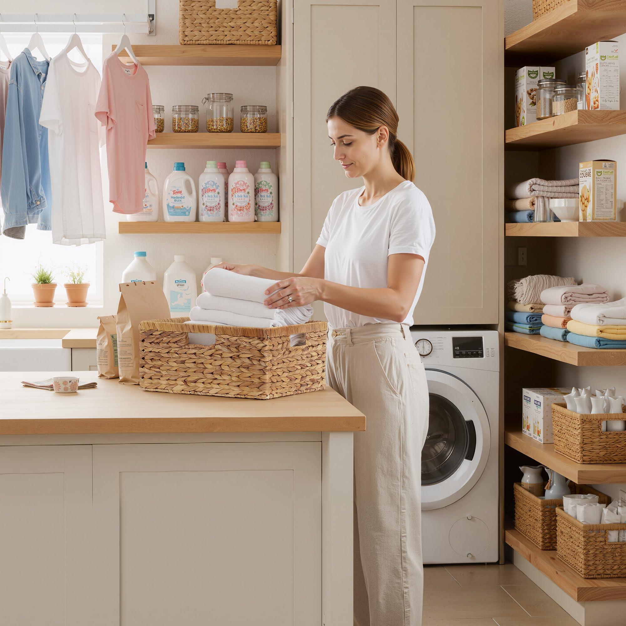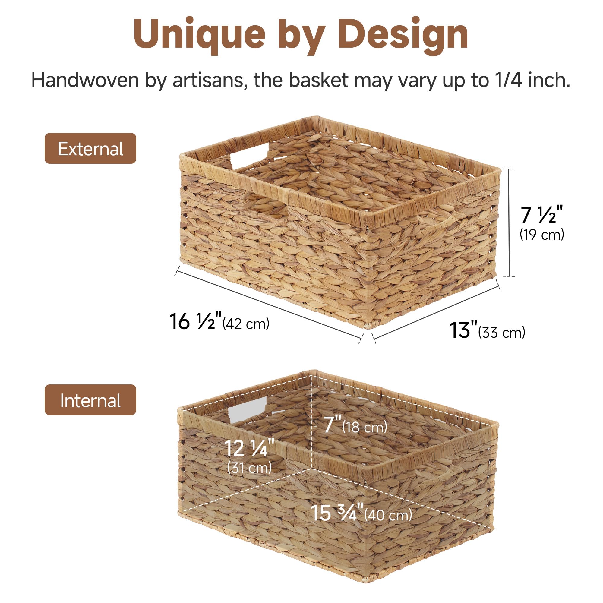 StorageWorks extra grosse Aufbewahrungskörbe aus Wasserhyazinthe, moderne Aufbewahrungskörbe geflochten, platzsparende Körbe, Wasserhyazinthenkörbe geflochten mit eingebauten Griffen, Woven Water Hyacinth Basket, Wicker Hamper Basket with Handle, Large Storage BasketsUmweltfreundlich: Die StorageWorks extra grosse Weidenkorb geflochten eckig wird aus 100 % natürlichen, erneuerbaren Wasserhyazinthen von Hand gefertigt. Sie spiegeln nicht nur den Respekt vor der Natur wider, sondern verleihen ihnen auch einen einzigartigen Charme.Multifunktionaler Stauraum: Der grosse Wasserhyazinthe Aufbewahrungskorb geflochtene mit den Massen 42 × 33 × 19 cm eignet sich perfekt zur Aufbewahrung von Spielkonsolen, Badetüchern und Spielzeug und fügt sich perfekt in verschiedene Umgebungen wie Schreibtisch, Büro und Bad ein.Langlebig: Dieser geflochtene flechtkörbchen Aufbewahrungsbox ist aus hochwertigen, strapazierfähigen Naturmaterialien gefertigt und mit einem Metallrahmen versehen. Der geflochtene rechteckige Wasserflaschenkorb ist äusserst atmungsaktiv und schützt die darin aufbewahrten Gegenstände wirksam vor Feuchtigkeit und Beschädigungen.Bequemlichkeit: Dieser Weidenkorb ist leicht, kompakt und verfügt über einen integrierten, verstärkten Griff, der bequem in der Hand liegt und das Tragen erleichtert. Das offene Design ermöglicht einen einfachen Zugriff und erhöht den Komfort im Alltag erheblich.Exquisite Handwerkskunst: Geflochtene Körbe gross sind einzigartige Kunstwerke, die nicht nur zur Aufbewahrung dienen, sondern auch als Dekoration verwendet werden können und Ihrem Zuhause eine warme Atmosphäre verleihen. Ob im Wohnzimmer, Schlafzimmer oder auf dem Balkon – sie sind immer ein Blickfang.