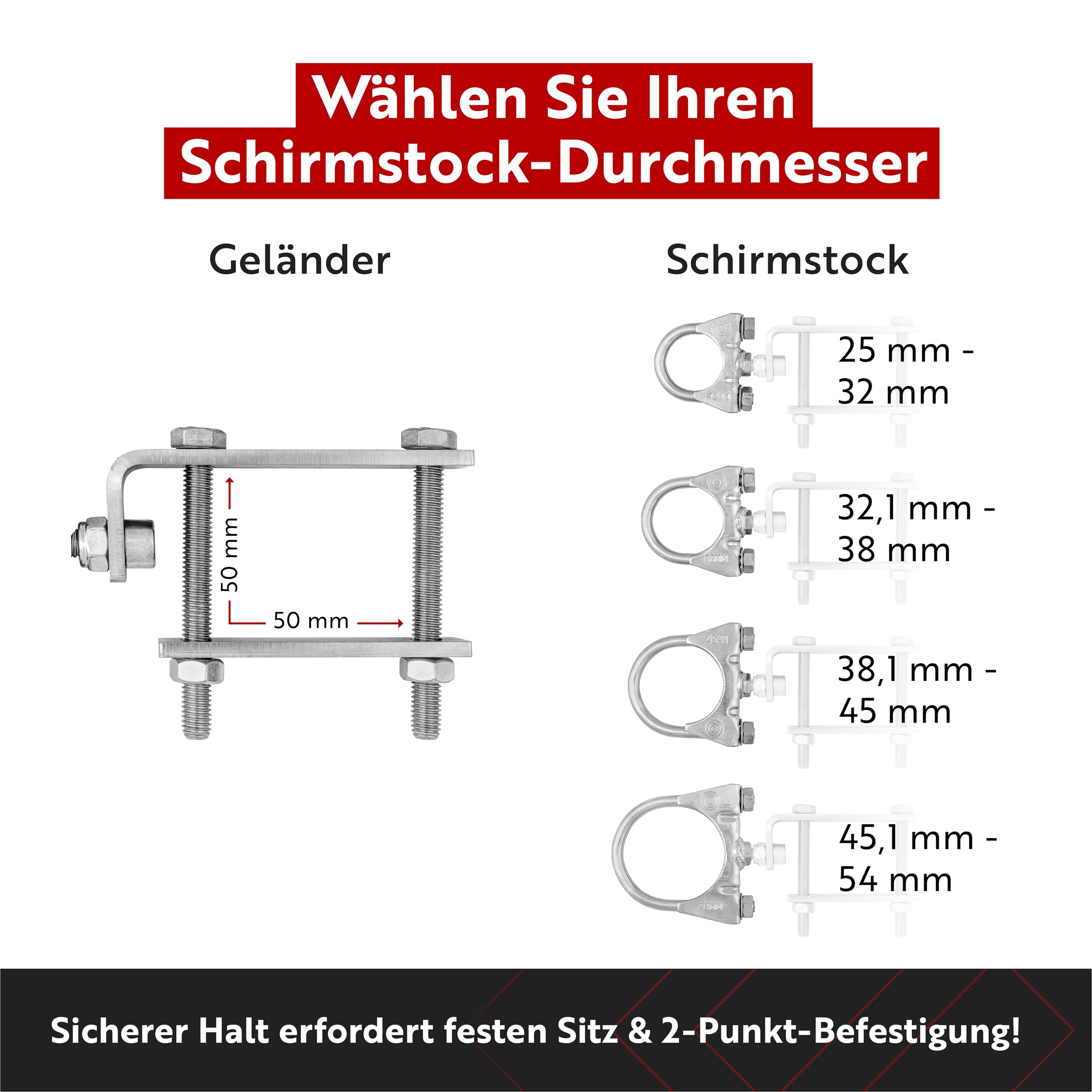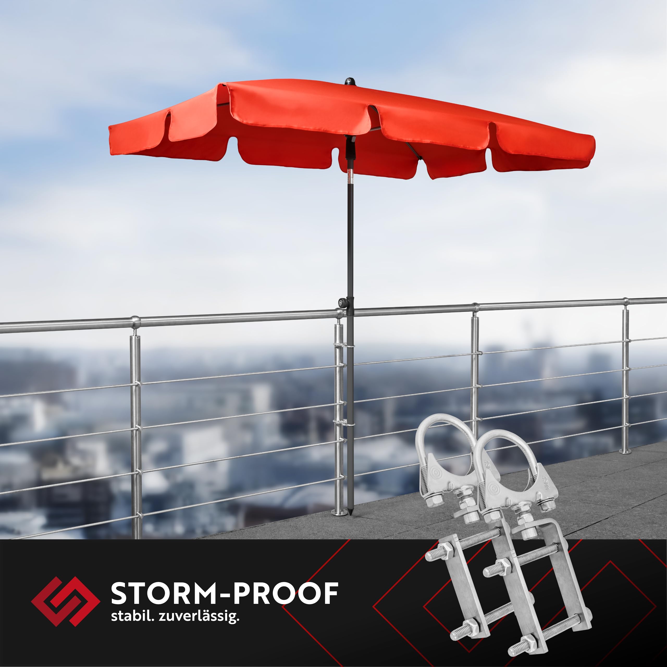 Die STORM-PROOF Sonnenschirmhalter halten den Schirm sicher an zwei Befestigungspunkten am Geländer fest. Damit steht Dein Sonnenschirm kerzengerade und absolut sicher befestigt, auch wenn es windig ist.