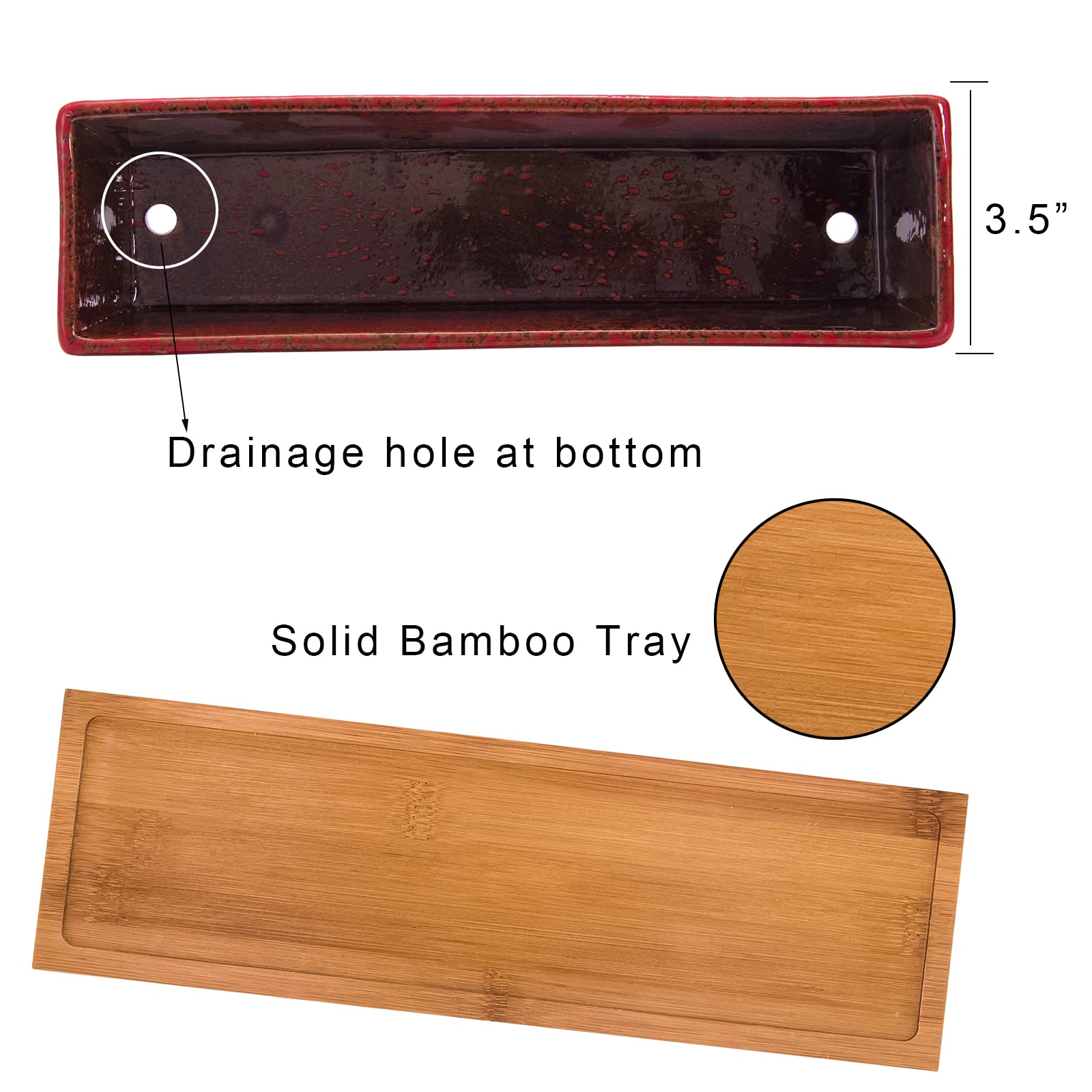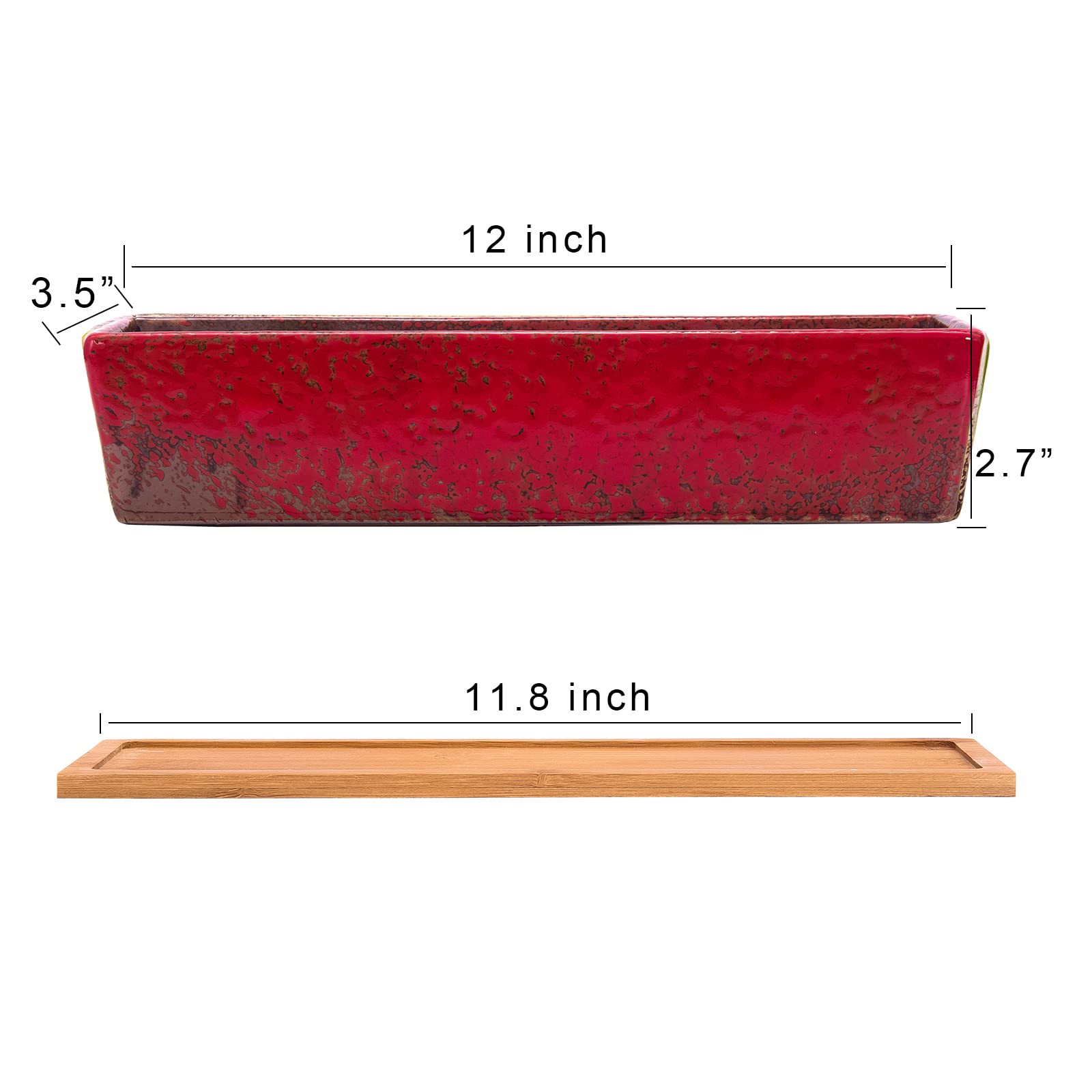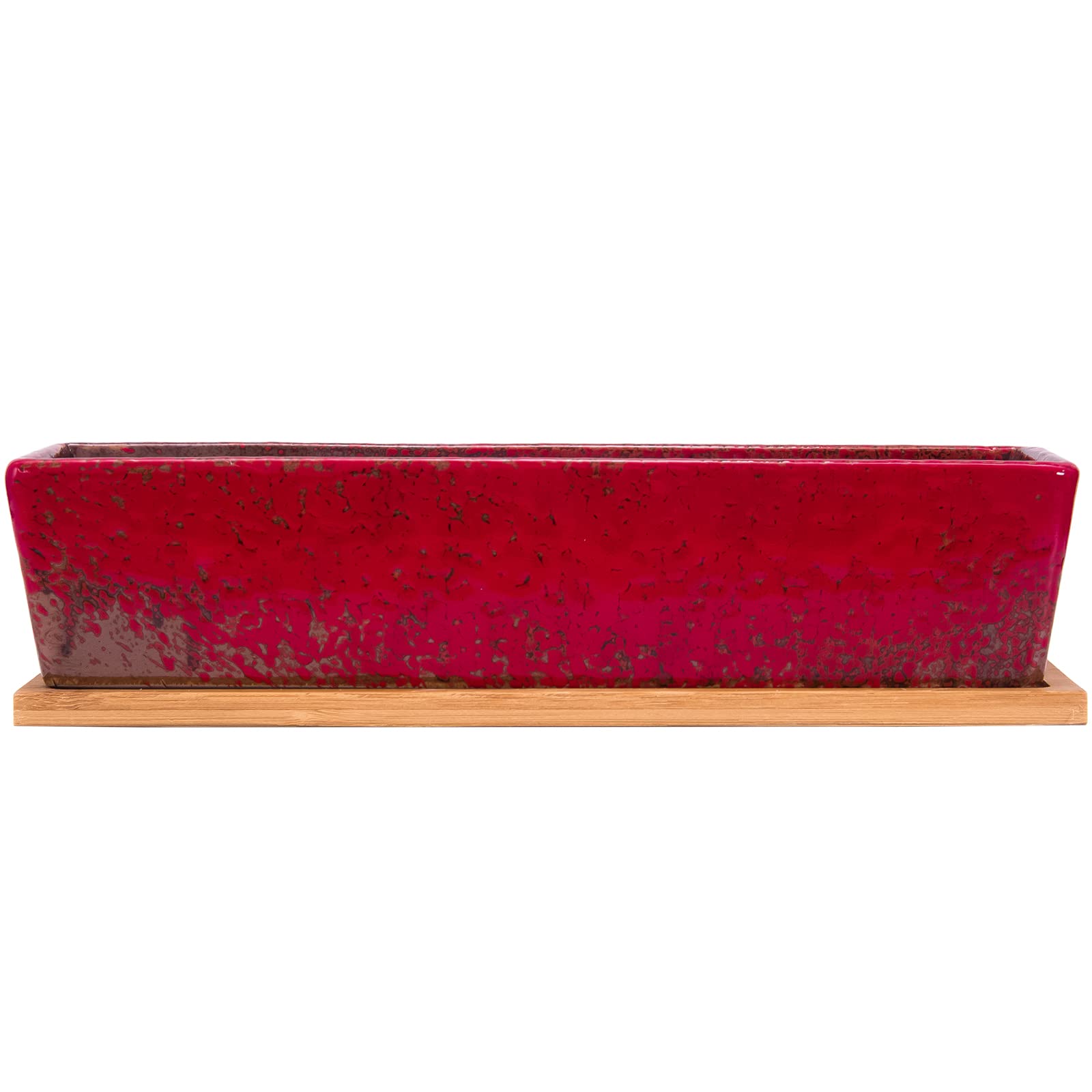 ARTKETTY Sukkulententöpfe, Lange rechteckige Sukkulenten-Übertöpfe mit Drainage-Bambusschalen, aus Keramik, Flacher Bonsai-Fensterkasten, Hausgartendekoration, 30,5 cm, Rot