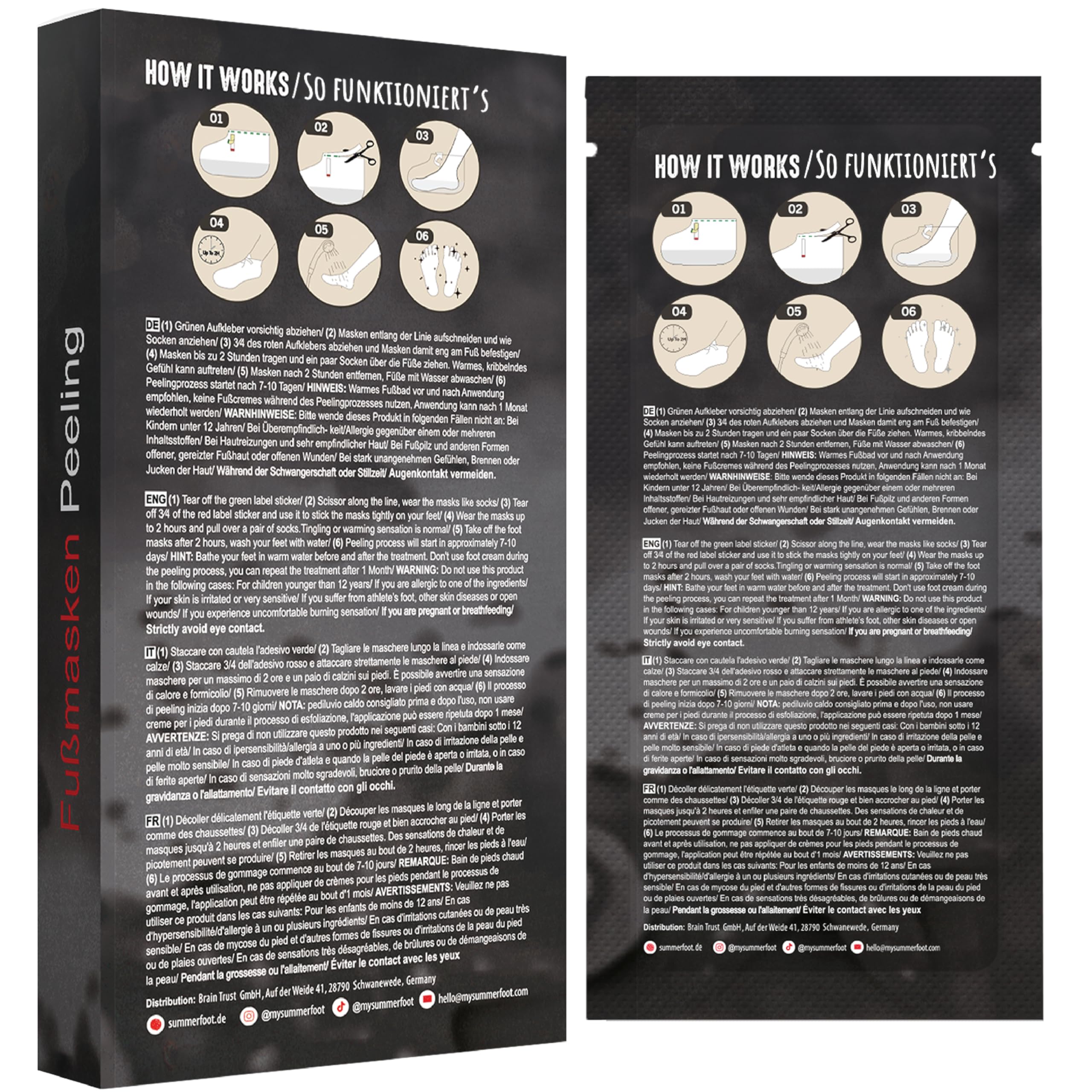 Die Summer Foot Premium Fussmasken bestehen aus einem speziellen Wirkstoffgel, das sanft die alte Fusshaut löst. Nach nur 5-7 Tagen lösen sich die abgestorbenen Hautzellen und hinterlassen ein samtweiches, glattes Fussbild. Bei sehr starker Verhornung kann der Peelingprozess bis zu 14 Tage dauern. Im Vergleich zu herkömmlichen Methoden wie cremen, hobeln oder rubbeln bietet die Summer Foot Methode eine einfachere und effektivere Lösung für geschmeidige Füsse.