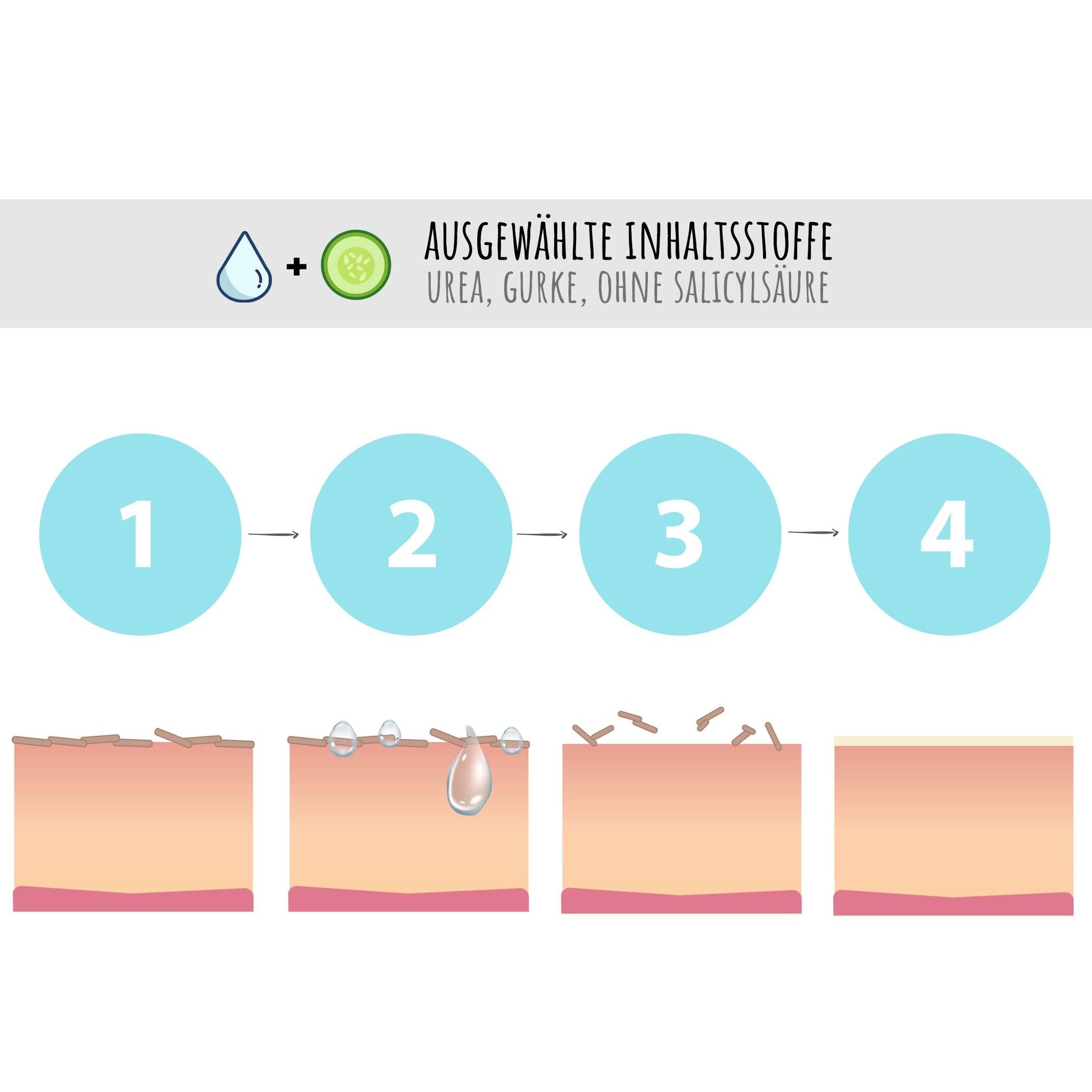 - Einmalige Anwendung: Löst sich die alte Haut nach 5–7 Tagen ab und hinterlässt babyzarte Füsse.