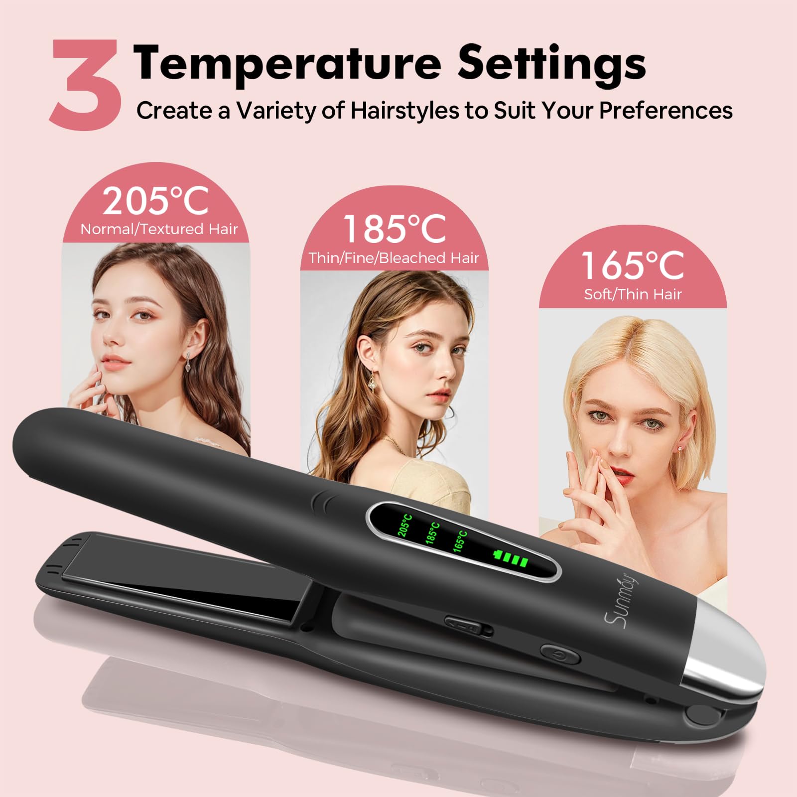 Mit 3 einstellbaren Temperaturstufen laesst sich das Styling individuell an verschiedene Haartypen anpassen – von feinem bis kraeftigem Haar. Das kabellose Design bietet maximale Bewegungsfreiheit und ermoeglicht flexibles Styling ohne Steckdose.