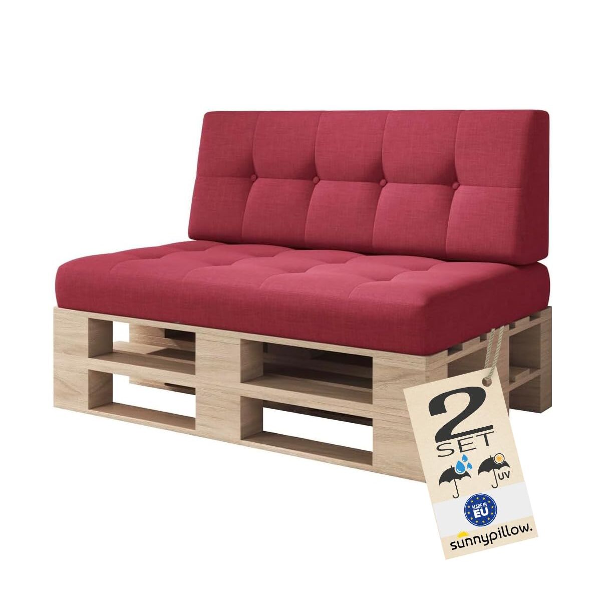 sunnypillow Palettenkissen Outdoor, UV-lichtecht, wasserdicht - 2er Set - Palettenauflage für Palettensofa für Haus und Garten - Palettenpolster für Palettenmöbel - Rückenkissen & Sitzkissen Rot