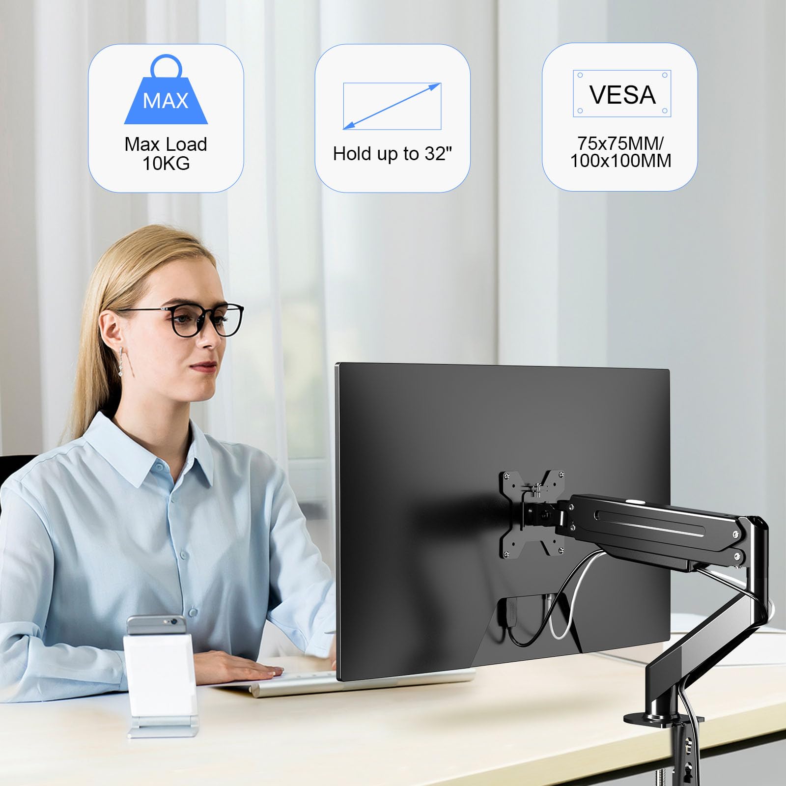 suptek Monitor Halterung Höhenverstellbarer Gasfeder-Monitorarm für 17-32 Zoll Bildschirme, VESA 75/100 mm, bis zu 10 kg, Ergonomischer Bildschirmhalterung 1 Monitor Einarm-Desktop- Monitorhalterung