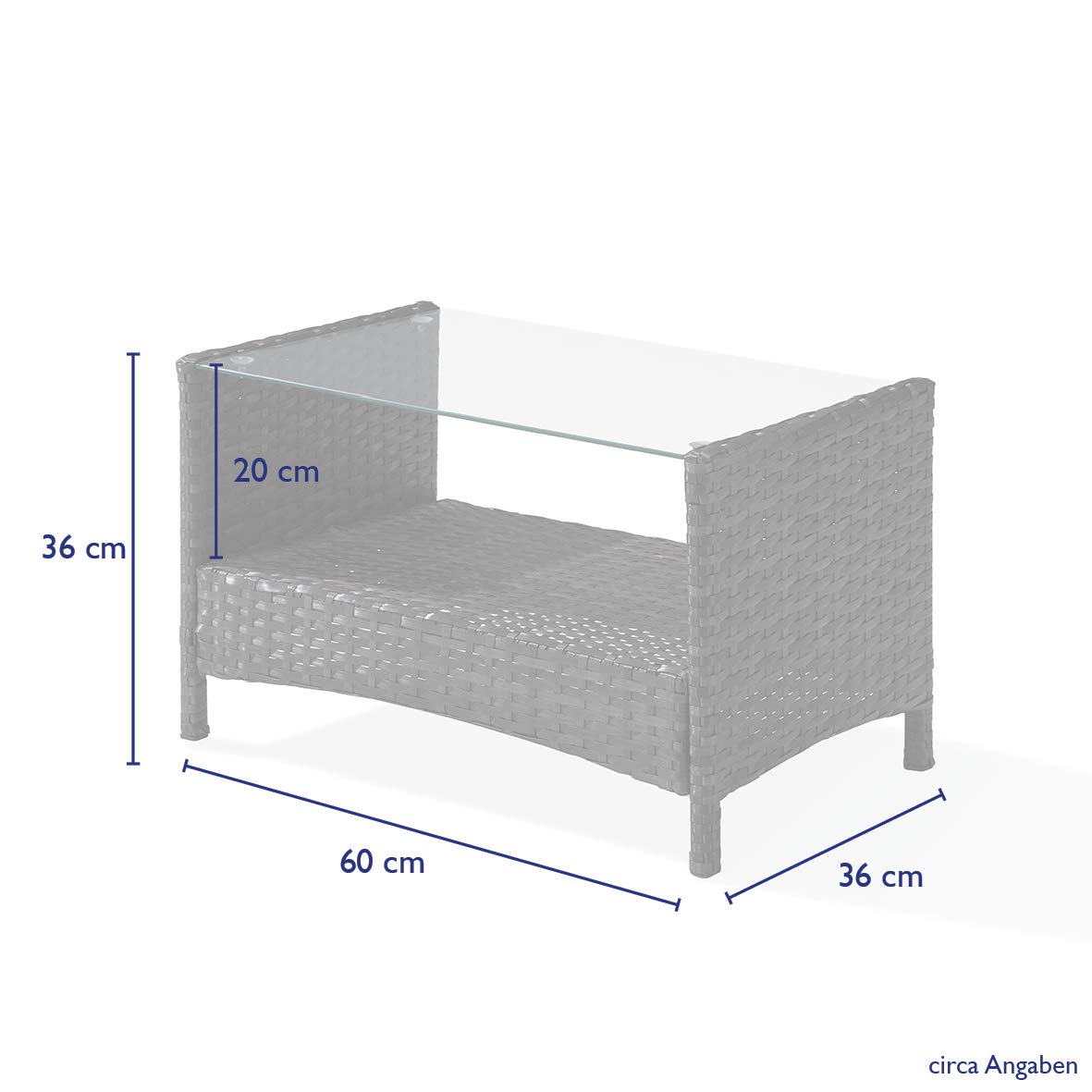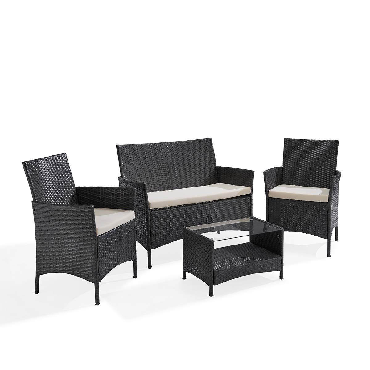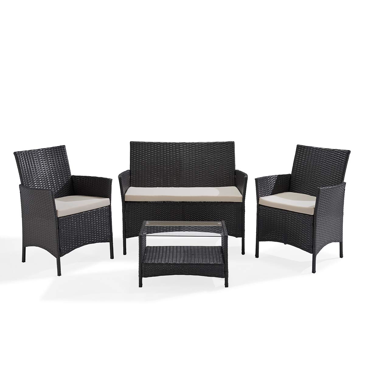Produktdetails:1 x Tisch mit Glasplatte: ca. 60 x 36 x 36 cm2 x Einzelsessel inkl. Kissen : ca. 59 x 58 x 84 cm 1 x Doppelsofa inkl. Kissen: ca. 106 x 59 x 84 cmFarbe: GrauKissenfarbe: BeigePollyrattan: langlebiges, umempfindliches Material, wetterfest und UV-beständigKissenbezüge aus pflegeleichtem Polyester – mit Reissverschluss, abnehmbar und waschbarGewicht: ca. 25 kg
