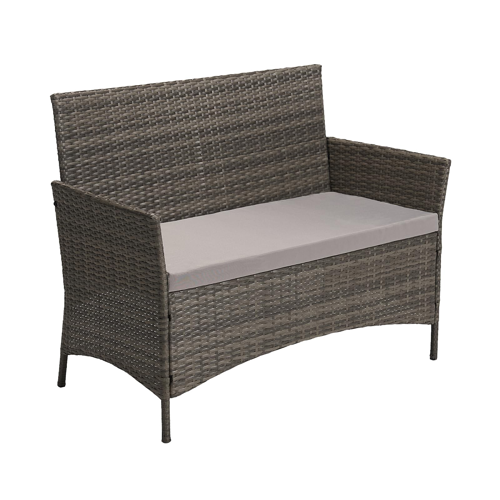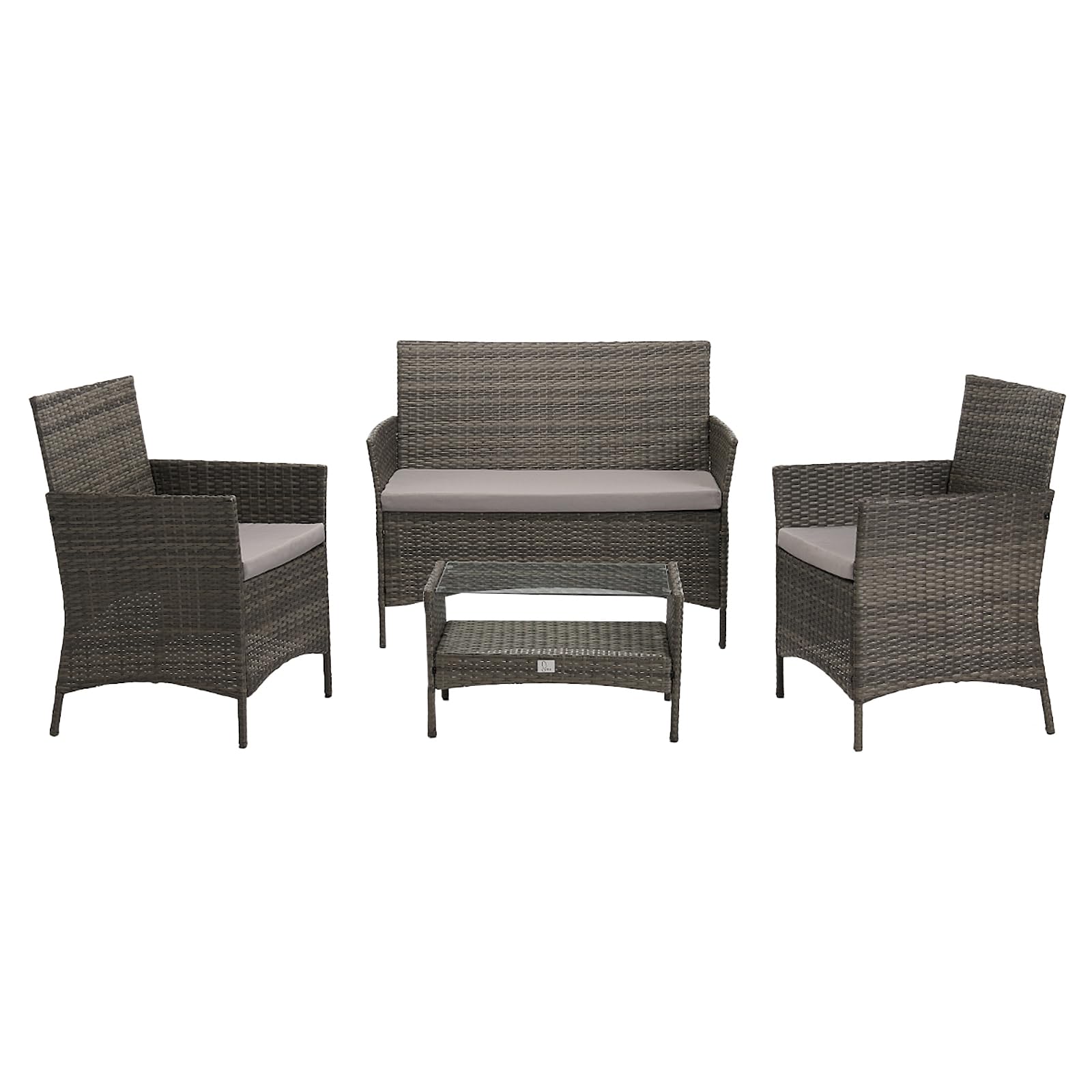 Produktdetails:1 x Tisch mit Glasplatte: ca. 60 x 38 x 36 cm2 x Einzelsessel inkl. Kissen : ca. 57 x 58 x 82 cm 1 x Doppelsofa inkl. Kissen: ca. 106 x 58 x 82 cmFarbe: GrauKissenfarbe: GrauPollyrattan: langlebiges, umempfindliches Material, wetterfest und UV-beständigKissenbezüge aus pflegeleichtem Polyester – mit Reissverschluss, abnehmbar und waschbarGewicht: ca. 25 kg